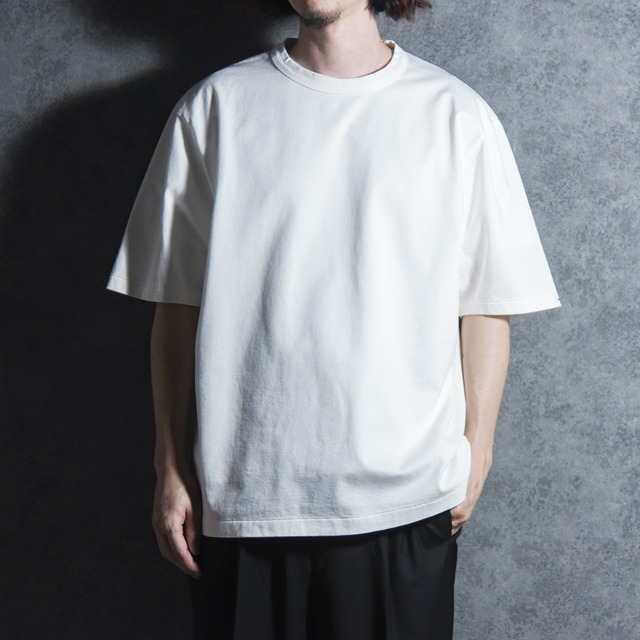 SHUREN(シュレン)よりハーフスリーブTシャツのご紹介。 素材には、30番手の特殊な紡績方法、毛羽たちを抑えたドライタッチな糸を使用。 度目を詰めて綺麗な目面で編み上げてた生地を製品加工で通常の約3倍ほど編地を縮めることで、美しい表情の中に独特な凹凸を生み出し、奥行きのある表面感が特徴の一着。 縫製には、身頃や袖付けなど部位ごとに2種類のロック縫製を使い分け、縫い代の幅や硬さを調整することで、生地の落ち感と柔らかな印象が際立つシルエット。 裾はクラフト感のあるシングルステッチで丁寧に仕上げられています。 一見シンプルなTシャツながら、計算された仕様や細部の工夫が、独自の存在感を放つ、新しいスタンダードを感じさせる一着です。 【SHUREN】 シュレンでは、日本に古来から根付く侘び寂びの美意識のように、完璧さではなく不完全さの中にある余韻、時の移ろいが生み出す美しさを大切にしている。 「服は、ただの『もの』ではなく、それを着る人々の心に温もりや感動を与える存在である」という価値観を持ち続け、職人の技術や人とのつながりを重視。職人技の光るミニマルなウェアを中心に、ひとつひとつのアイテムに物語と温かさを込め、時代を超えて愛される普遍的なワードローブを提案する。 (Designer Profile) 文化服装学院を卒業した後、セレクトショップやドメスティックブランドでデザイナー・パターンナーを務める。2026年春夏シーズンから自身のブランドSHURENをスタートさせる。 【color】 White 【material】 Cotton 100% 【country of origin】 日本製 【size spec 】 サイズ 4 着丈 約72cm 身幅 約59cm 肩幅 約51cm 袖丈 約28.5cm サイズ 5 着丈 約75cm 身幅 約62cm 肩幅 約54cm 袖丈 約29cm 【model】 173cm 60kg(4サイズ着用) --返品・交換に関して-- 商品にご満足いただけなかった場合、お届け後3日以内に当店までご連絡いただければ、返品・交換を承ります。 なお、商品は返送後に未使用であると当店が判断でさせて頂いた場合のみ返品・交換を受け付けます。 サイズ交換など、お客様都合による返品の場合は、往復送料はお客様負担となります。 商品到着後、お手数ですが商品状態をご確認いただき、写真との相違、不良品等がある場合は下記、メールアドレスまでお早めにご連絡ください。 [email protected] ーー配送に関してーー ご注文いただいてから3営業日以内を目処に発送いたします。(土日祝日、年末年始(12/29〜1/3)の発送は行っておりません。) ※1)送料に関しましてはシステム上、個別設定ができないため全国一律800円を頂戴しております。 税込11,000円以上お買い上げで送料無料です。 ※2)配送にはヤマト運輸(株)を利用しており、宅急便だけでなく宅急便コンパクト、ネコポスでお送りさせて頂く場合もございますのであらかじめご了承下さい。 レビューを書いて下さる方には、簡単なノベルティをプレゼントします。 購入時、要望の備考欄に『ノベルティ希望』と入力の上、ご購入お願いします。