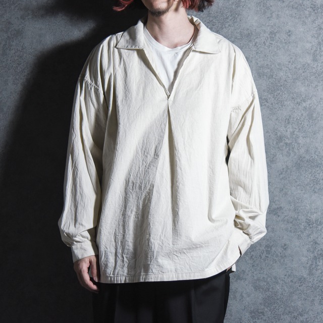 SHUREN(シュレン)よりシャンブレースリーピングシャツのご紹介。 ユーロヴィンテージのスリーピングシャツに着想を得て作成されたシャツ。 ディテールには1930年代頃のユーロヴィンテージの要素を踏襲し、袖や身頃にはたっぷりとゆとりを持たせることでリラックスしたシルエット。 パターンはすべて長方形で構成されており、着物を思わせるユニークな構造でありながら、驚くほど柔らかなラインを描きます。 袖付けには、ランダムなステッチが印象的な縫製を施し、クラフト感を感じる温かな印象の仕立て。 素材には経糸に生成り、緯糸にINDIGOとベージュで作り上げたシャンブレー生地を使用。 しっかりと打ち込まれた生地は、洗うことで程よい凹凸が生まれて豊かな表情と心地よい肌触りをお楽しみいただけます。 【SHUREN】 シュレンでは、日本に古来から根付く侘び寂びの美意識のように、完璧さではなく不完全さの中にある余韻、時の移ろいが生み出す美しさを大切にしている。 「服は、ただの『もの』ではなく、それを着る人々の心に温もりや感動を与える存在である」という価値観を持ち続け、職人の技術や人とのつながりを重視。職人技の光るミニマルなウェアを中心に、ひとつひとつのアイテムに物語と温かさを込め、時代を超えて愛される普遍的なワードローブを提案する。 (Designer Profile) 文化服装学院を卒業した後、セレクトショップやドメスティックブランドでデザイナー・パターンナーを務める。2026年春夏シーズンから自身のブランドSHURENをスタートさせる。 【color】 ECRU 【material】 COTTON 100% 【country of origin】 日本製 【size spec 】 サイズ 4 着丈 約75cm 身幅 約65.5cm 肩幅 約65.5cm 袖丈 約54.5cm サイズ5 着丈 約77.5cm 身幅 約68cm 肩幅 約68cm 袖丈 約56cm 【model】 173cm 60kg(サイズ4着用) --返品・交換に関して-- 商品にご満足いただけなかった場合、お届け後3日以内に当店までご連絡いただければ、返品・交換を承ります。 なお、商品は返送後に未使用であると当店が判断でさせて頂いた場合のみ返品・交換を受け付けます。 サイズ交換など、お客様都合による返品の場合は、往復送料はお客様負担となります。 商品到着後、お手数ですが商品状態をご確認いただき、写真との相違、不良品等がある場合は下記、メールアドレスまでお早めにご連絡ください。 [email protected] ーー配送に関してーー ご注文いただいてから3営業日以内を目処に発送いたします。(土日祝日、年末年始(12/29〜1/3)の発送は行っておりません。) ※1)送料に関しましてはシステム上、個別設定ができないため全国一律800円を頂戴しております。 税込11,000円以上お買い上げで送料無料です。 ※2)配送にはヤマト運輸(株)を利用しており、宅急便だけでなく宅急便コンパクト、ネコポスでお送りさせて頂く場合もございますのであらかじめご了承下さい。 レビューを書いて下さる方には、簡単なノベルティをプレゼントします。 購入時、要望の備考欄に『ノベルティ希望』と入力の上、ご購入お願いします。