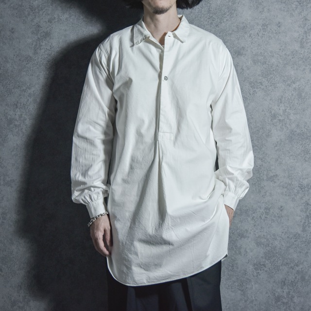 スウェーデン軍よりデッドストックのプルオーバーロングシャツをご紹介。 人気のスウェーデン軍の中でも、特に探している方の多い50年代製のロング丈グランパシャツ。 完成されたデザインで、様々なブランドがサンプリングする名作です。 後年のものとは違い脇のくりが深めのプルオーバーで、着丈も長く横幅も適度なゆとりのある着やすいシルエットで、フロントはメタルボタンが付き、袖口のボタンは同じ50年代のスウェーデン軍のものですが、やや後期の樹脂ボタンに付け替えられています。 素材は薄手の平織りコットンで、適度なハリとリネンのようなシャリ感が特徴。 綺麗にドレープも出るので、着た時の雰囲気が抜群です。 古い年代のユーロシャツ特有の針目の細かいステッチで、ミリタリーアイテムとは思えないほど丁寧な作りになっています。 人気の反面デッドストックで見かけることはほぼなくなった逸品です。 お探しだった方はぜひこの機会にご検討ください。 デッドストックですが一度水通しを済ませております。 【color】 オフ 【material】 コットン 【period】 50s 【condition】 こちらはデッドストックアイテムです。 特記するダメージ等は写真、またはテキストにてご説明しておりますが、生産されてから長期間経過しておりますので、経年変化等ございますが、風合いとしてご理解頂き、ご購入下さい。 【size spec 】 着丈 約90cm 身幅 約57cm 肩幅 約45cm 袖丈 約63cm ※サイズ計測の多少の誤差はご了承下さい。 【model】 173cm 60kg --返品・交換に関して-- 商品にご満足いただけなかった場合、お届け後3日以内に当店までご連絡いただければ、返品・交換を承ります。 なお、商品は返送後に未使用であると当店が判断でさせて頂いた場合のみ返品・交換を受け付けます。 サイズ交換など、お客様都合による返品の場合は、往復送料はお客様負担となります。 商品到着後、お手数ですが商品状態をご確認いただき、写真との相違、不良品等がある場合は下記、メールアドレスまでお早めにご連絡ください。 [email protected] ーー配送に関してーー ご注文いただいてから3営業日以内を目処に発送いたします。(土日祝日、年末年始(12/29〜1/3)の発送は行っておりません。) ※1)送料に関しましてはシステム上、個別設定ができないため全国一律800円を頂戴しております。 税込11,000円以上お買い上げで送料無料です。 ※2)配送にはヤマト運輸(株)を利用しており、宅急便だけでなく宅急便コンパクト、ネコポスでお送りさせて頂く場合もございますのであらかじめご了承下さい。 レビューを書いて下さる方には、簡単なノベルティをプレゼントします。 購入時、要望の備考欄に『ノベルティ希望』と入力の上、ご購入お願いします。