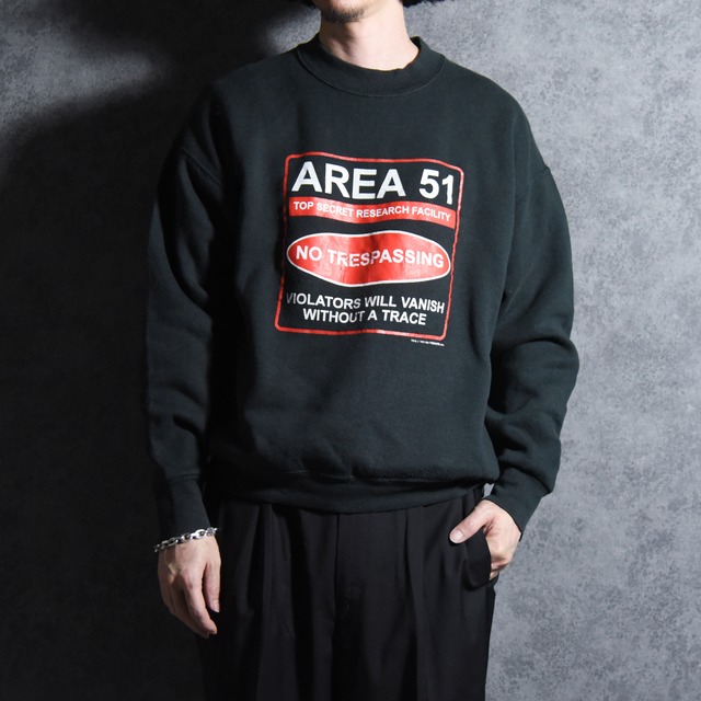 1996年に生産されたFRUIT OF THE LOOM(フルーツオブザルーム)ボディの企業スウェットのご紹介。 エリア51は、アメリカのネバダ州にあるアメリカ空軍の極秘施設の通称で「世界で最も有名な機密基地」とも言われています。 あまりに厳重な警備と、見たこともない形の最新鋭機が夜な夜なテスト飛行をしていたため、周辺住民から「UFOを見た」という目撃証言が相次ぎました。 墜落した宇宙船の研究や宇宙人と共同研究しているという陰謀論的な噂もある都市伝説界隈でも有名エリア。 VIOLATORS WILL VANISH WITHOUT A TRACE(侵入者は跡形もなく消えるだろう)という都市伝説やUFO・オカルトカルチャーを反映したユーモアのある警告文のスーベニアアイテム。 デザイン、配色、プリント、生地の風合いなど当時の空気が感じられる雰囲気の良いグッドピースです。 【color】 ブラック 【material】 コットン50% アクリル 50% 【Country of Origin】 アメリカ製 【Period】 90s 【condition】 こちらはユーズドのアイテムです。 特記するダメージ等は写真、またはテキストにてご説明しておりますが、生産されてから長期間経過しておりますので、経年変化等ございますが、風合いとしてご理解頂き、ご購入下さい。 【Size Spec】 身丈 約62cm 身幅 約59cm 肩幅 約58cm 袖丈 約53cm ※サイズ計測の多少の誤差はご了承下さい。 【model】 173cm 60kg --返品・交換に関して-- 商品にご満足いただけなかった場合、お届け後3日以内に当店までご連絡いただければ、返品・交換を承ります。 なお、商品は返送後に未使用であると当店が判断でさせて頂いた場合のみ返品・交換を受け付けます。 サイズ交換など、お客様都合による返品の場合は、往復送料はお客様負担となります。 商品到着後、お手数ですが商品状態をご確認いただき、写真との相違、不良品等がある場合は下記、メールアドレスまでお早めにご連絡ください。 [email protected] ーー配送に関してーー ご注文いただいてから3営業日以内を目処に発送いたします。(土日祝日、年末年始(12/29〜1/3)の発送は行っておりません。) ※1)送料に関しましてはシステム上、個別設定ができないため全国一律800円を頂戴しております。 税込11,000円以上お買い上げで送料無料です。 ※2)配送にはヤマト運輸(株)を利用しており、宅急便だけでなく宅急便コンパクト、ネコポスでお送りさせて頂く場合もございますのであらかじめご了承下さい。 レビューを書いて下さる方には、簡単なノベルティをプレゼントします。 購入時、要望の備考欄に『ノベルティ希望』と入力の上、ご購入お願いします。