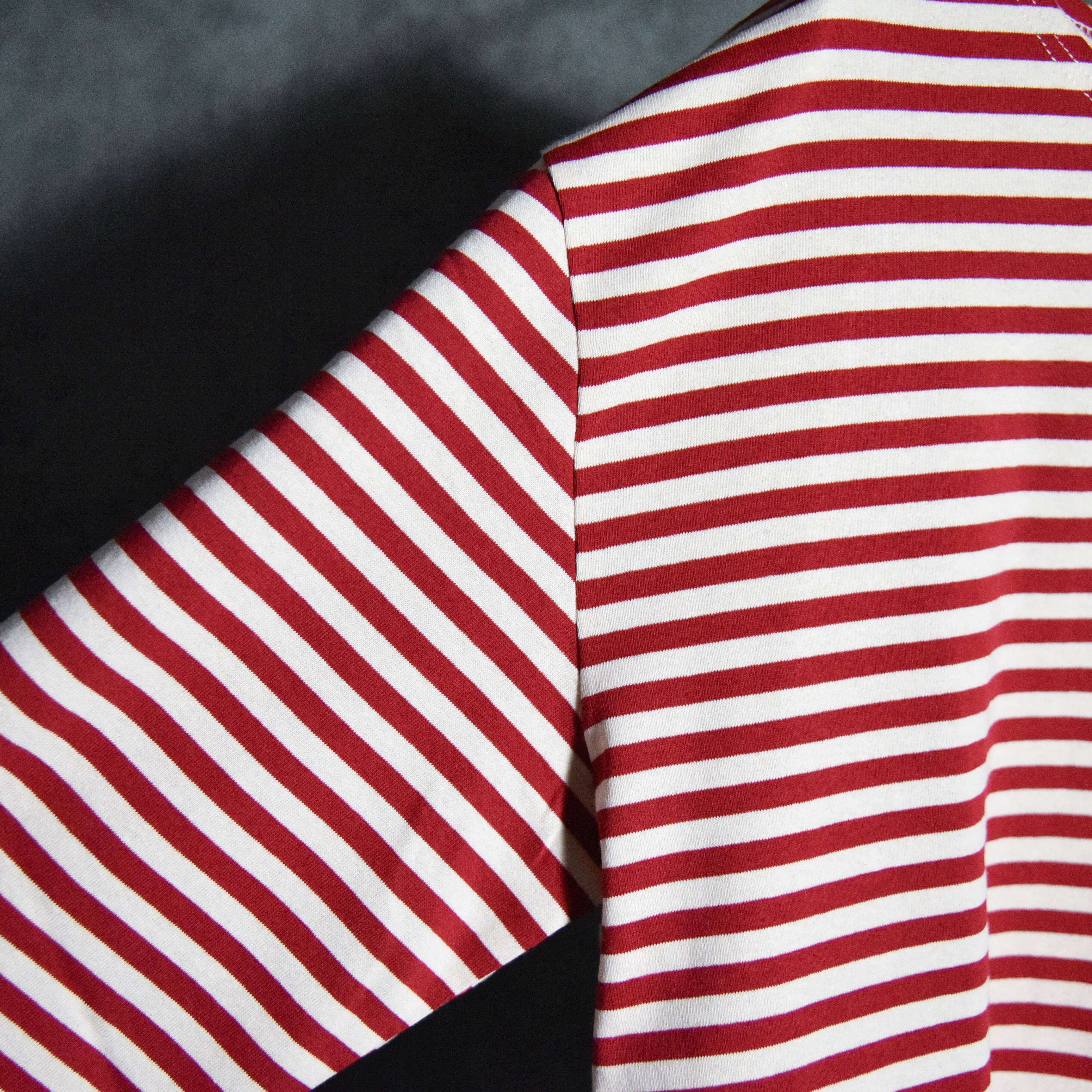 生地は肌触りが良く肉感もしっかりある中厚コットンで、一般的なTシャツとバスクシャツの中間のような手持ち感です。