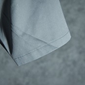 ややワイドな襟に共地のパイピングが施されたハーフプラケットのスキッパーに、胸にはパッチポケットの付く、余計なディテール削ぎ落としたシンプルなデザインがいかにもプリズナーらしい一着。