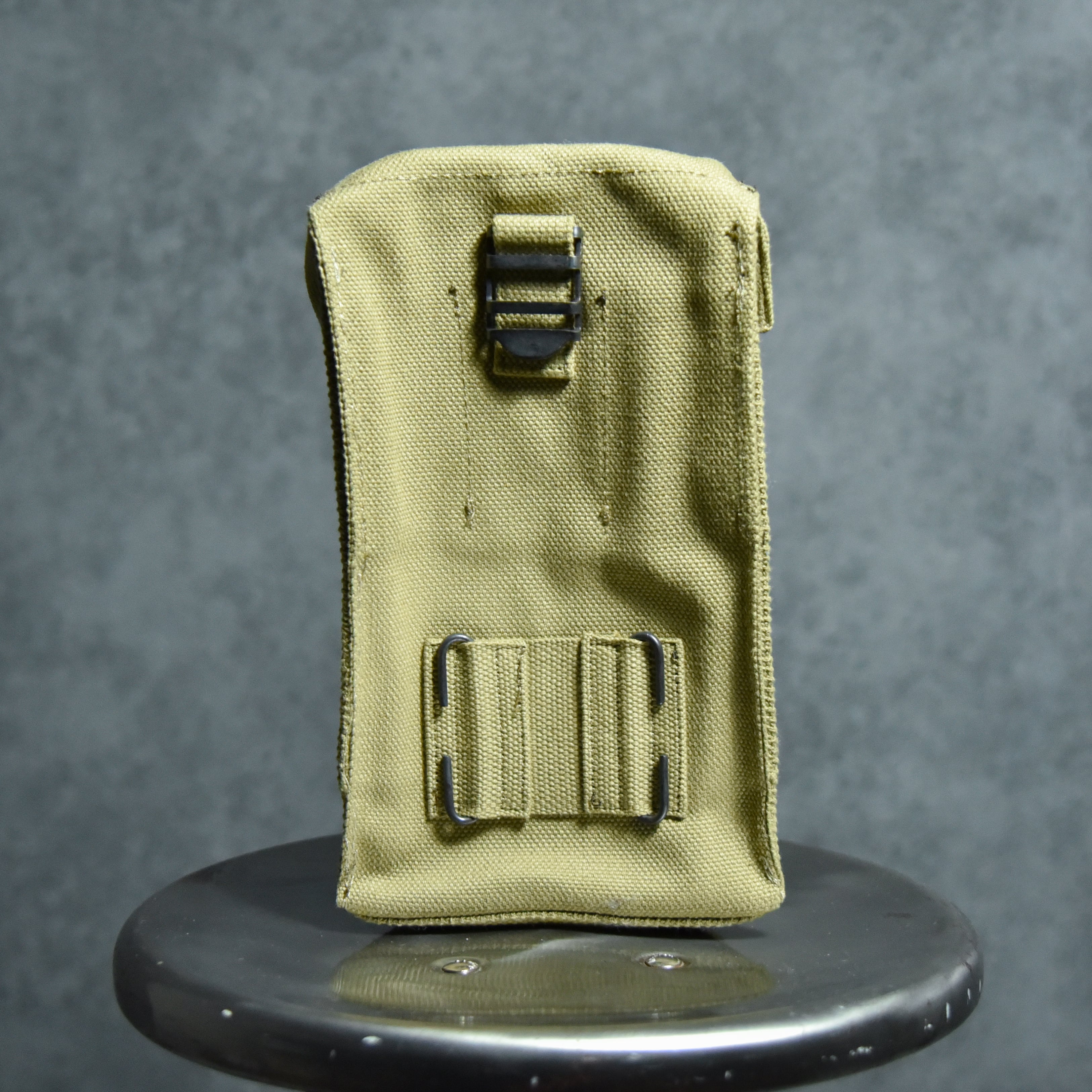 弾薬などを入れるマガジンポーチとして使われていたアイテムで、分厚く頑強なコットンキャンバスに、金属パーツがあしらわれたミリタリーらしい逸品。
