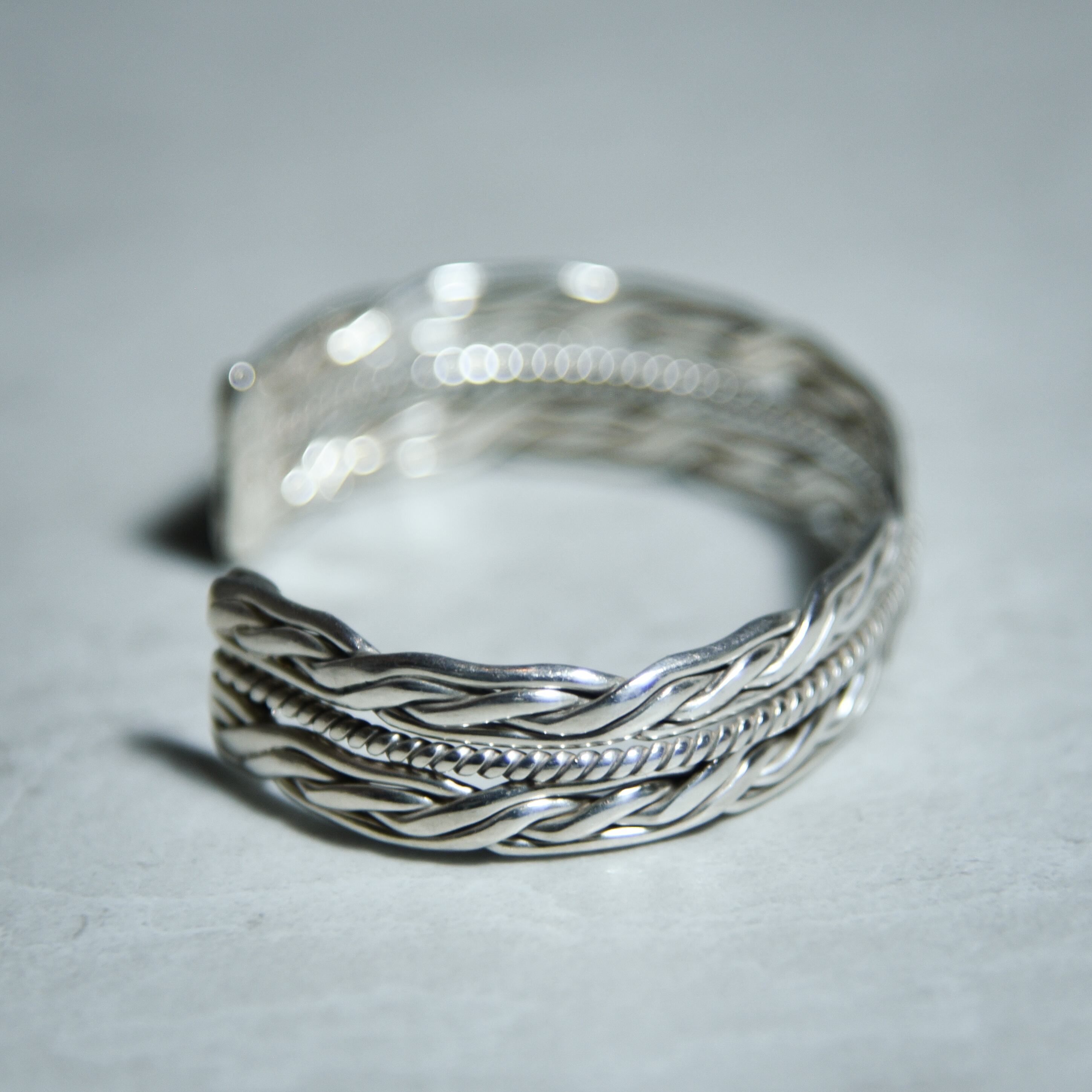 彫金というよりは織り・編み・組みに近い手法なので柔らかな印象の中に力強さのあるデザイン。