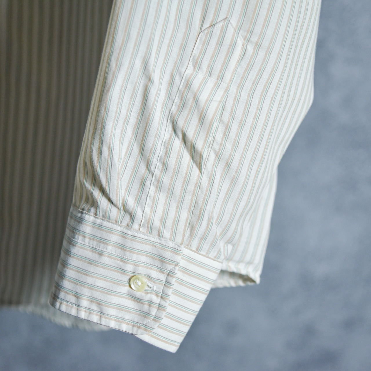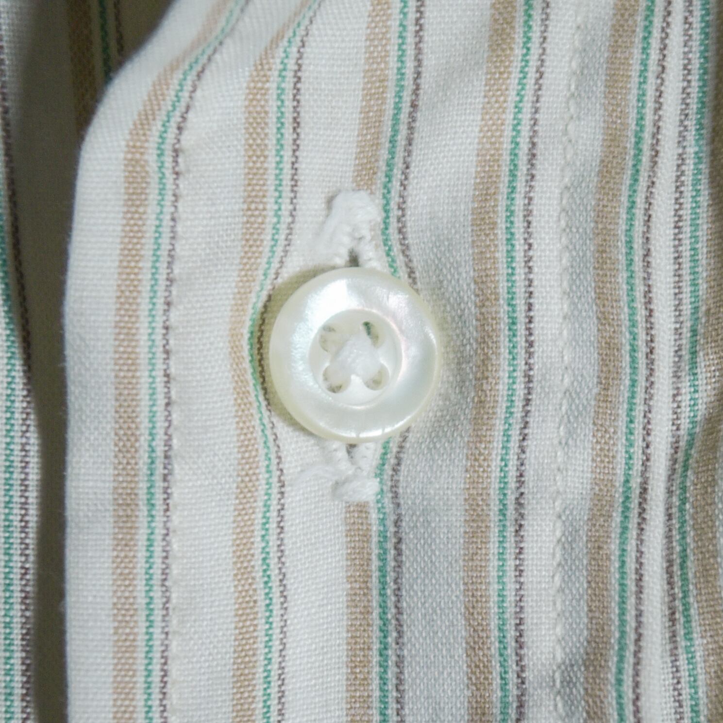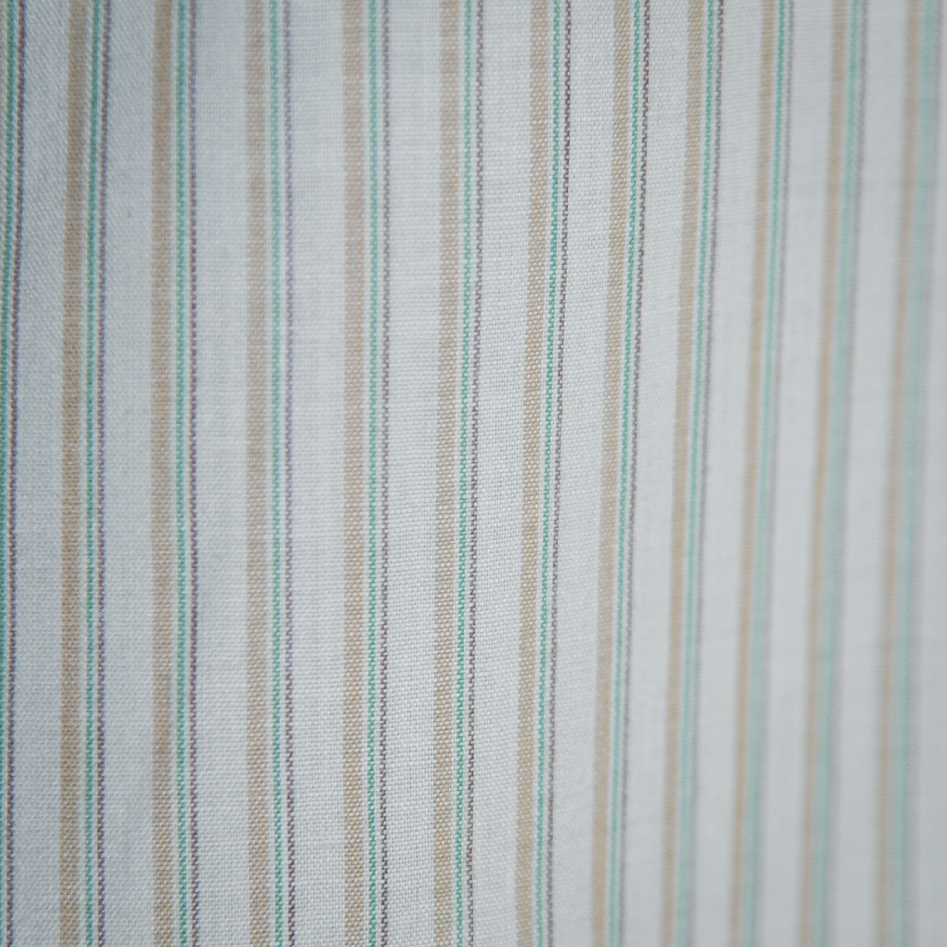 生地は薄手のコットンブロードで、キナリのボディにベージュ、ブラウン、グリーンのストライプが走る落ち着いた好配色。