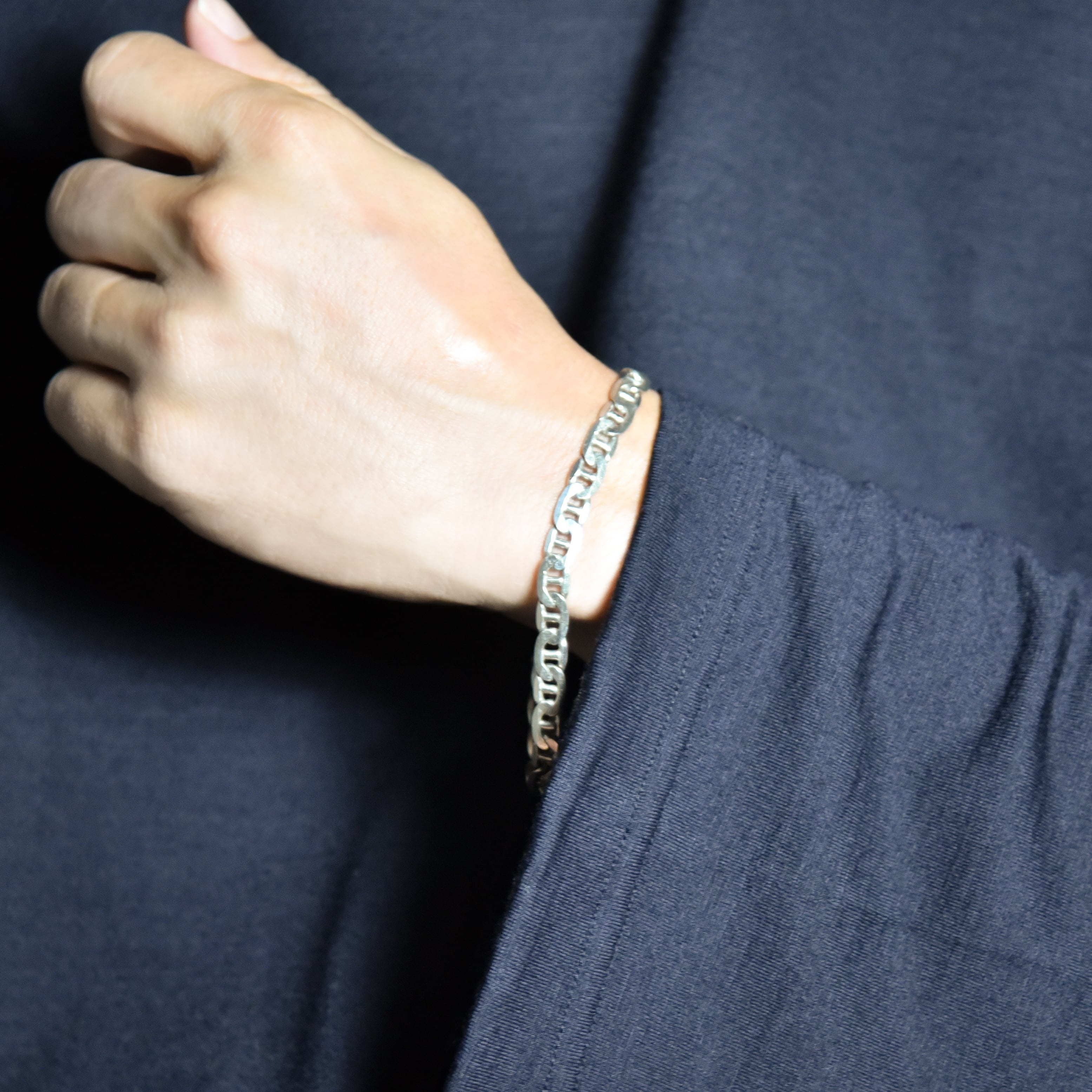 チェーンは錨鎖、いわゆるアンカー型のパーツをグルメットチェーンのようにフラットにさせた珍しいデザイン。