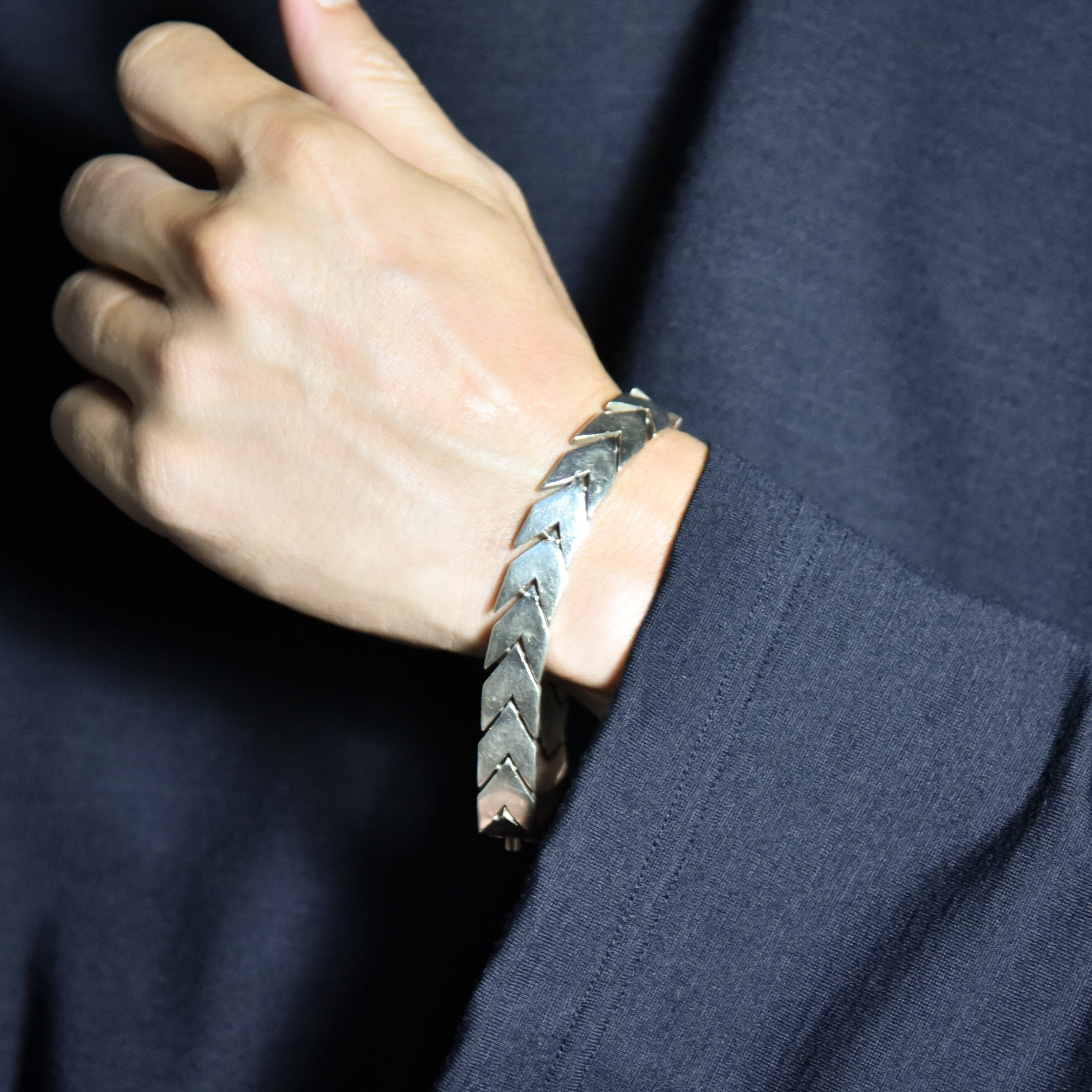 こちらのブレスレットは可動式のヘリンボンのような矢印のようなパーツが連結された一点。