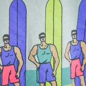 カラフルなプリントで4人並んだ、逞しいサーファーをコミカルにイラスト化したデザイン。