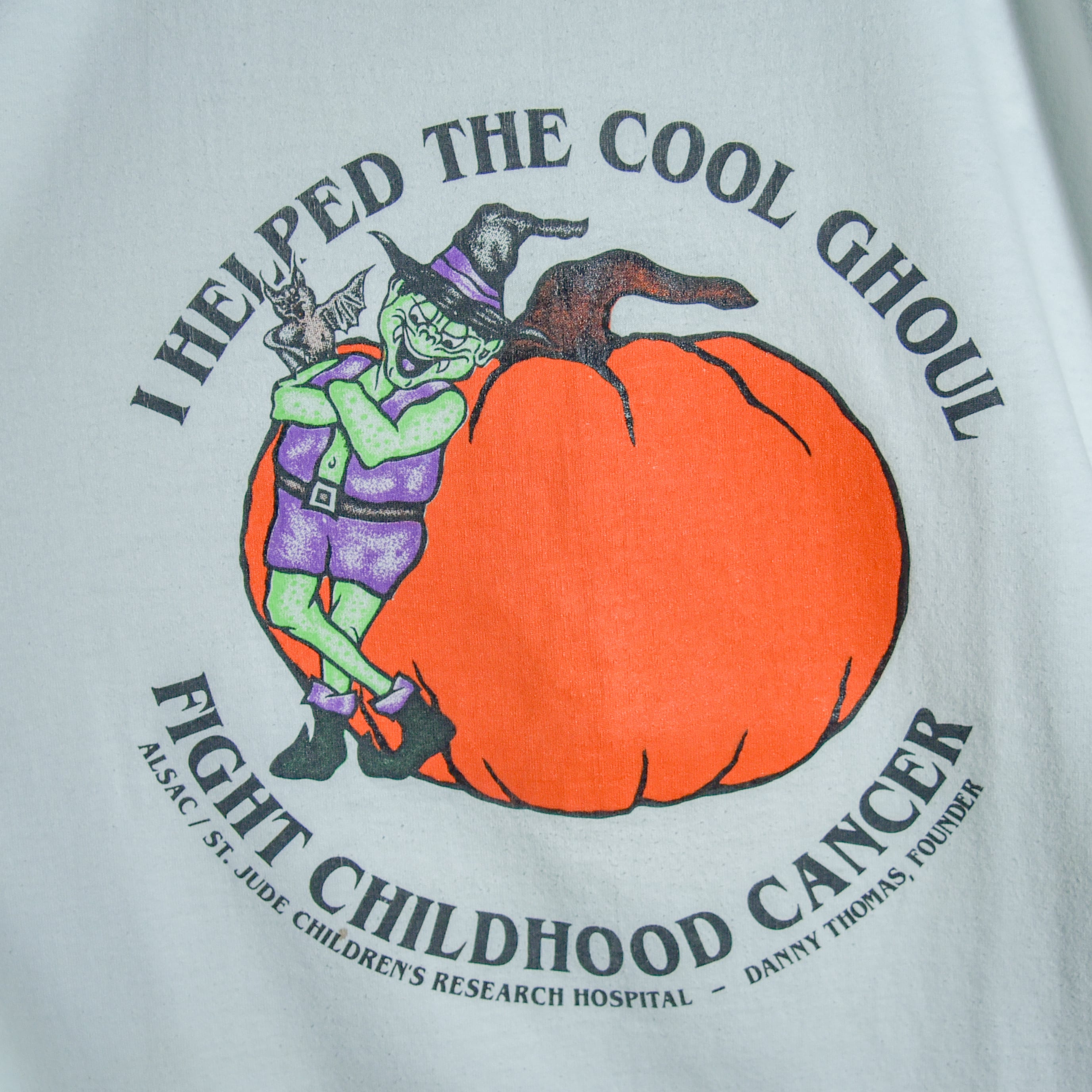 肩にコウモリを乗せたグールのキャラクターが大きなカボチャにもたれかかっているデザインで、セントジュード小児研究病院の資金調達機関であるALSAC (American Lebanese Syrian Associated Charities) のプリントが入っており、ハロウィンシーズンにセントジュード小児研究病院が小児がん撲滅のために行っている活動への支援を表明するものと思われます。