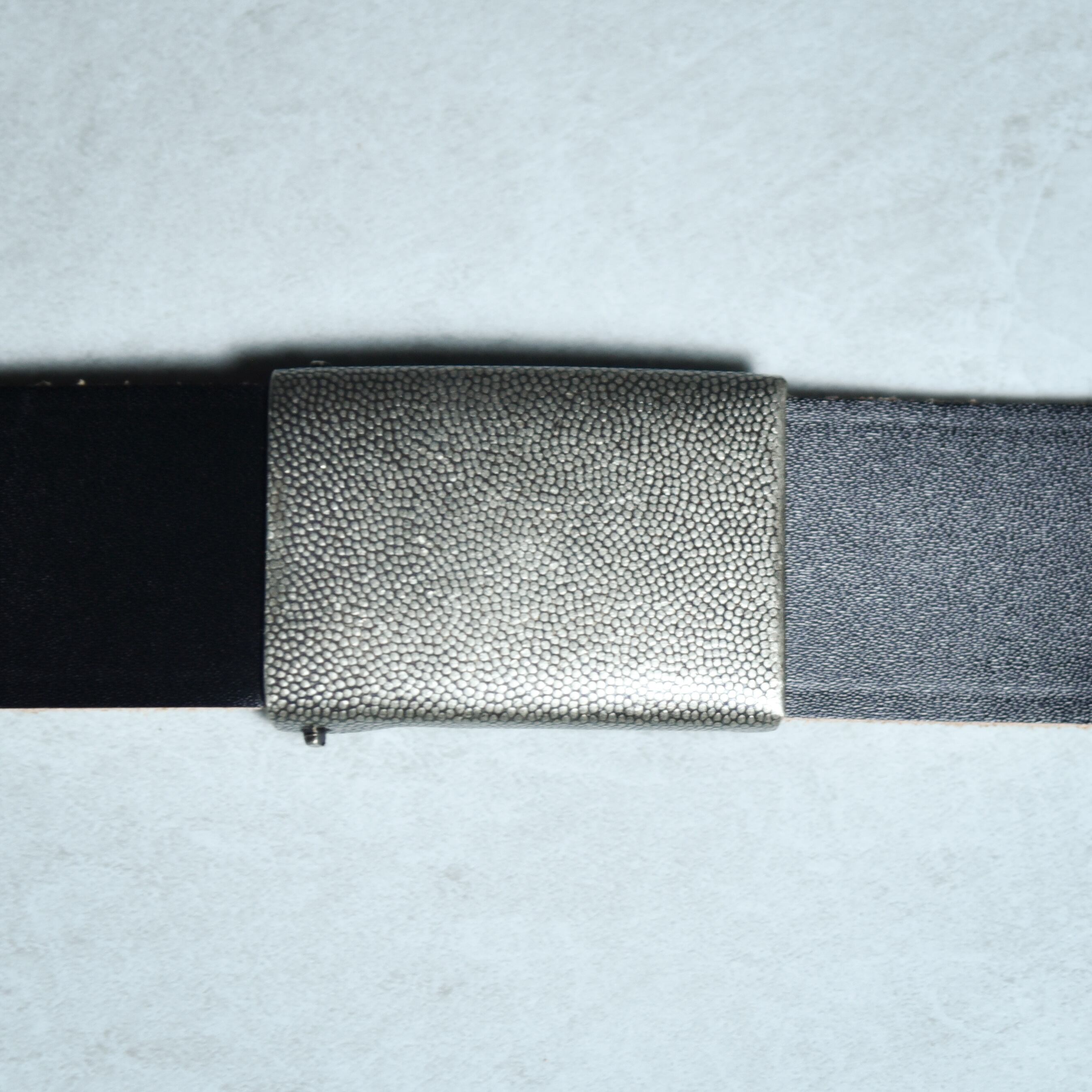 しっかりと厚みのあるレザーと、ブルズアイ状の表面感のあるメタルバックルが、いかにもミリタリーらしい武骨さを醸し出しつつ、デザイン自体は非常にシンプルなため端正な顔立ちのユーティリティなレザーベルトです。