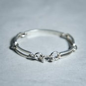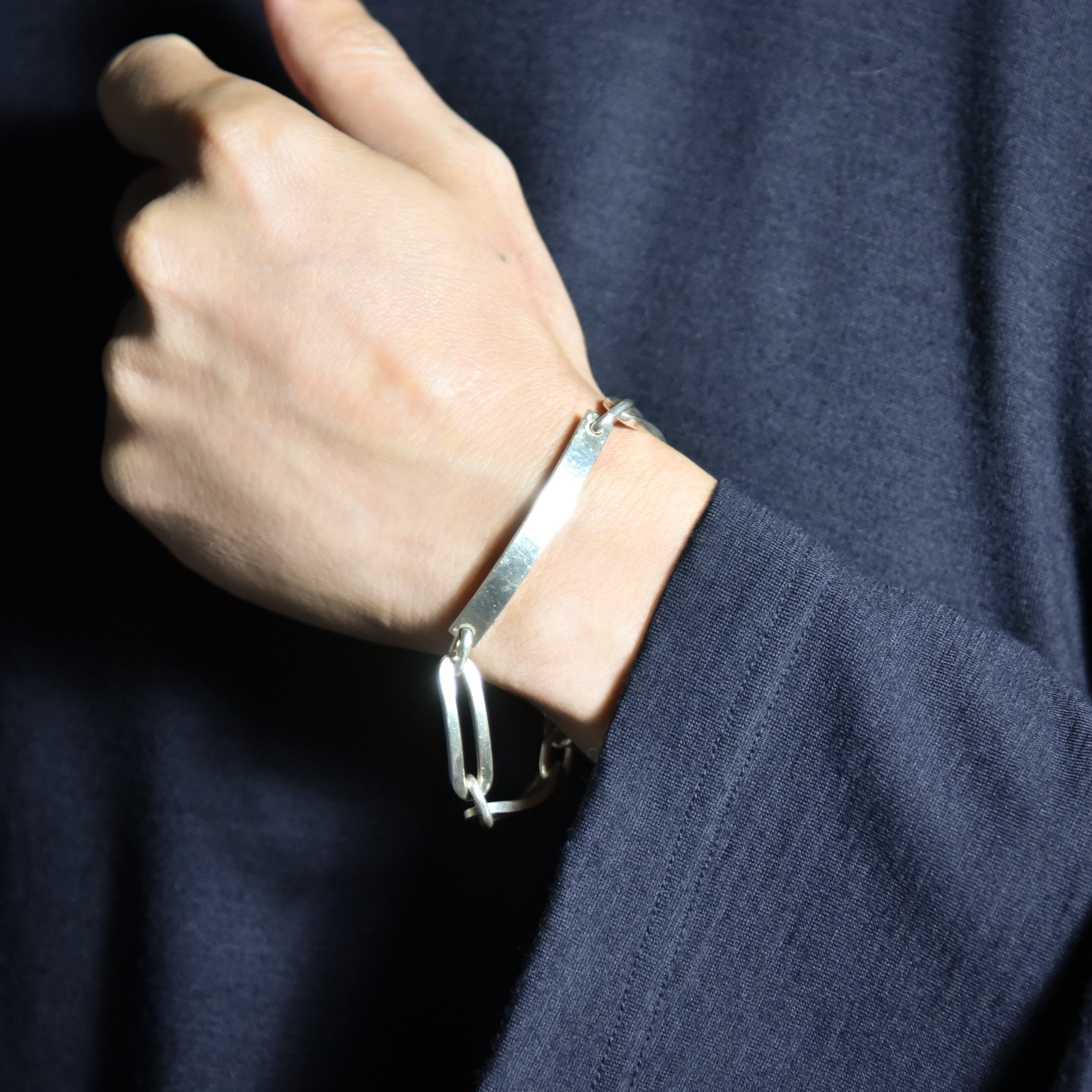 いわゆるIDブレスがベースになったデザインをベースに丸みを帯びたオーバル型のパーツによって手首に自然に沿うように構成された一点。