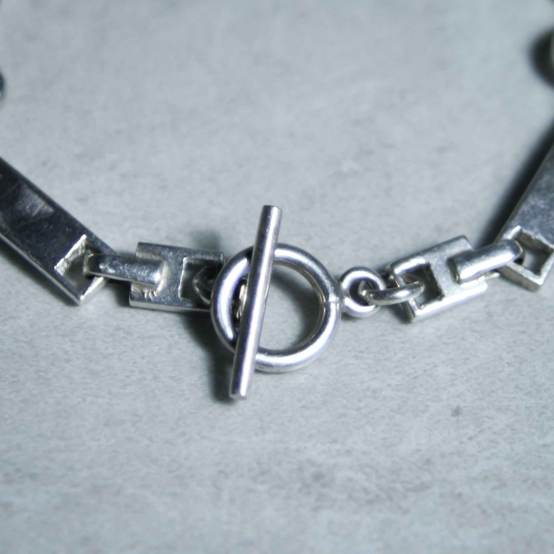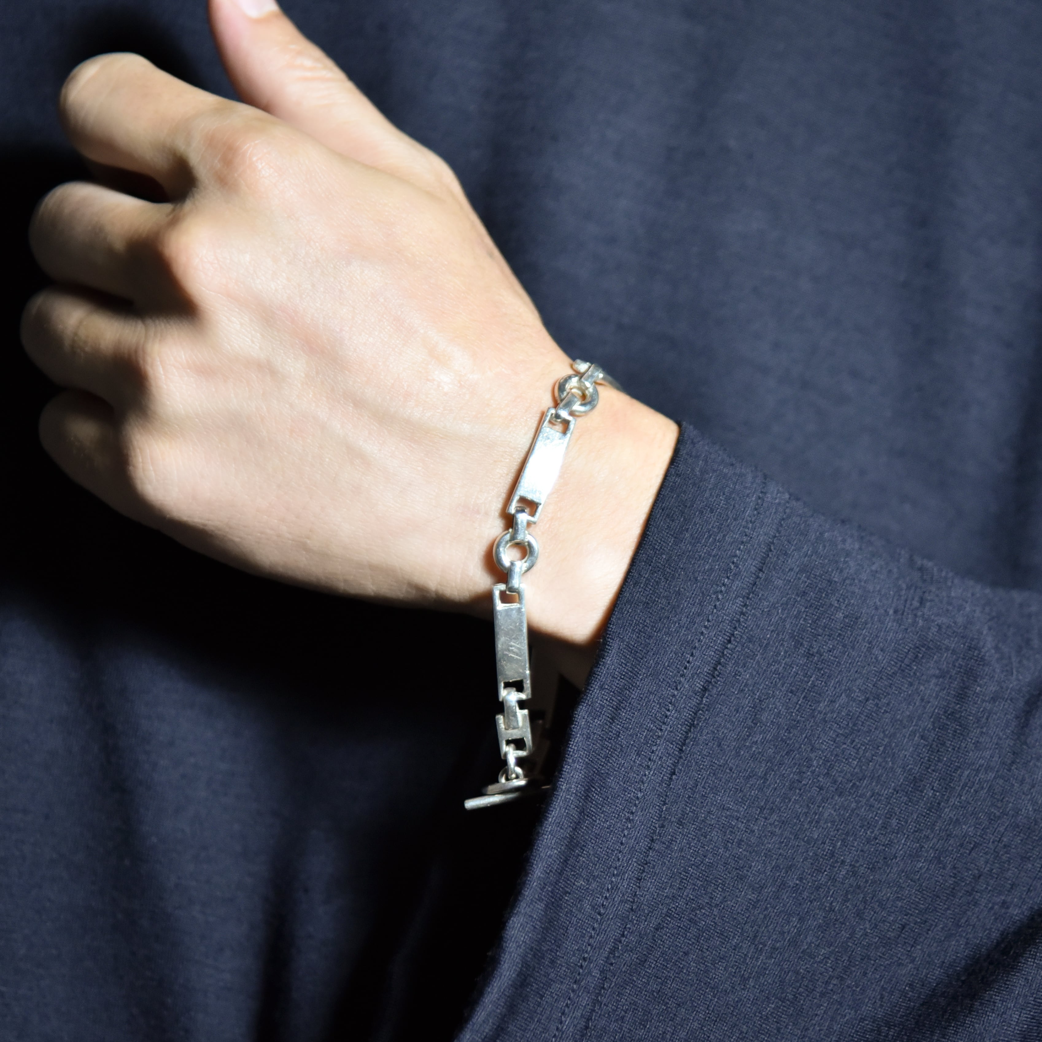プレート状のパーツとそれを繋ぐパーツによって構成された調和の取れたアイテムで、長方形と円形のコントラストが特徴的でエンドパーツもデザインの一部として溶け込んでいる細部まで一貫性のあるデザインです。