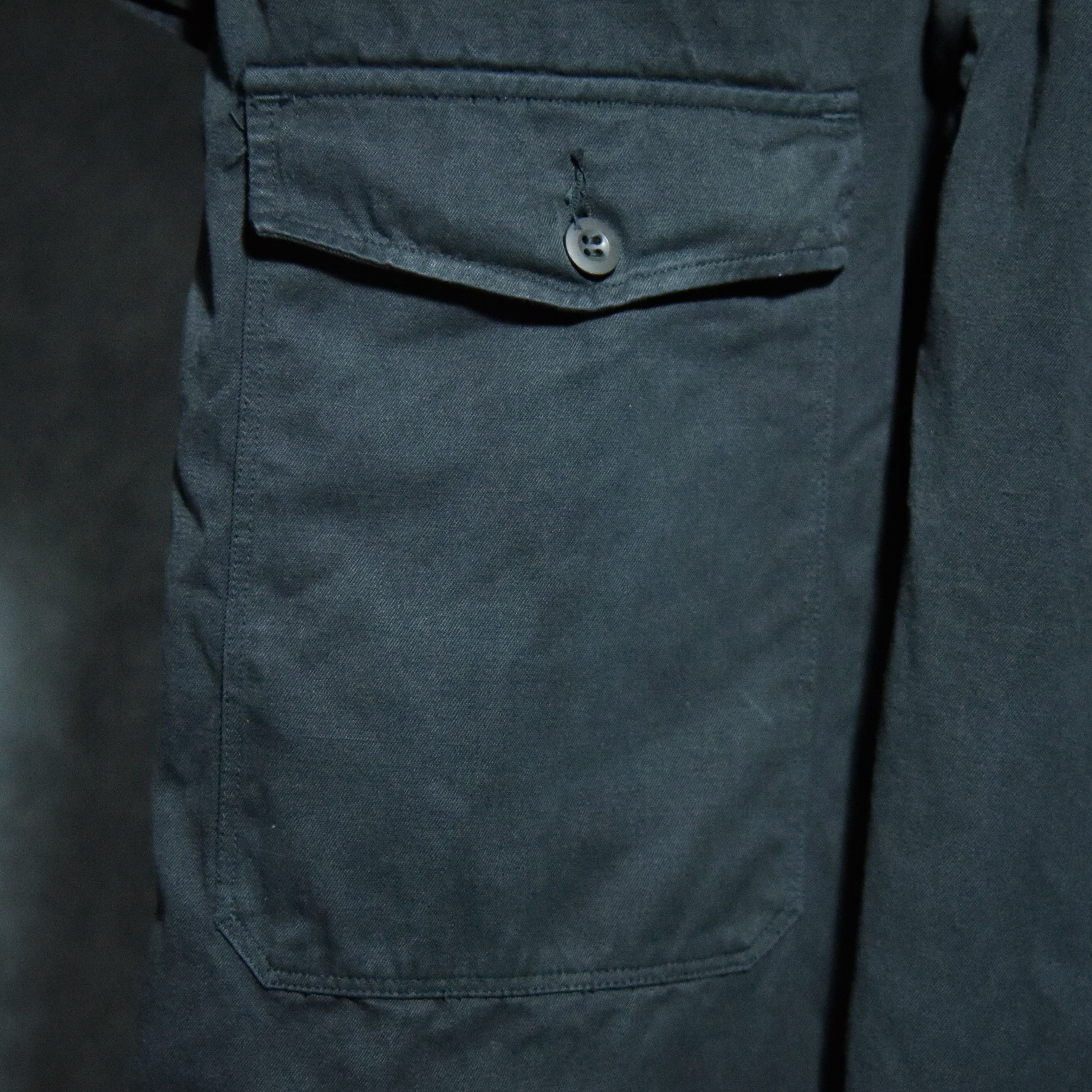 右足の大きめのマップポケットが印象的なディテールで、製品をブラックに染め上げたことでミリタリー特有の無骨さが中和された良い雰囲気の一着。