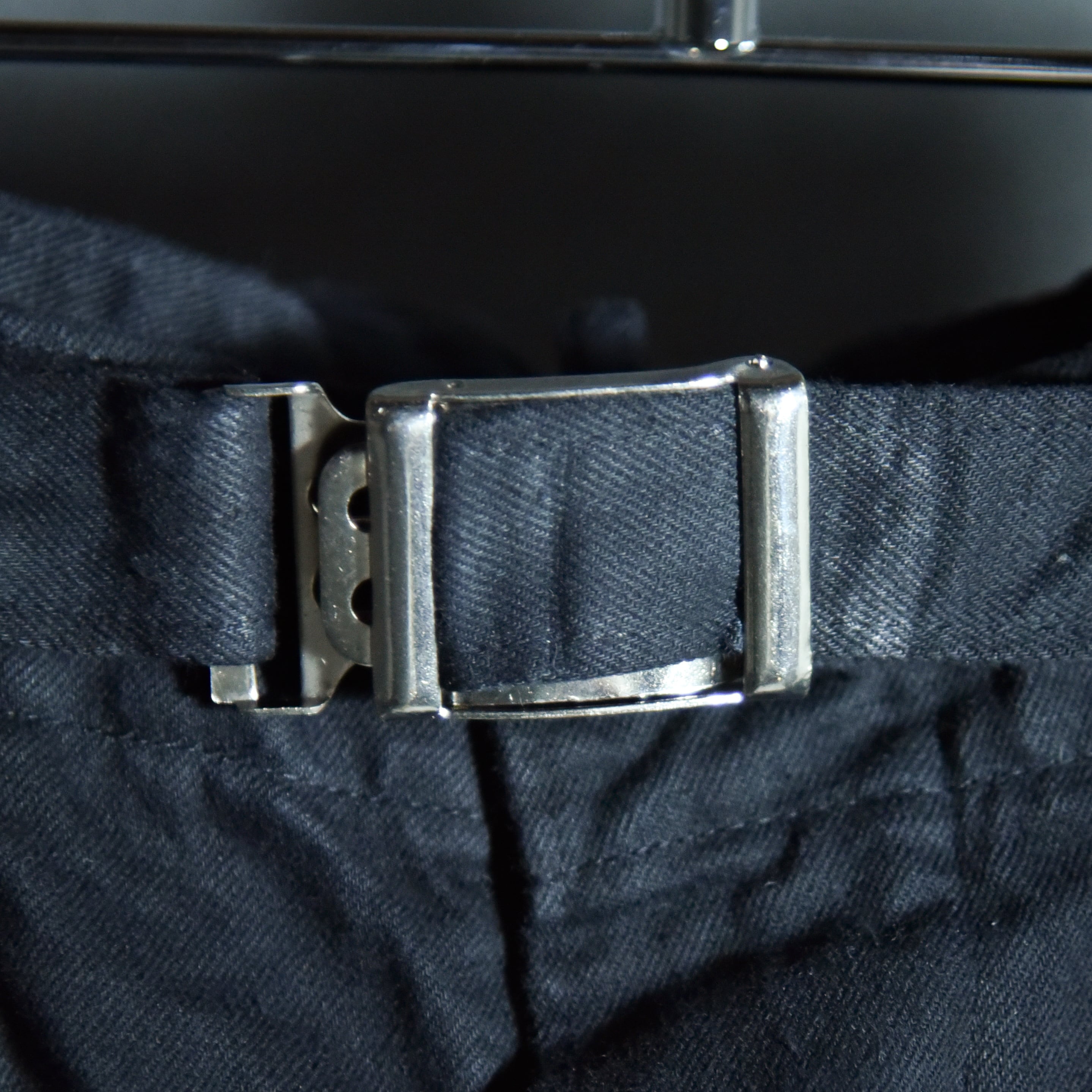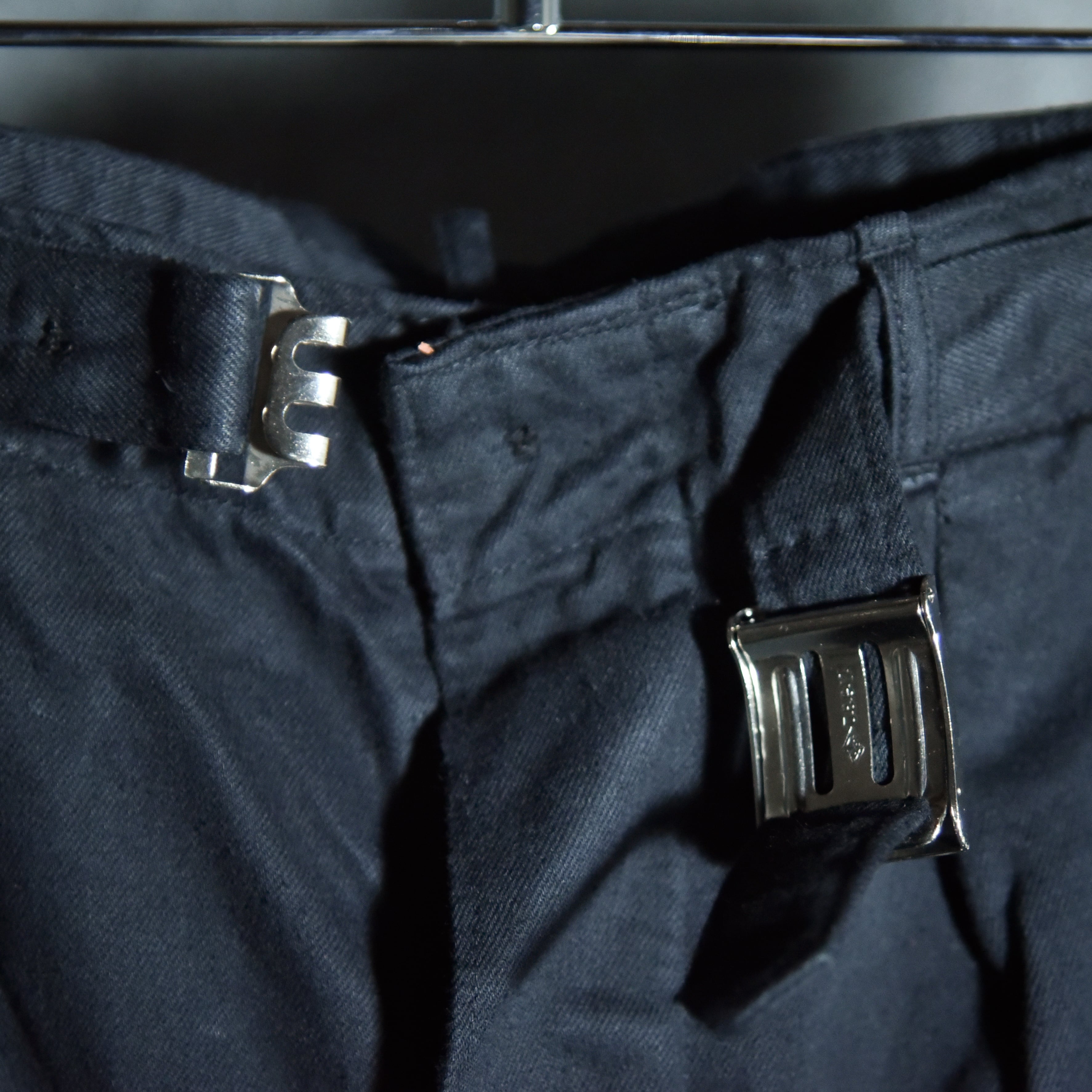 状態のいいデッドストックですが、ベルトのバックルまわりなどに若干の染め残りの跡があり、また内側のボタンの種類が異なる場合がございます。