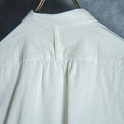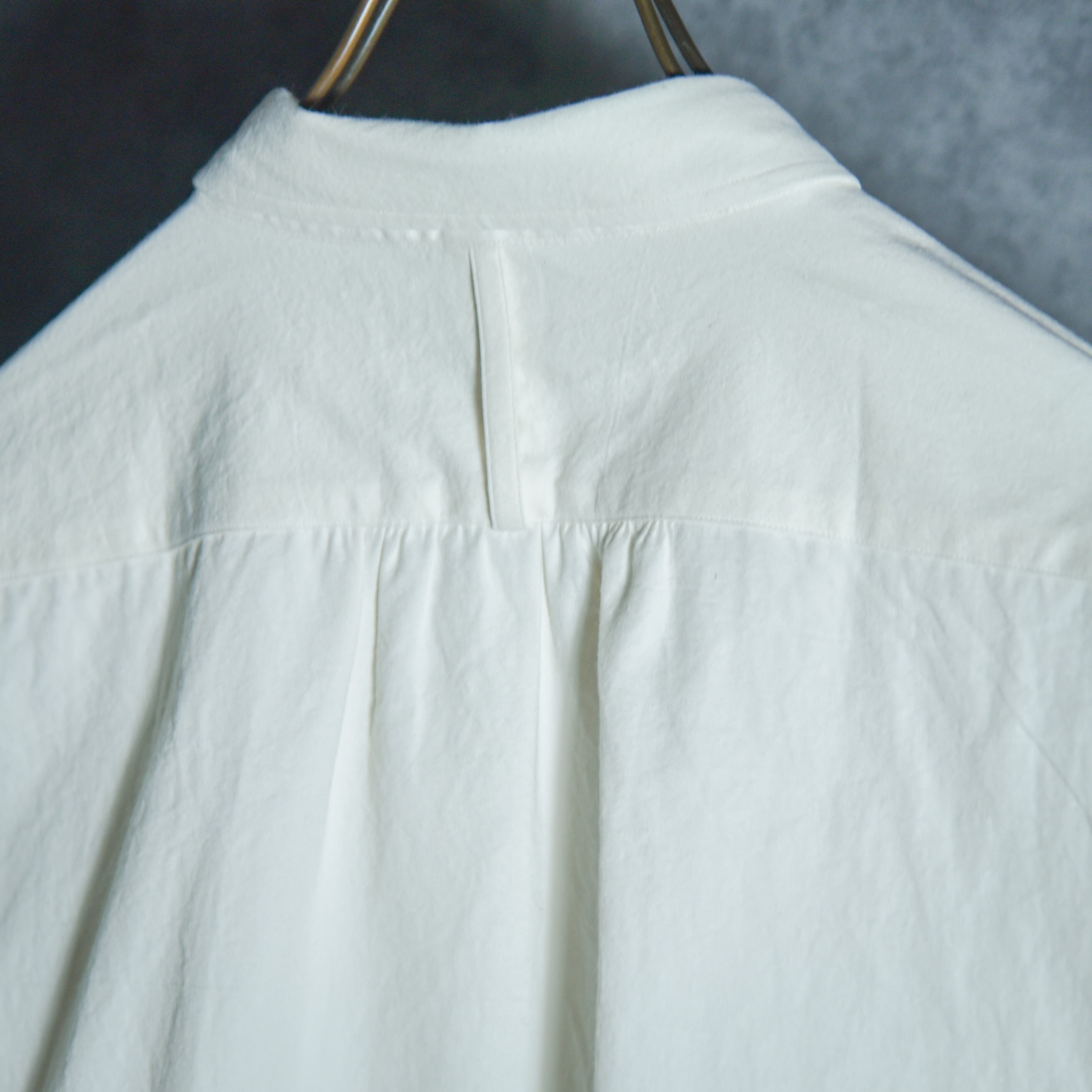 フロントは4つ釦でハーフプラケット、あき止まりからはボックスプリーツが繋がっており、バックヨーク下や袖口にはギャザーと手間のかかる仕様に。