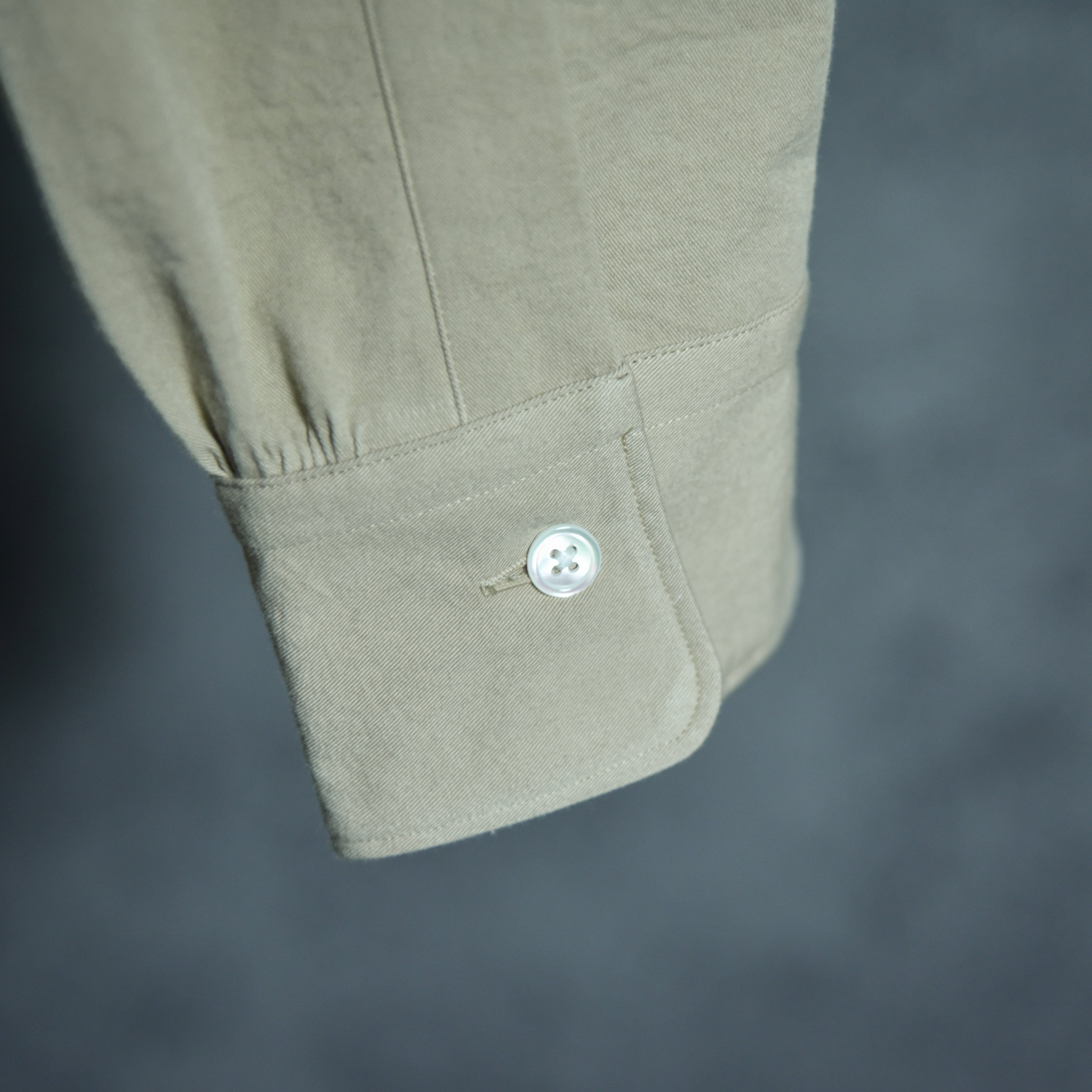フロントは4つ釦でハーフプラケット、あき止まりからはボックスプリーツが繋がっており、バックヨーク下や袖口にはギャザーと手間のかかる仕様に。