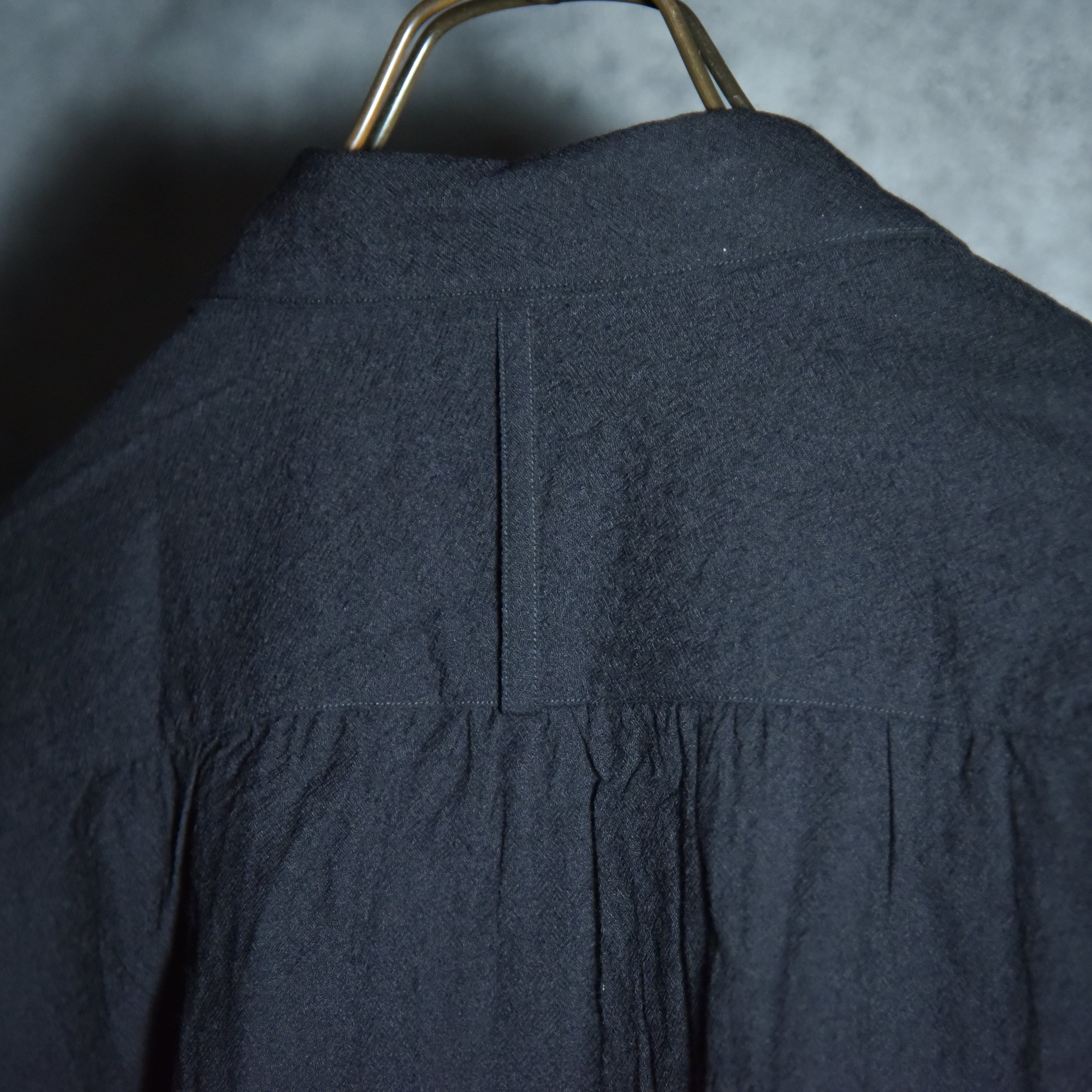 生地のシュリンク感を強調させるヨーク下と袖口のギャザー、下から2つのボタンだけを隠した半比翼仕立て、後ろを3cmだけで伸ばしてスリットを入れたスクエアカットの裾など、特徴的なディテールを取り入れつつ、全体のデザインはどんなスタイルにも取り入れやすい、シンプルなレギュラーカラーシャツに仕上げています。