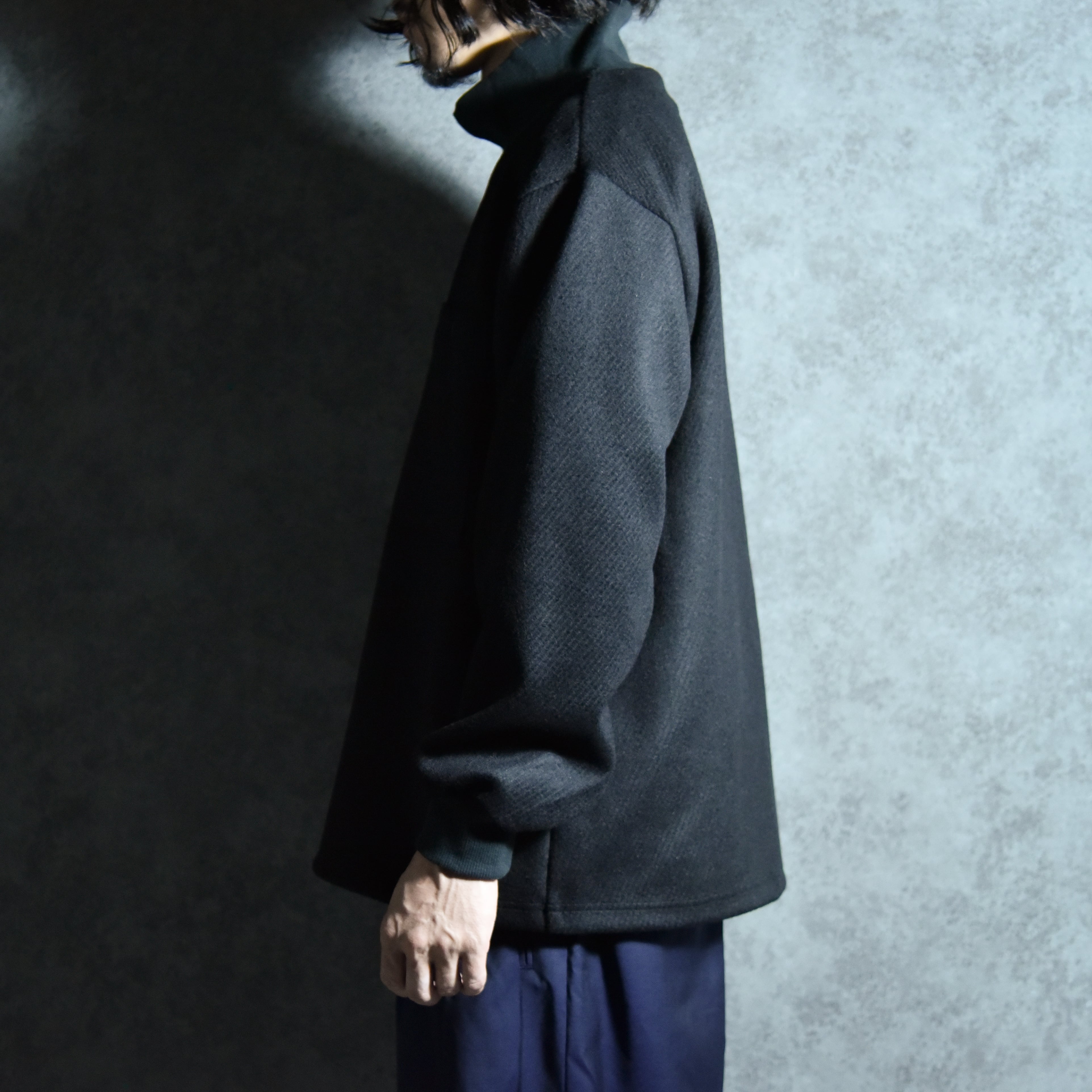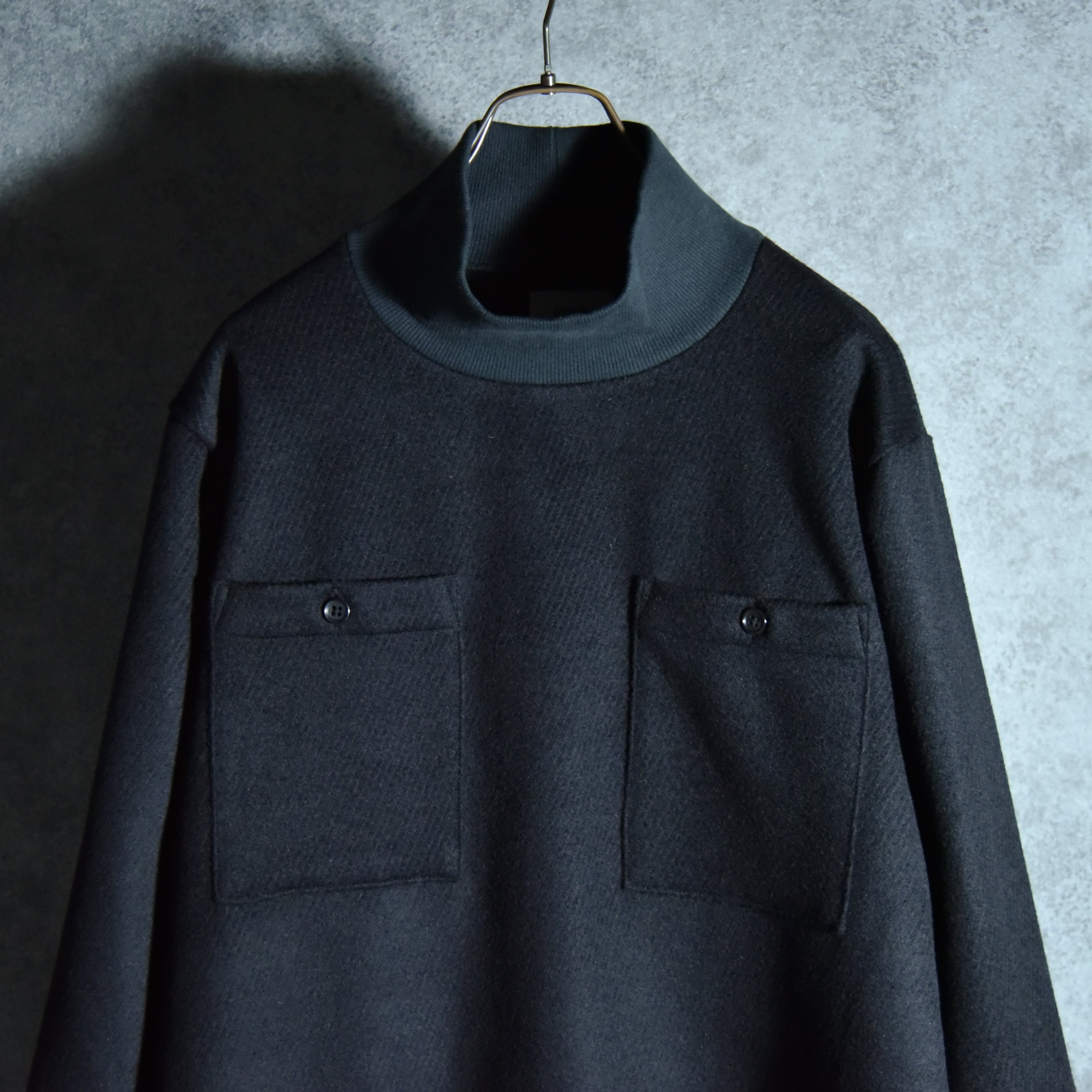 ミリタリーウェアに見られる様な、ダブルパッチポケットを備えたハイネックプルオーバー。