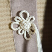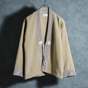 また特徴的なフロントの留め具は「御所結び」という和服の正装に用いられる飾り紐で、シルク100%の最高級付属です。