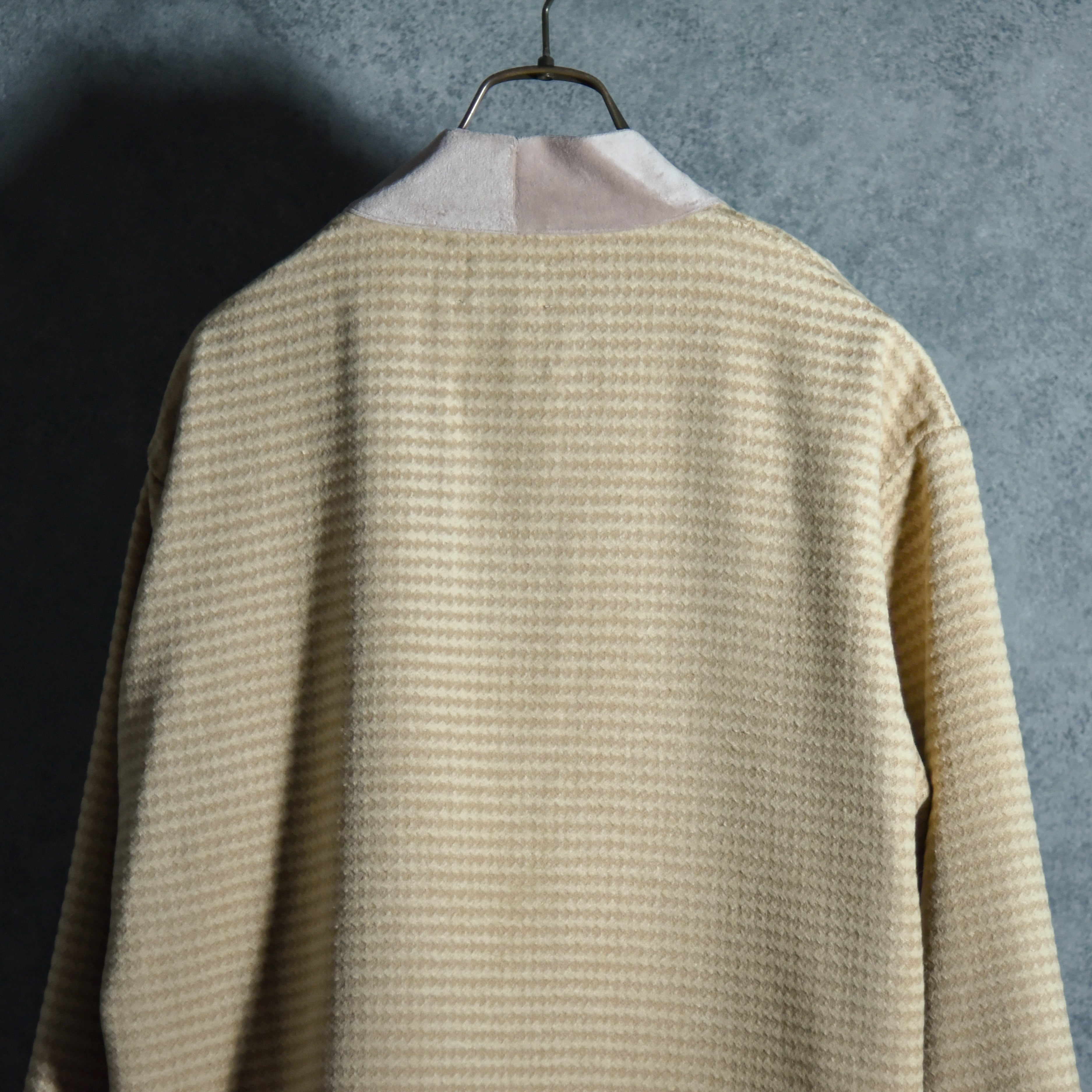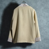 アンゴラが約60%ブレンドされているため肌触りは非常に柔らかく滑らかで、ウールのコシも活きておりダレることのない理に適った上質な素材で、襟と袖口にはこちらもきめ細かいしなやかさのあるコットンベロアが配されています。