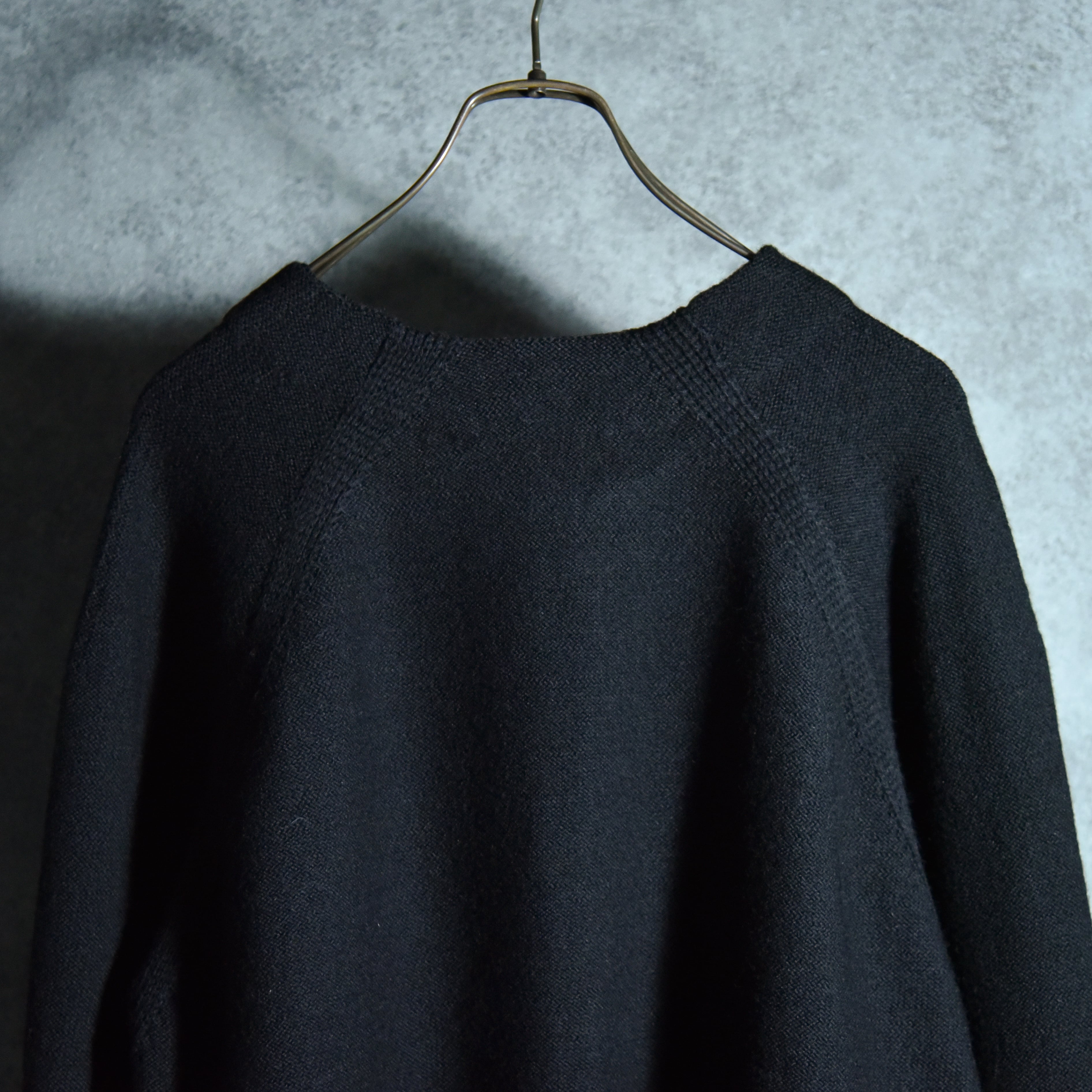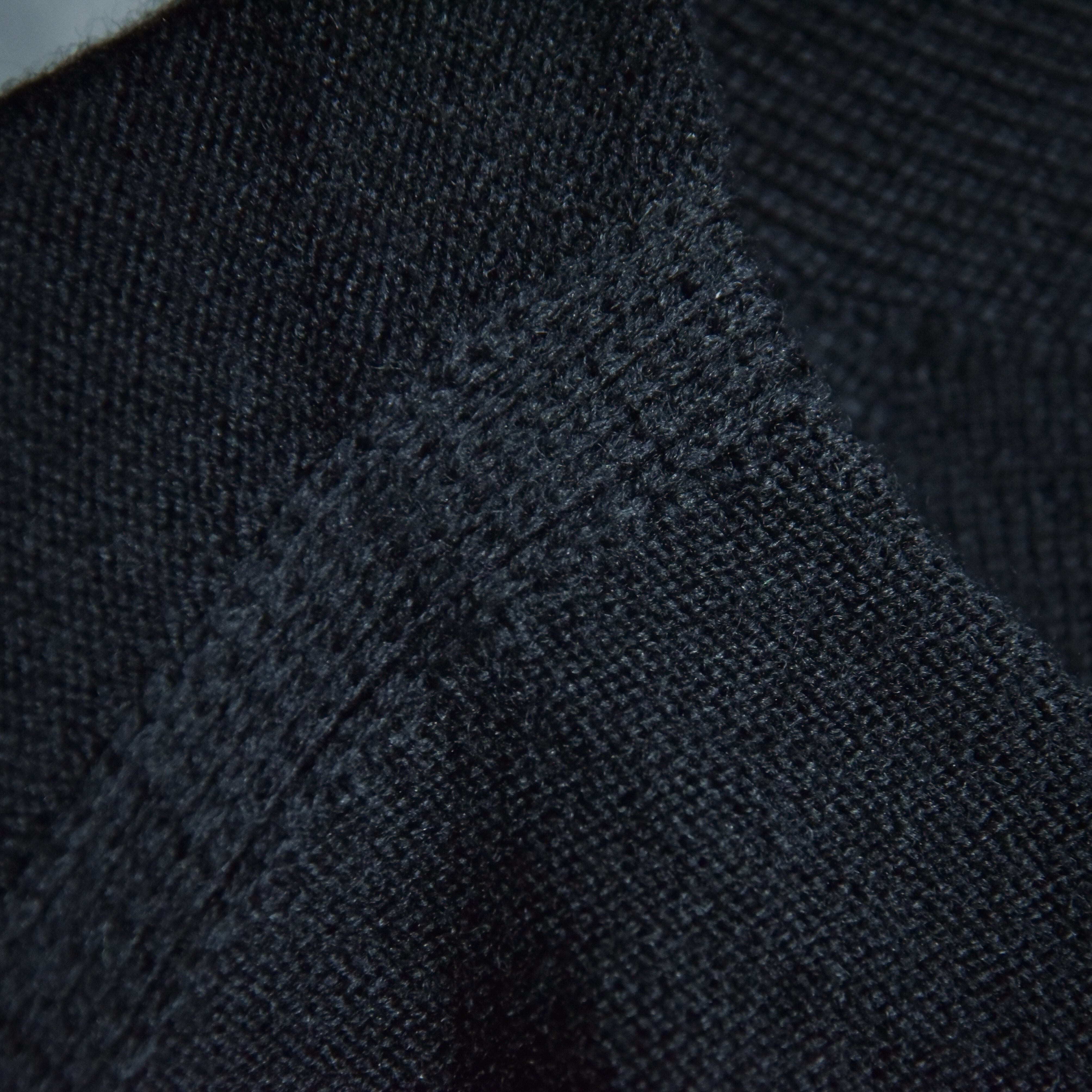 英国羊毛のDOWN種とアメリカンサウスウールをハーフブレンドした梳毛糸を使い、ミドルゲージの天竺裏目で編み上げています。