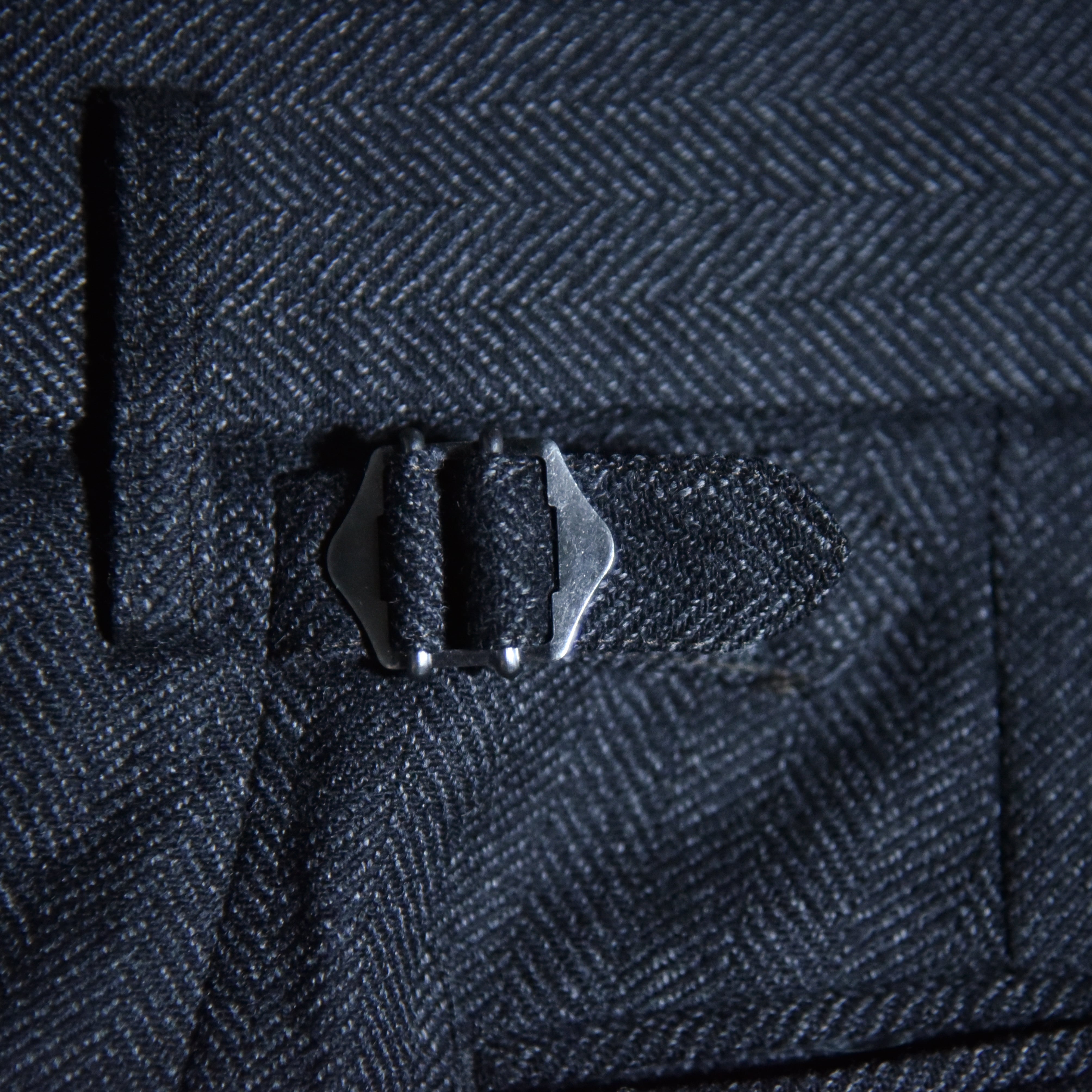 その他ウエストのサイズ調節が可能なサイドシンチや繊細な両玉縁のサイドの切りポケット、内側のサスペンダーボタン、ヒップにも細い両玉縁のピスポケットが付き、ベルトループはタックインの際に個性的なアクセントになるよう低めの位置に配置されているなど、オーセンティックでありつつ独創的なディテールが目を惹くデザインです。