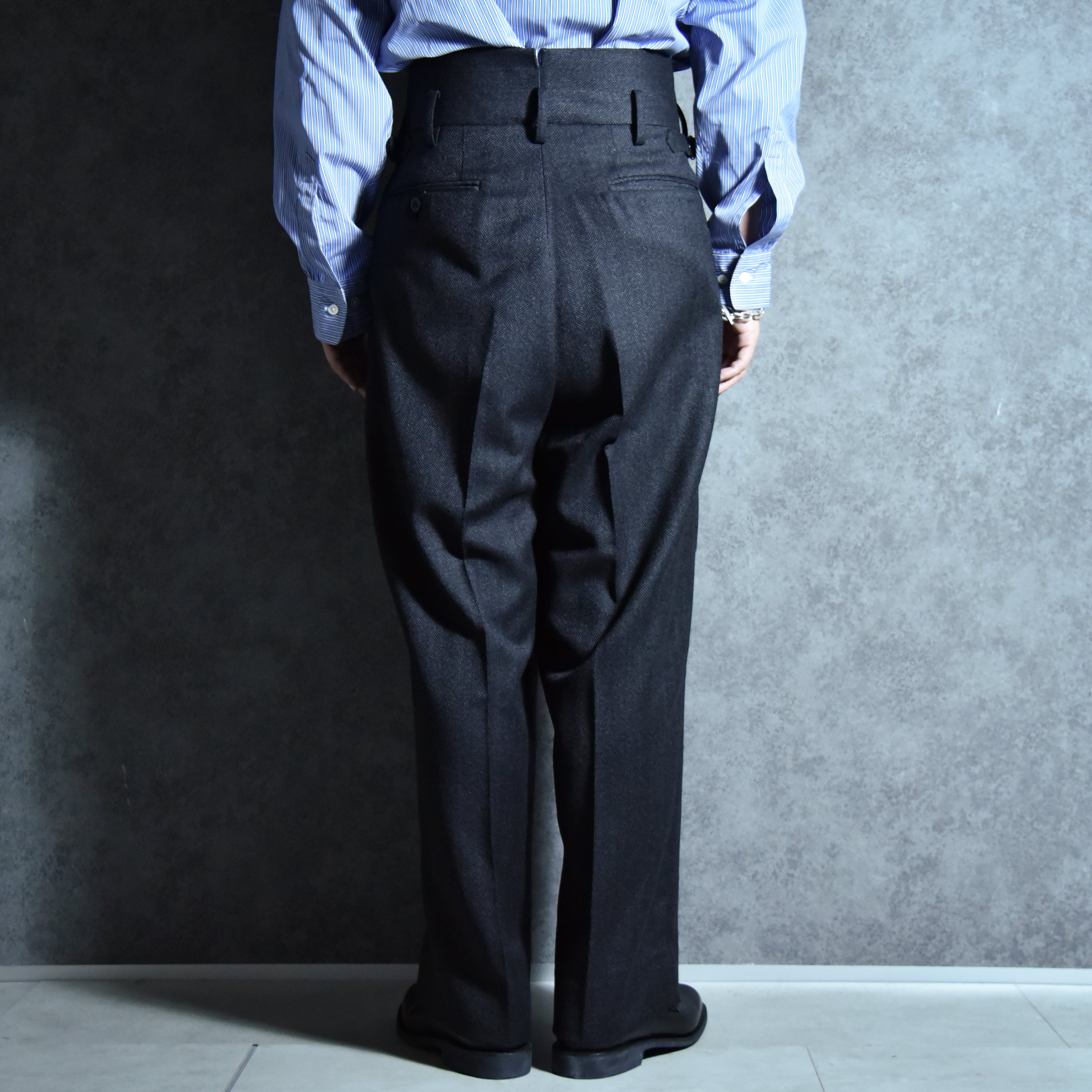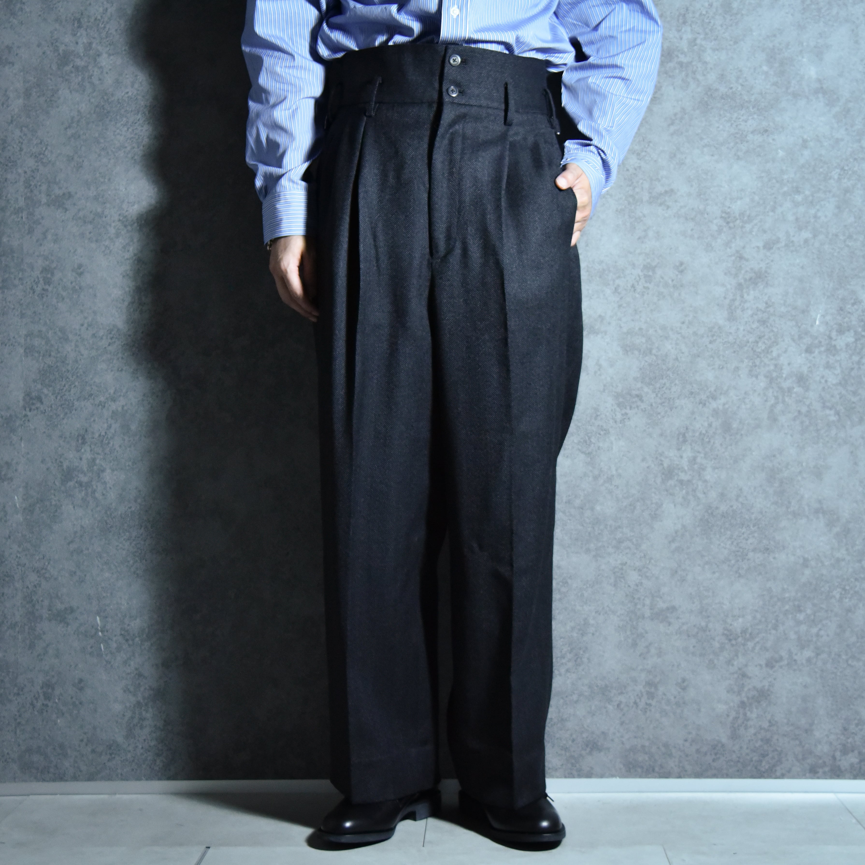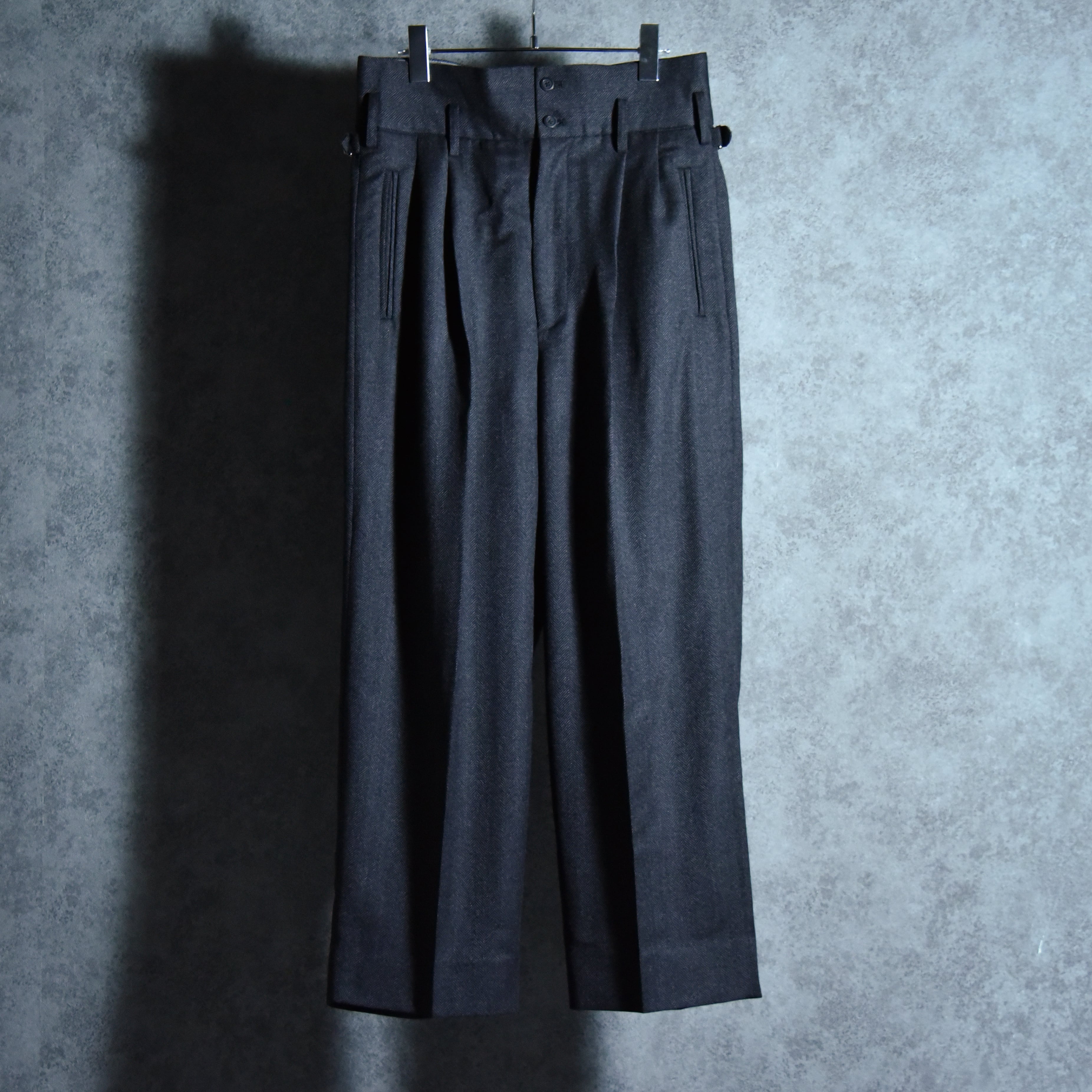 8cm太幅ベルトを配したハイウエストと、ツータックでワタリから裾までズドンと太いワイドシルエットが最大の特徴。
