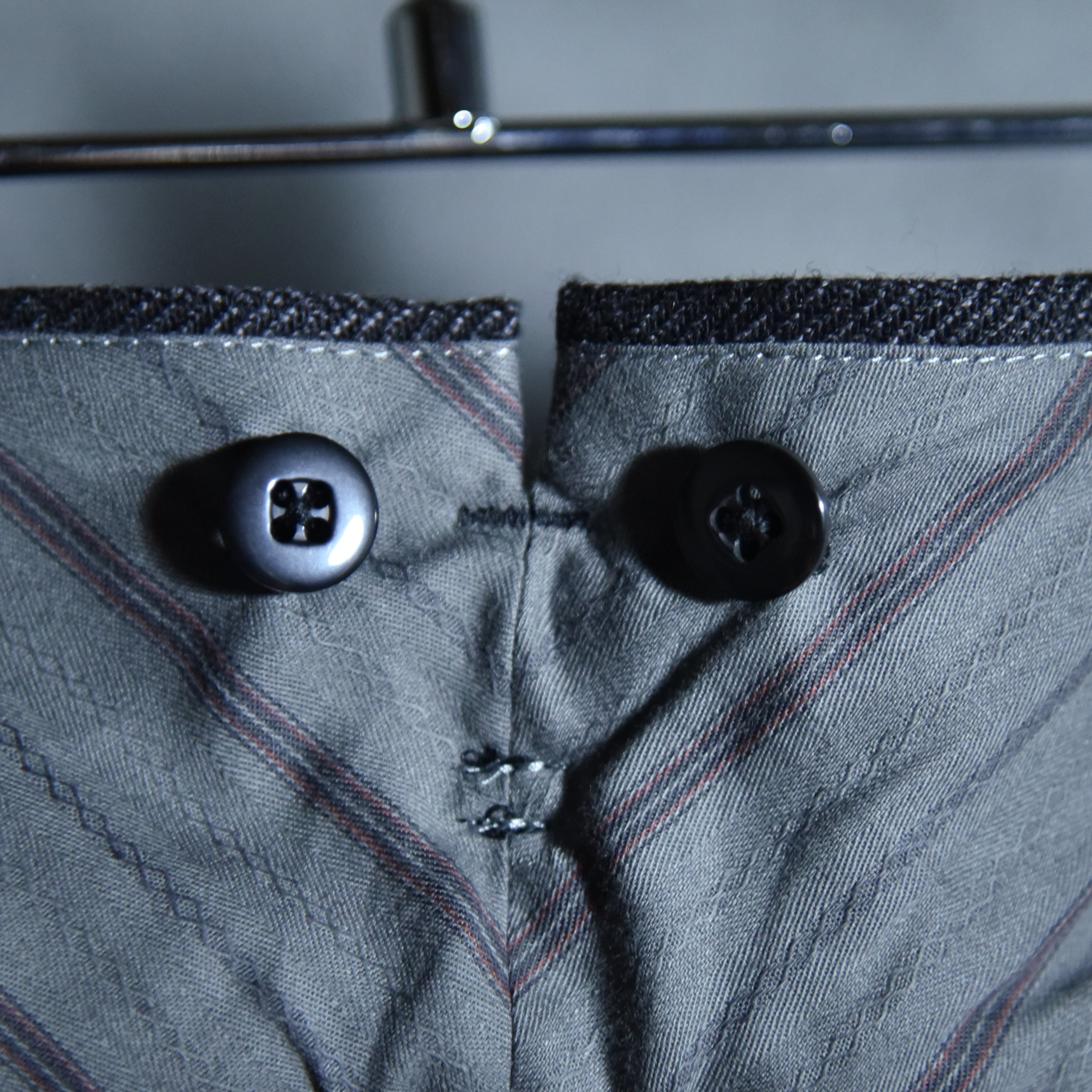 またトップボタンは水牛のから削り出したハーフマッドのナチュラルホーンボタン、ジップは通常スラックスにはエフロンを使用するところ、重厚感のあるメタルジップを採用しています。