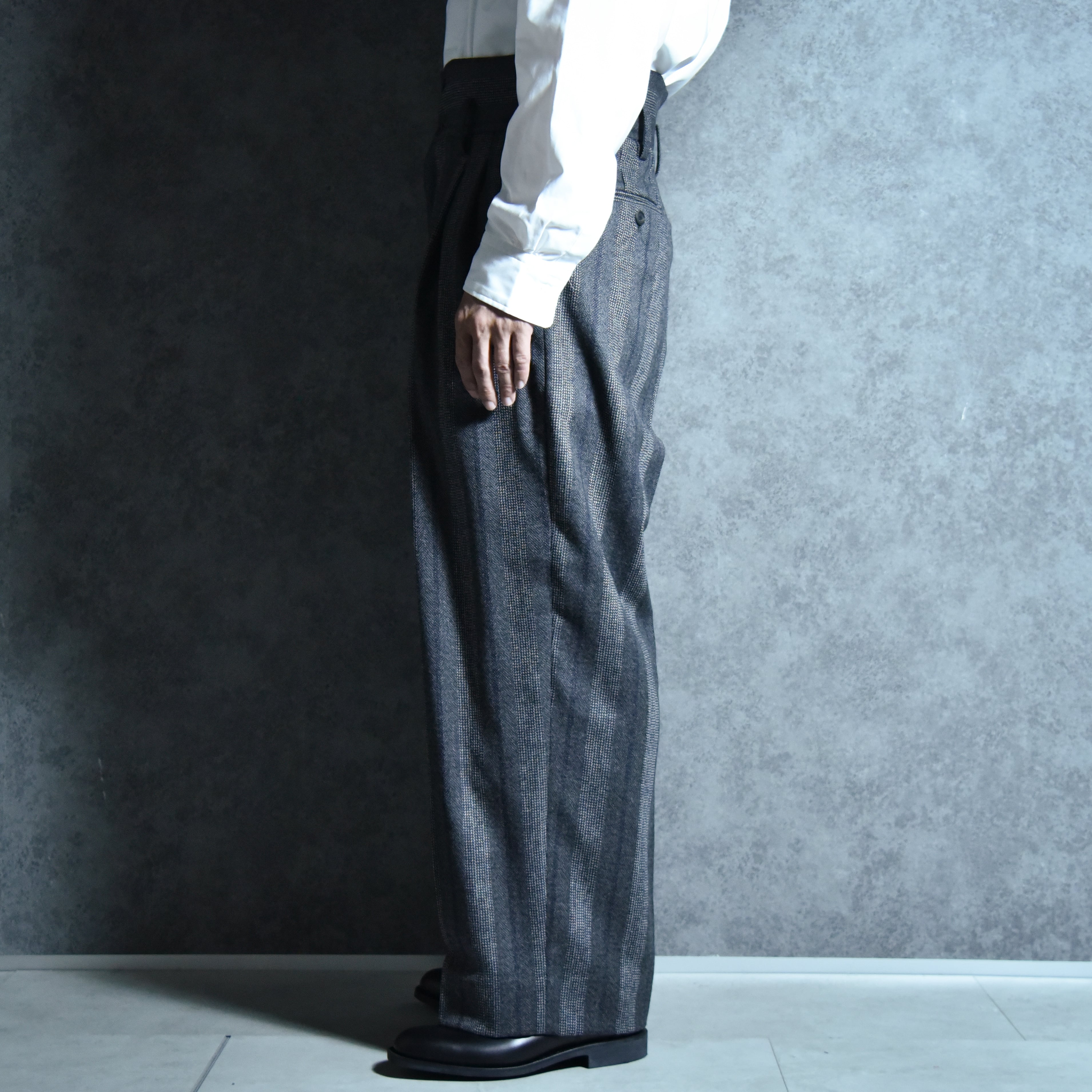 8cm太幅ベルトを配したハイウエストと、ツータックでワタリから裾までズドンと太いワイドシルエットが最大の特徴。
