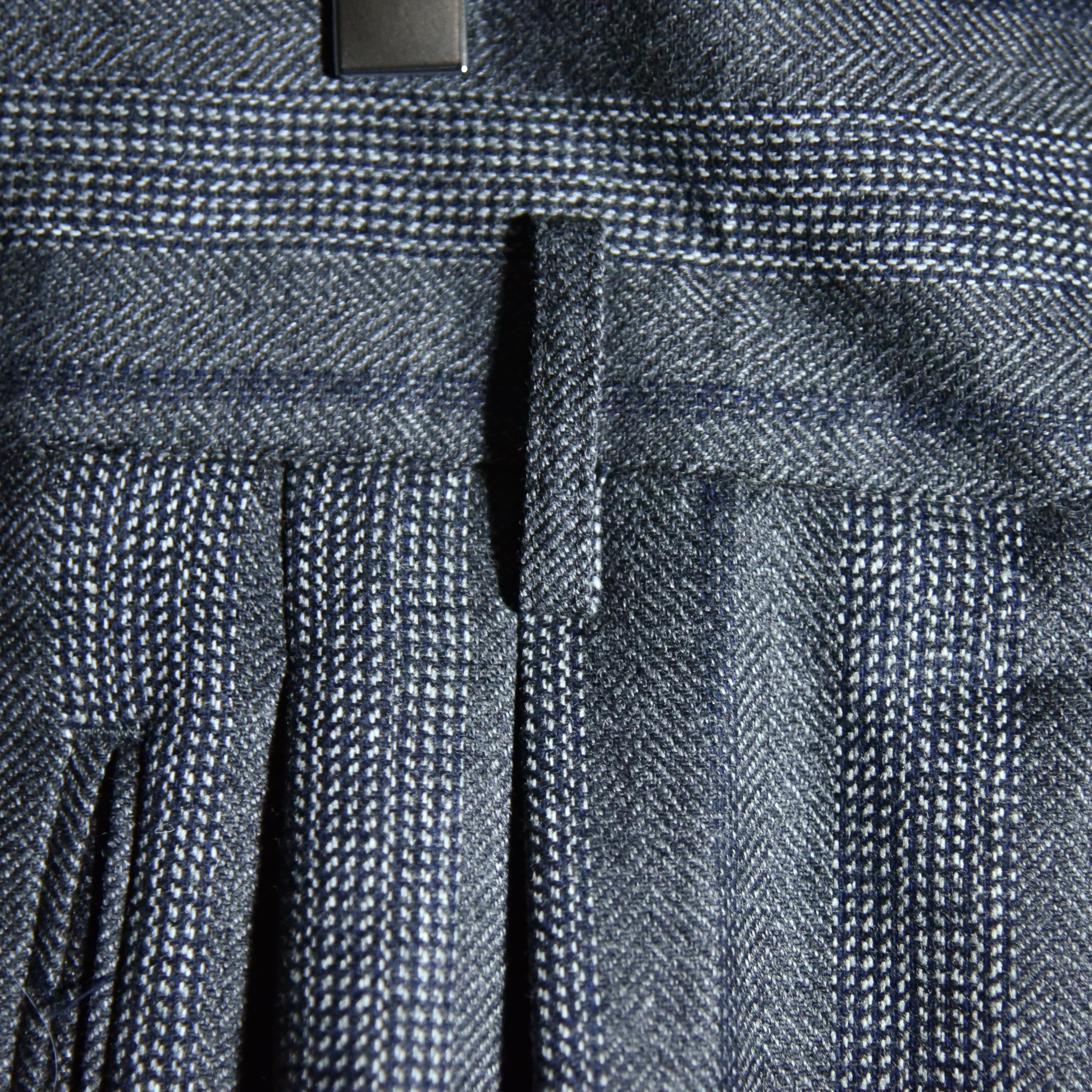 その他ウエストのサイズ調節が可能なサイドシンチや繊細な両玉縁のサイドの切りポケット、内側のサスペンダーボタン、ヒップにも細い両玉縁のピスポケットが付き、ベルトループはタックインの際に個性的なアクセントになるよう低めの位置に配置されているなど、オーセンティックでありつつ独創的なディテールが目を惹くデザインです。
