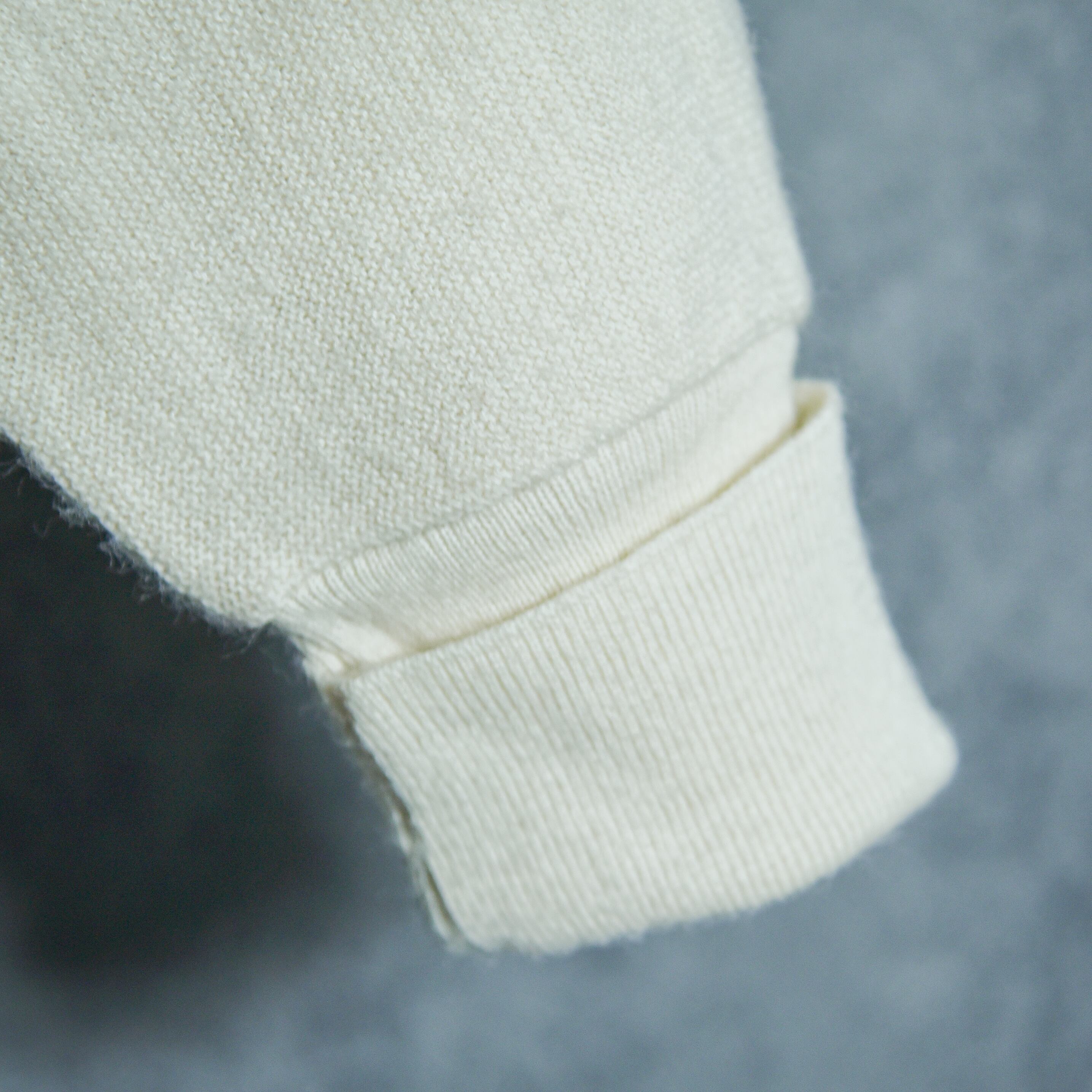 身幅やアームはゆったりとしており、ボックスのシルエットでサイドはシームレス、袖口はターンナップ、見返しは総針の仕様でハンドステッチなど現在では生産効率の悪さからあまり採用されない仕様。