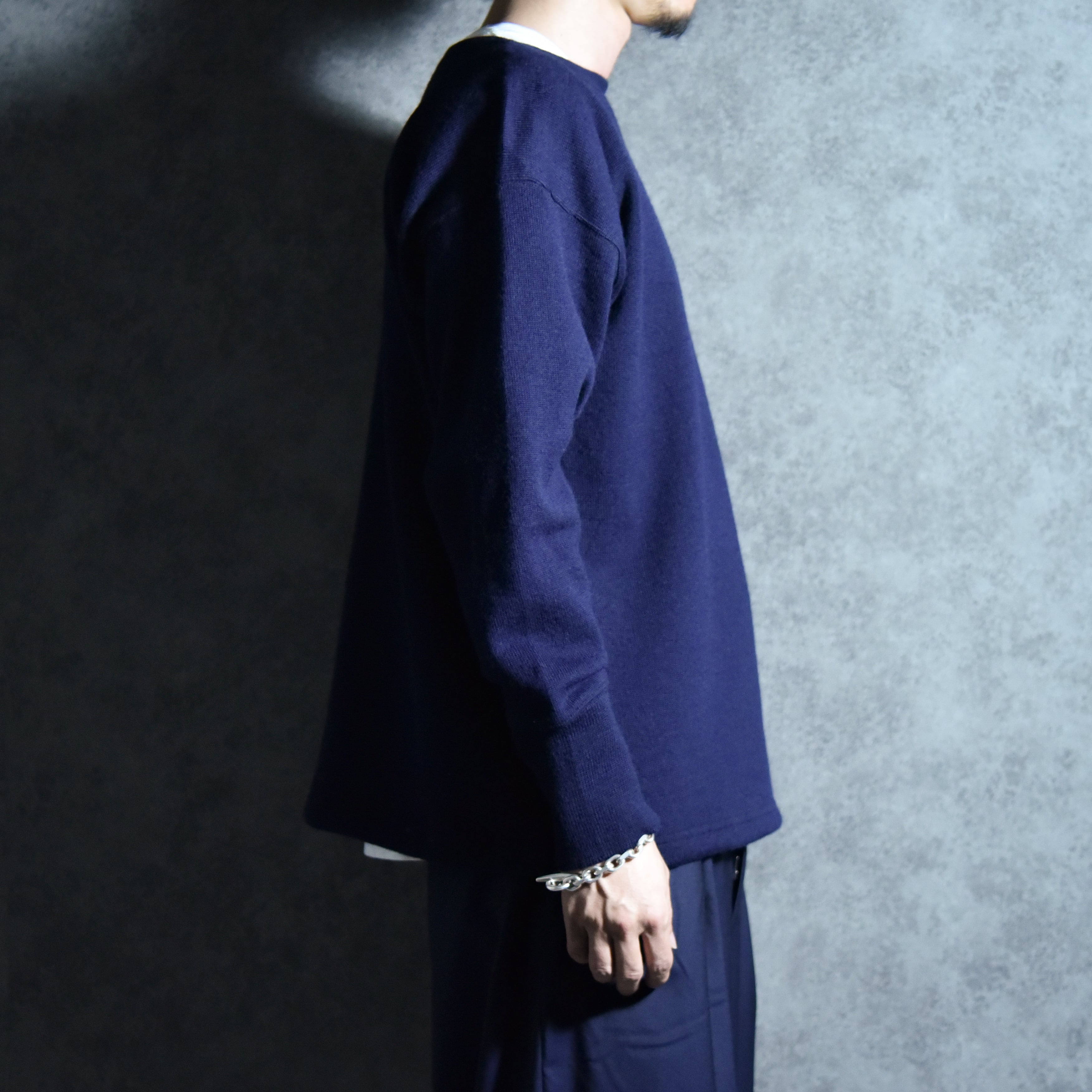 オーセンティックなボートネックに長めに作られた袖口のリブ、肩には内側に当て布がしてあり、ミニマルなコマンドセーターといった雰囲気のシンプルなデザインが魅力の一着です。