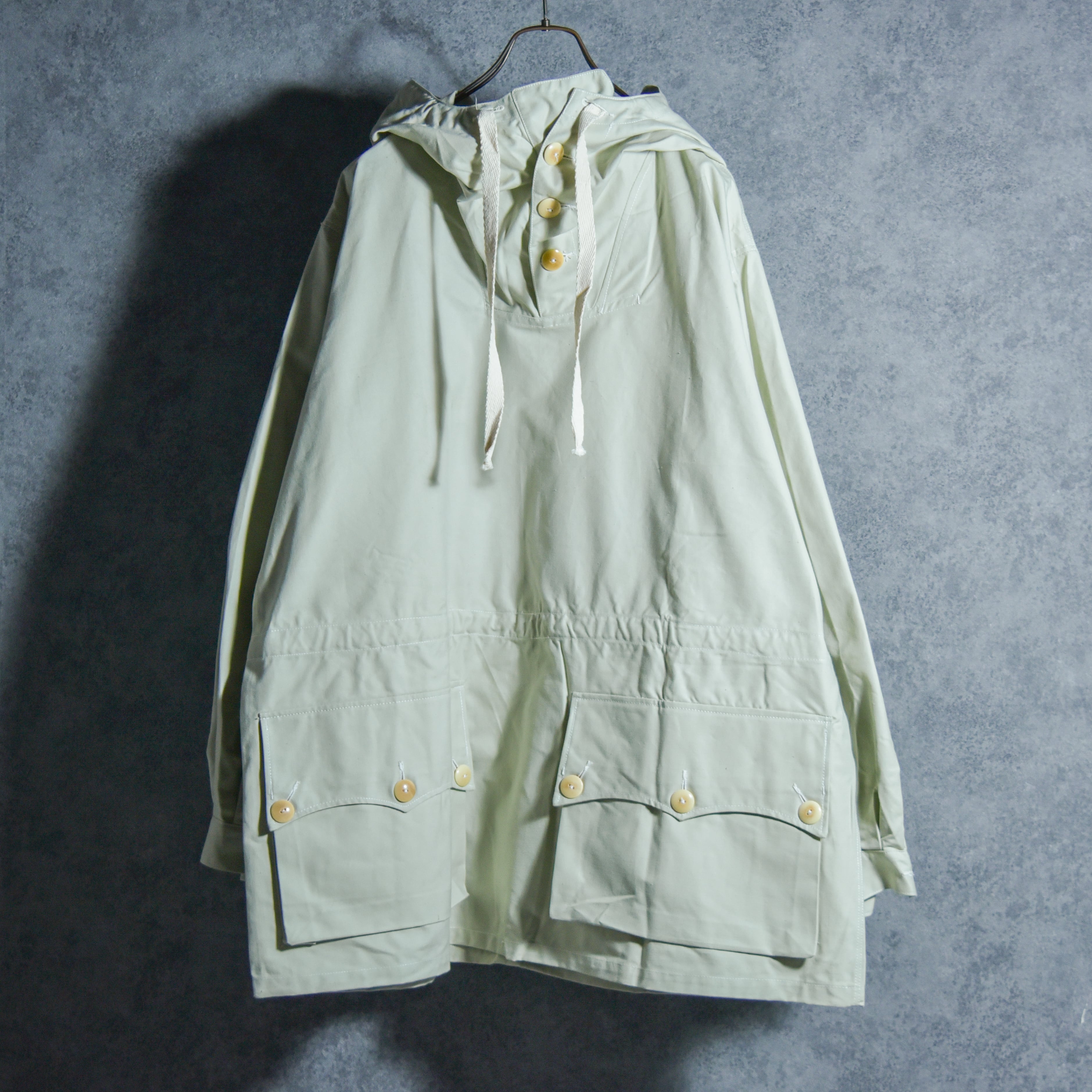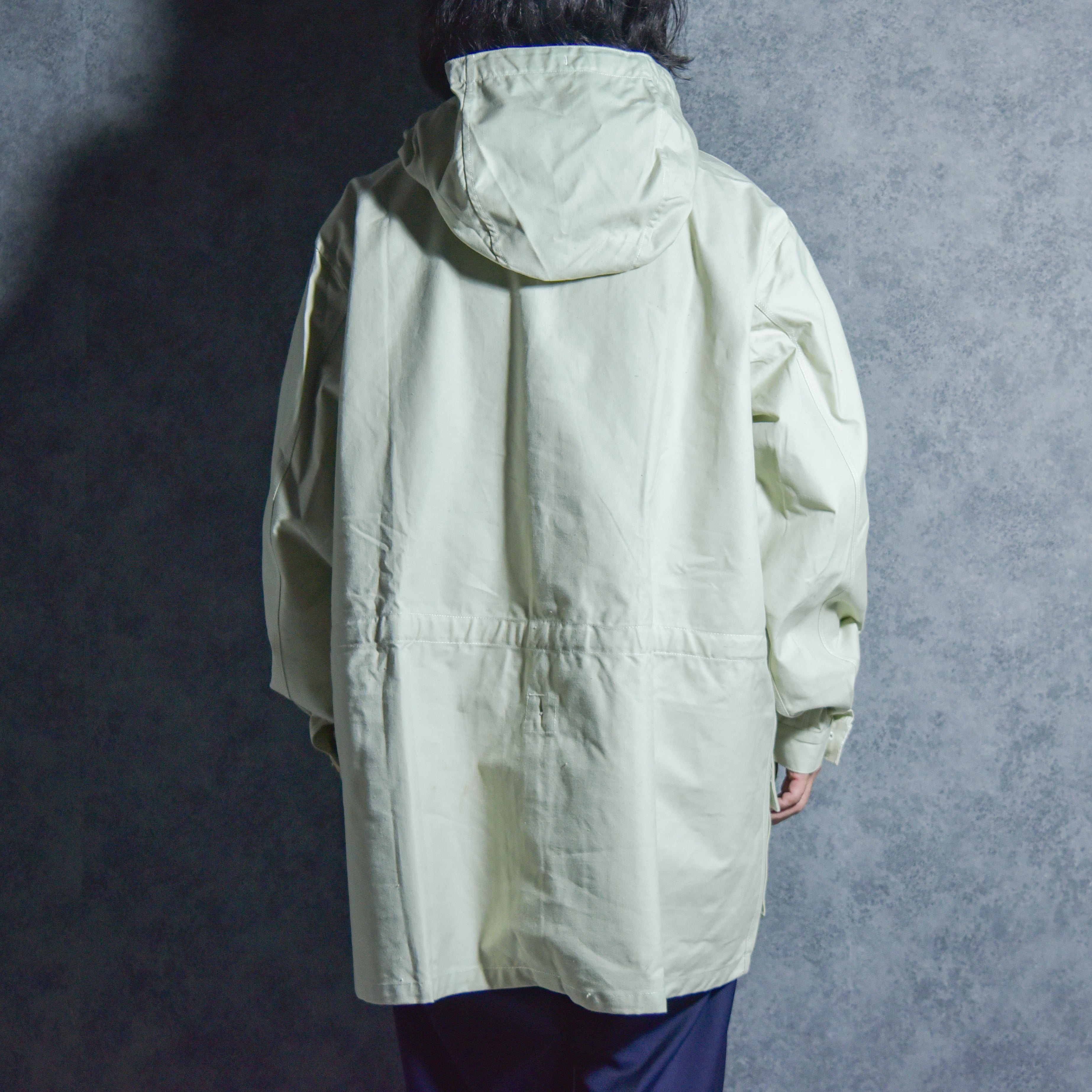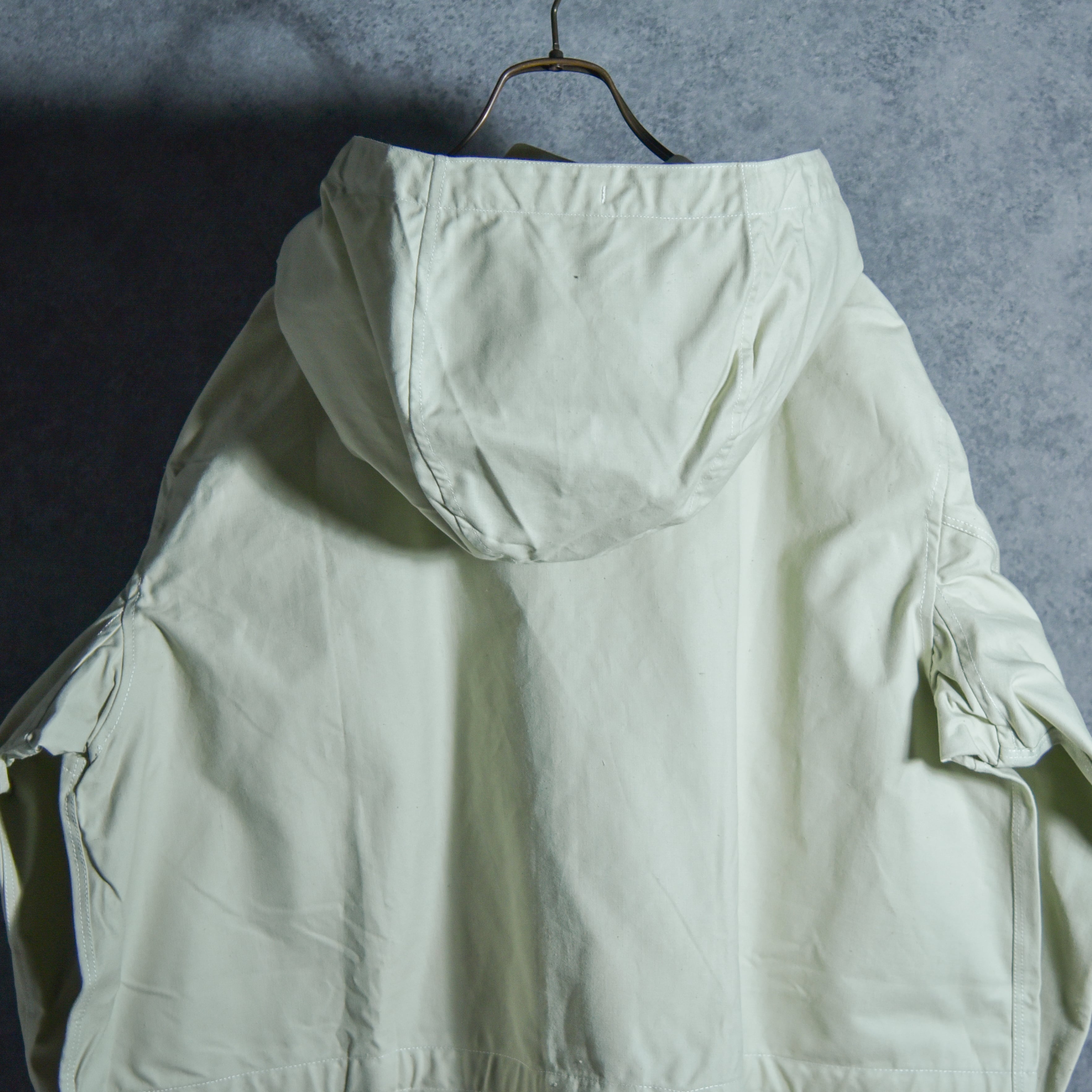 首元から顎にかけて覆える大きく立体的なパターンのフードに、特徴的なカモメ型のフラップとマチの付いたパッチポケット、太いアームを袖口で急激に絞り手首でホールドできるボタン開閉のカフスなど、今見ても新しさすら感じる完成されたデザインが魅力です。