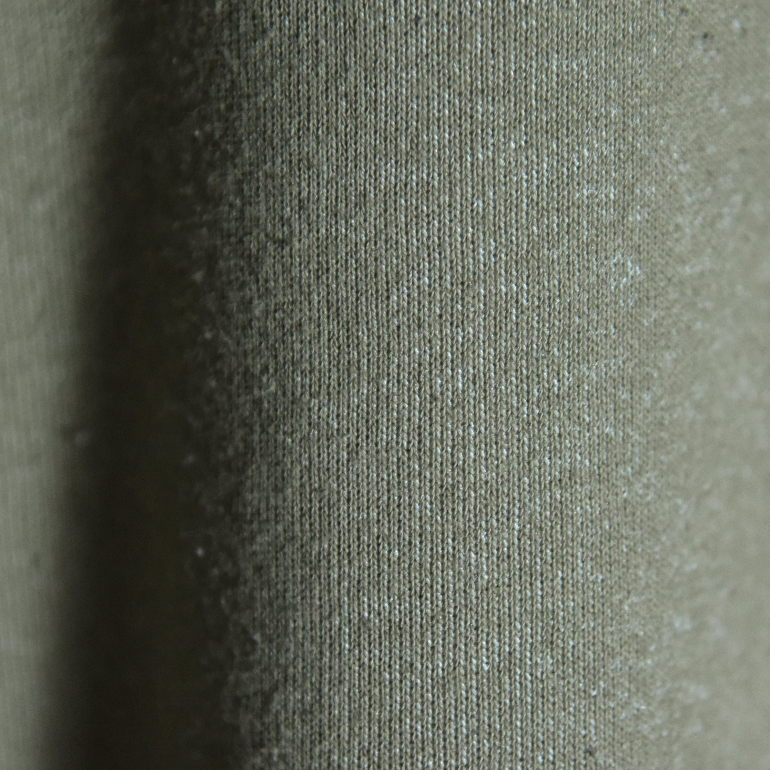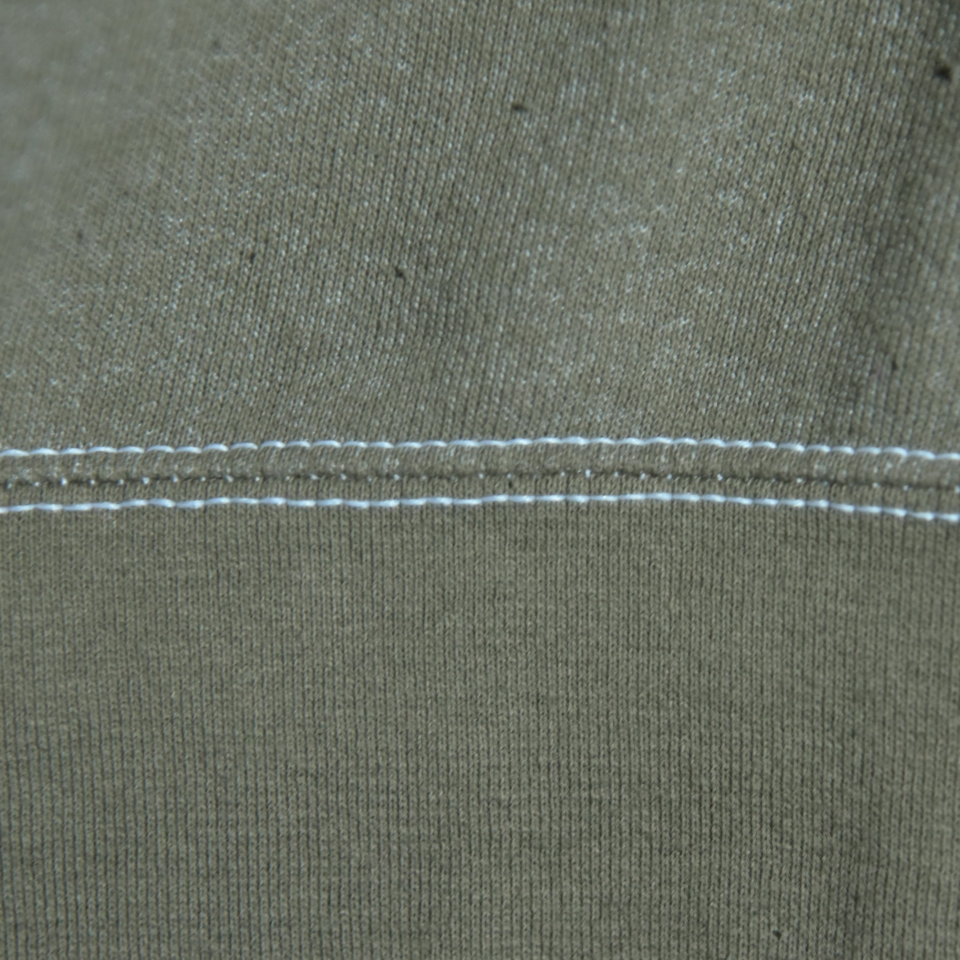 アメリカ企画のコットン50%×ポリエステル50%の粗野でざっくりとした風合いのものが馴染み深いかと思いますが、ユーロラインはコットンが80%でふんわりと柔らかさがあり、裏起毛で温かみはありつつ軽い着心地が特徴で、製品染めのため配色ステッチも程よく効いています。