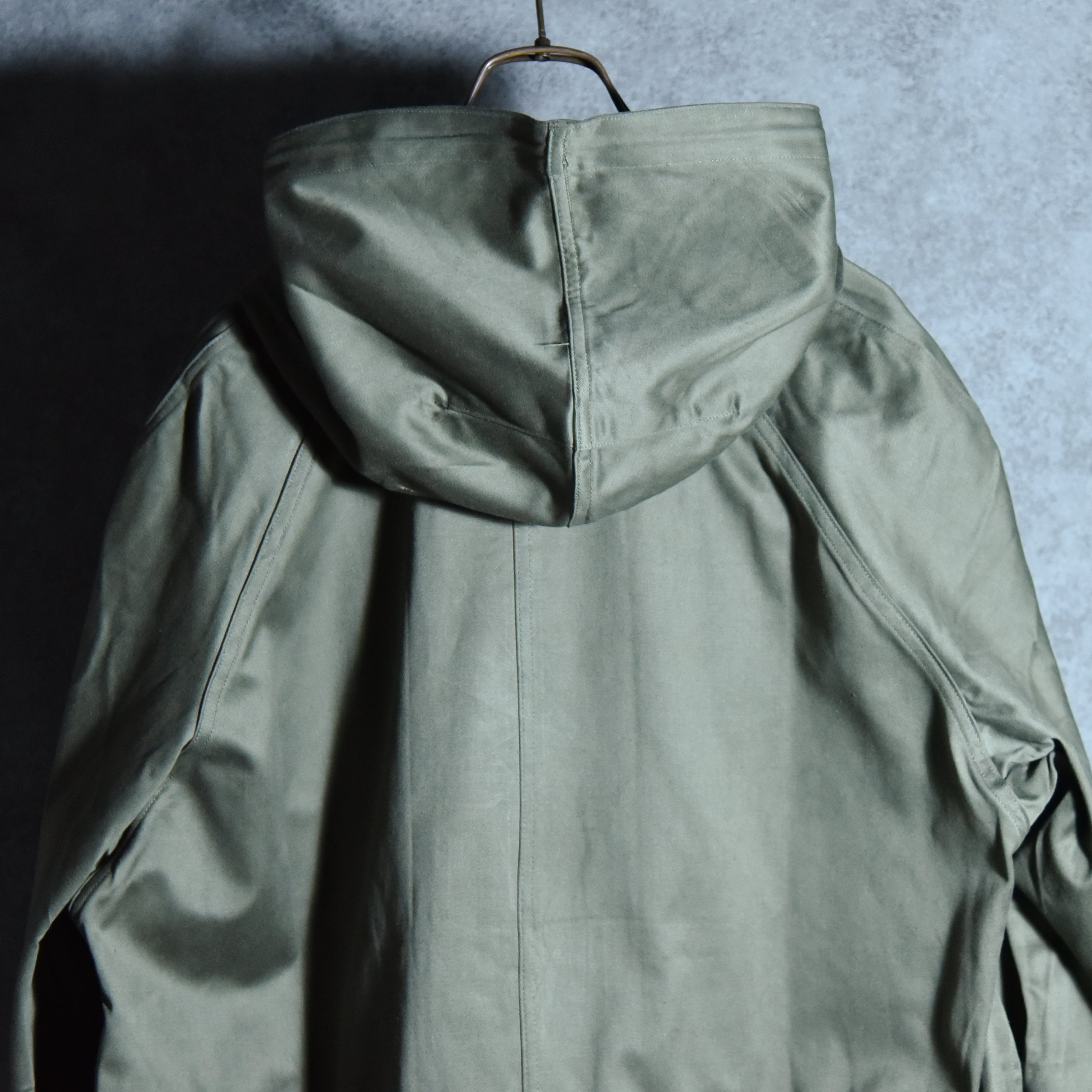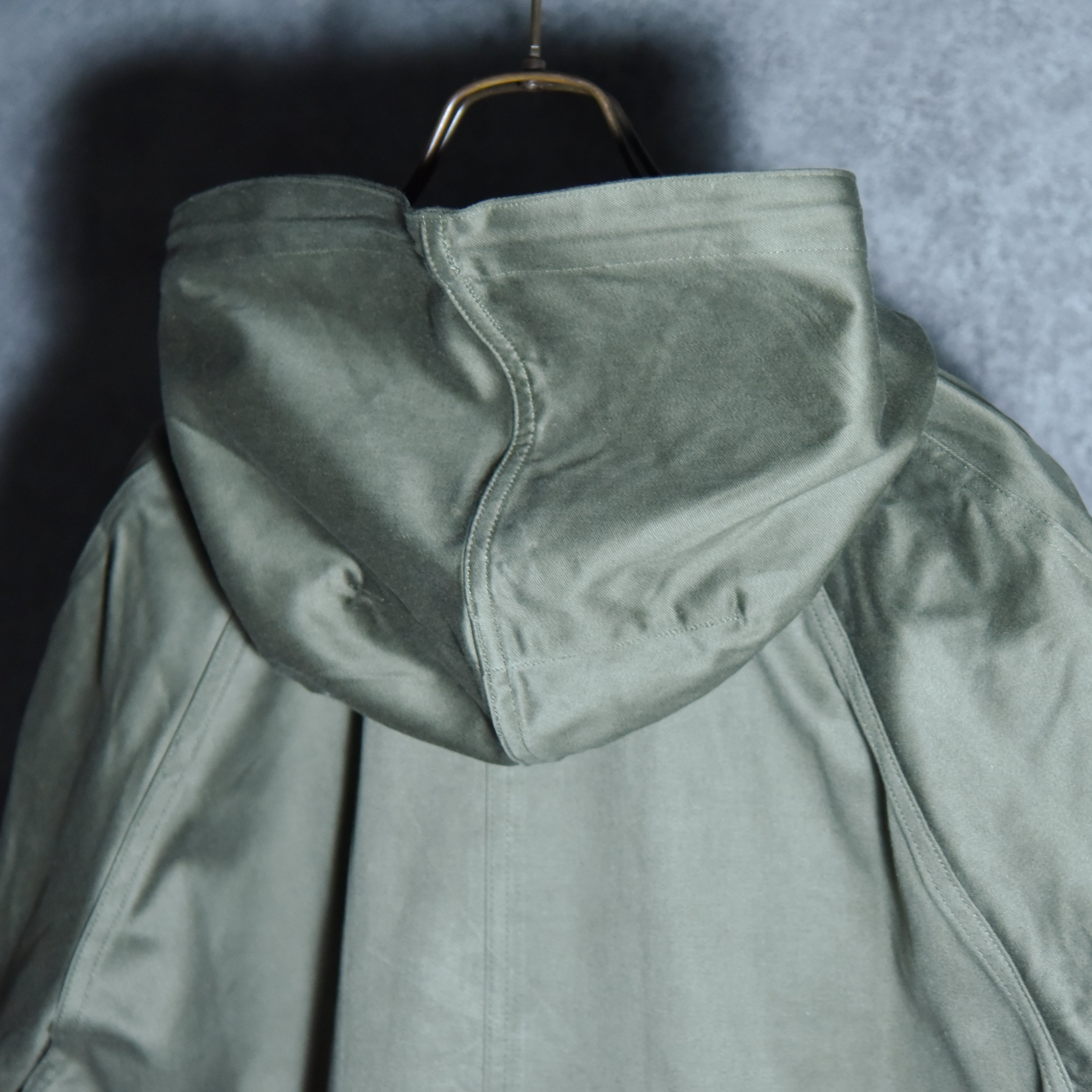 ファスナーと比翼ボタンのフロントにボリュームのあるフード、ゆとりのある身幅でAラインのシルエット、左袖に入る雰囲気のあるステンシルなど、デザイン、サイズ感、細かな意匠、どれを取っても完璧な1着です。