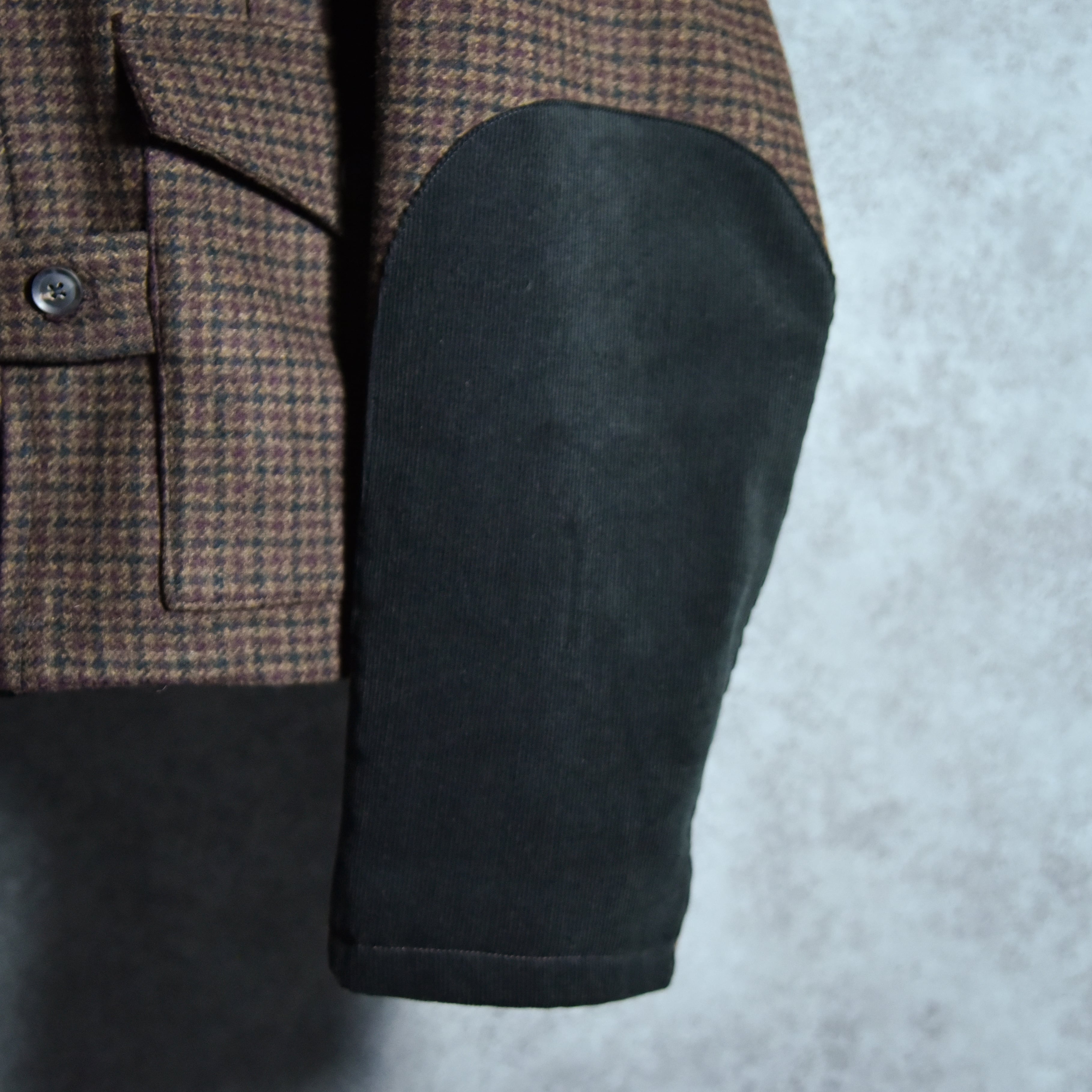 1870年代頃から着用されてきた歴史がある英国スポーツジャケットの代名詞的な存在で、ラペルのついたテーラード型が本流であるところ、大胆にもショート&ワイドの、謂わばアメリカ的なハンティング要素がミックスされた特徴的なルックスの一着。