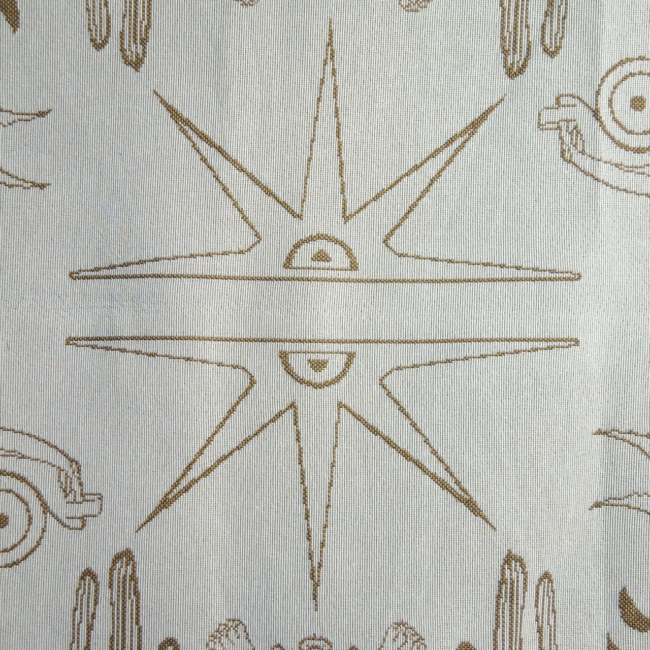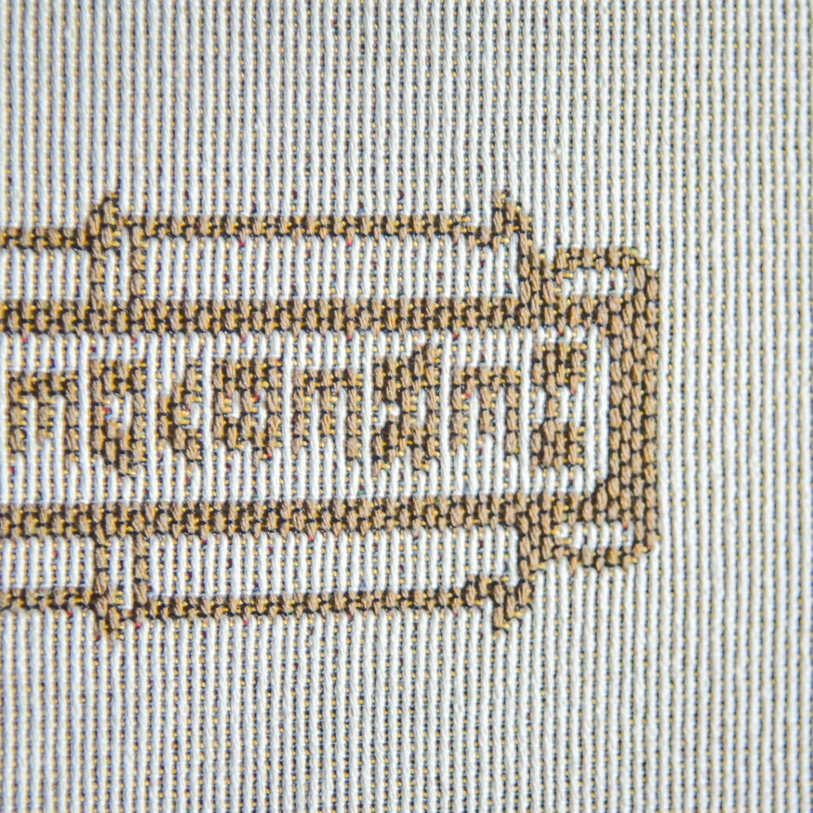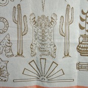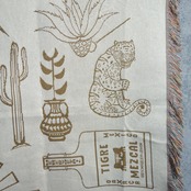 タイガーや車、サボテンなどのメキシコに群生する植物などが散りばめられた、オーセンティックかつポップな織柄が目を惹く一枚。