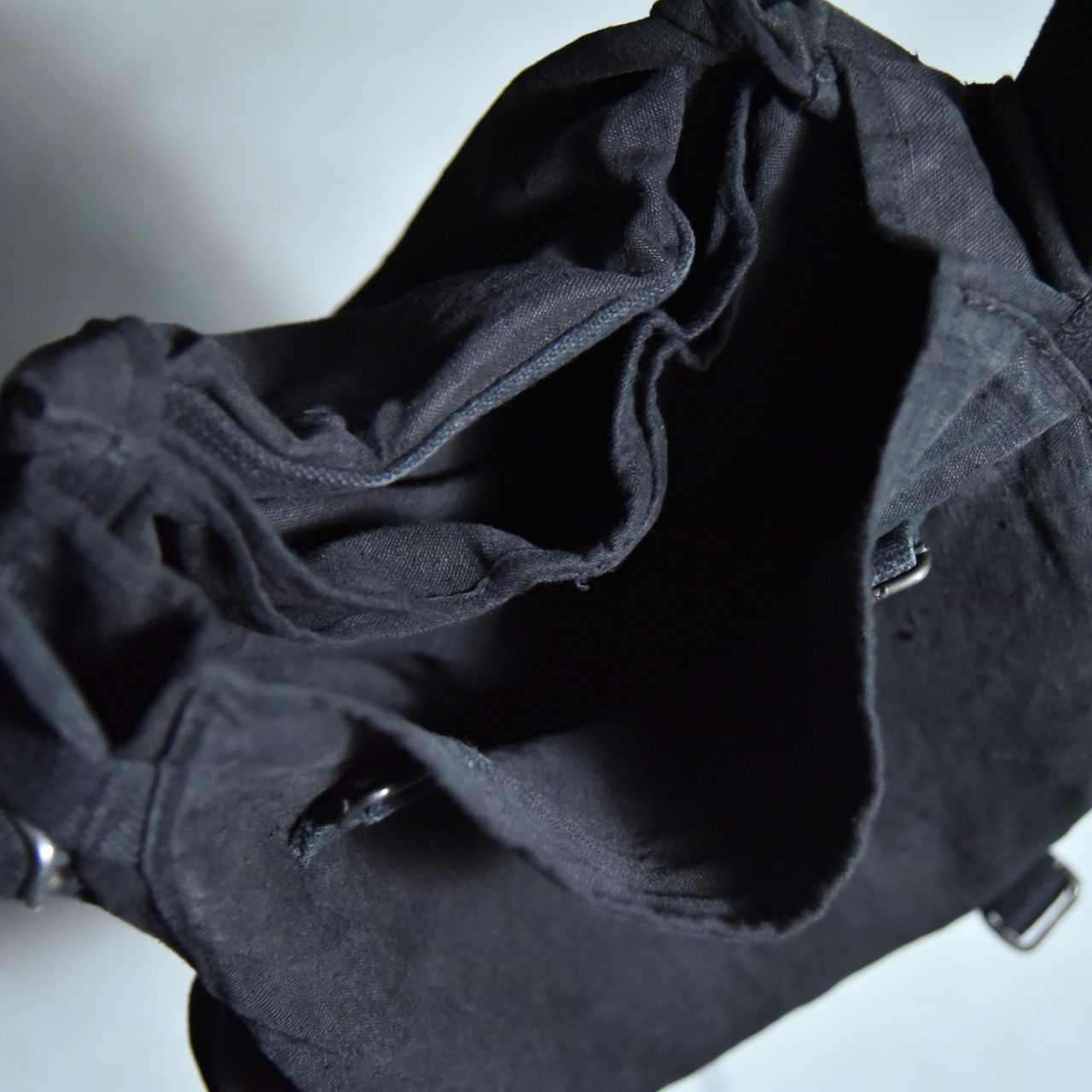 素材はコットンリネンキャンバスが使われ、この年代ならではの素朴な風合いと頑強さを兼ね備えた雰囲気のいい生地で、本来はカーキですが、黒染めをする事で落ち着いた印象に仕上がっています。