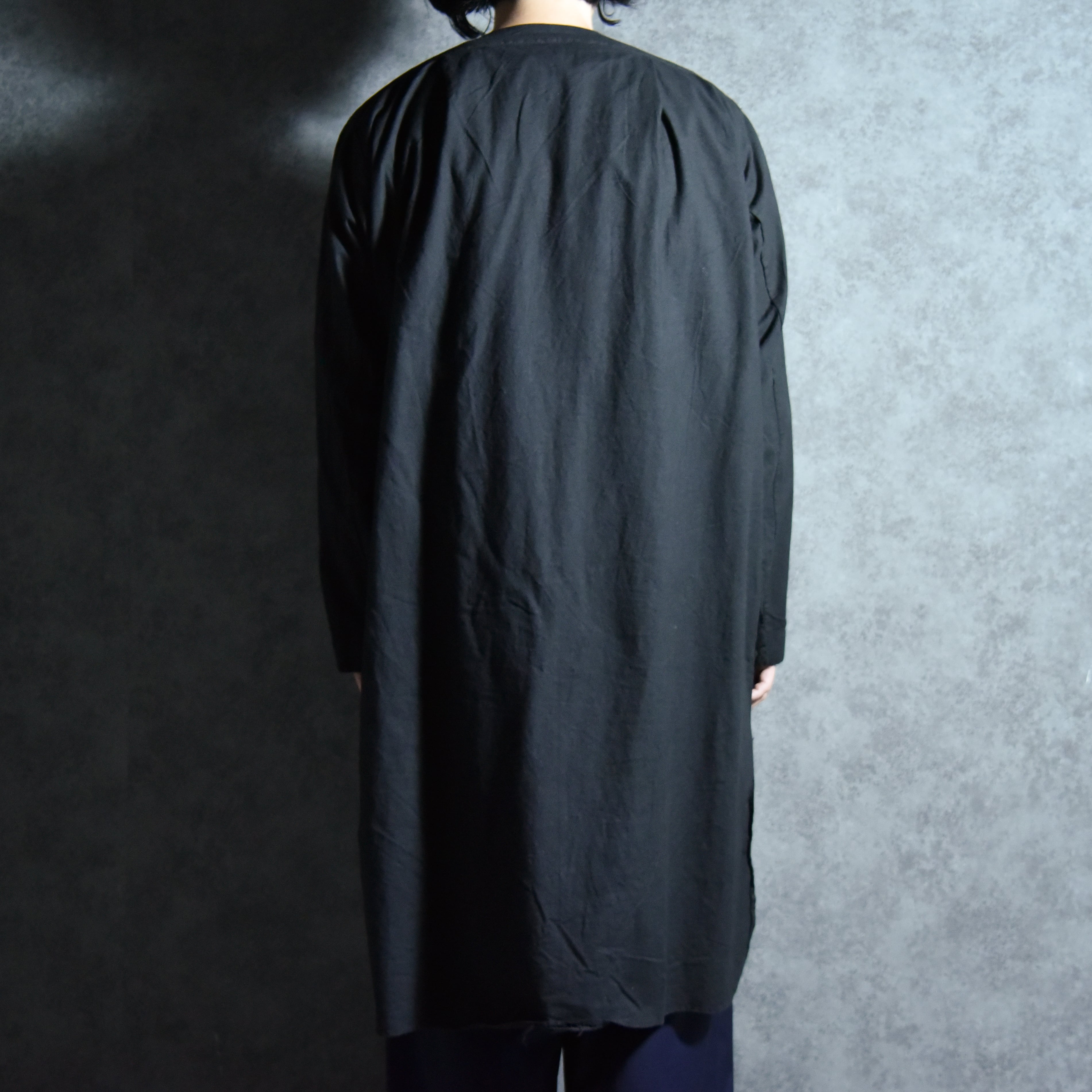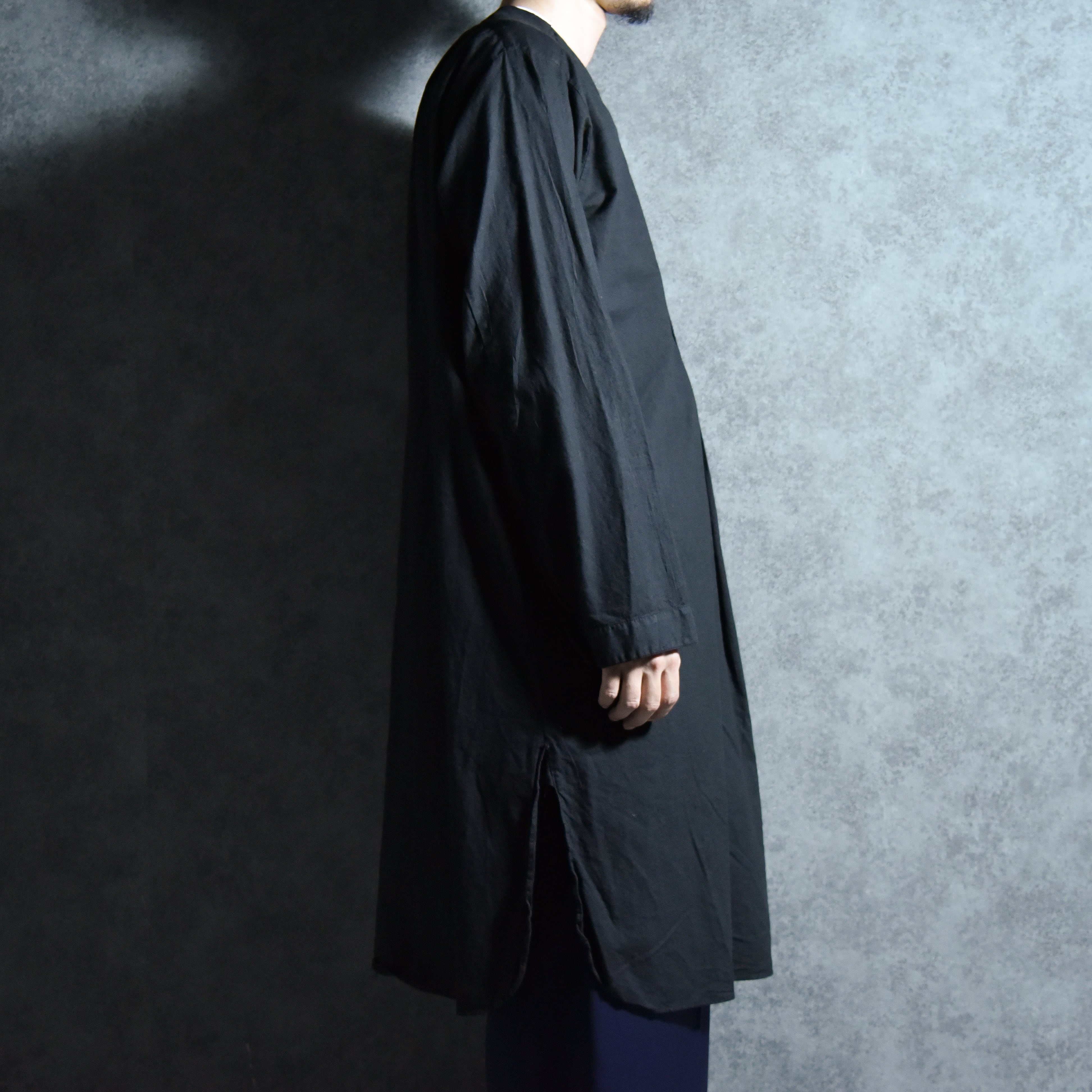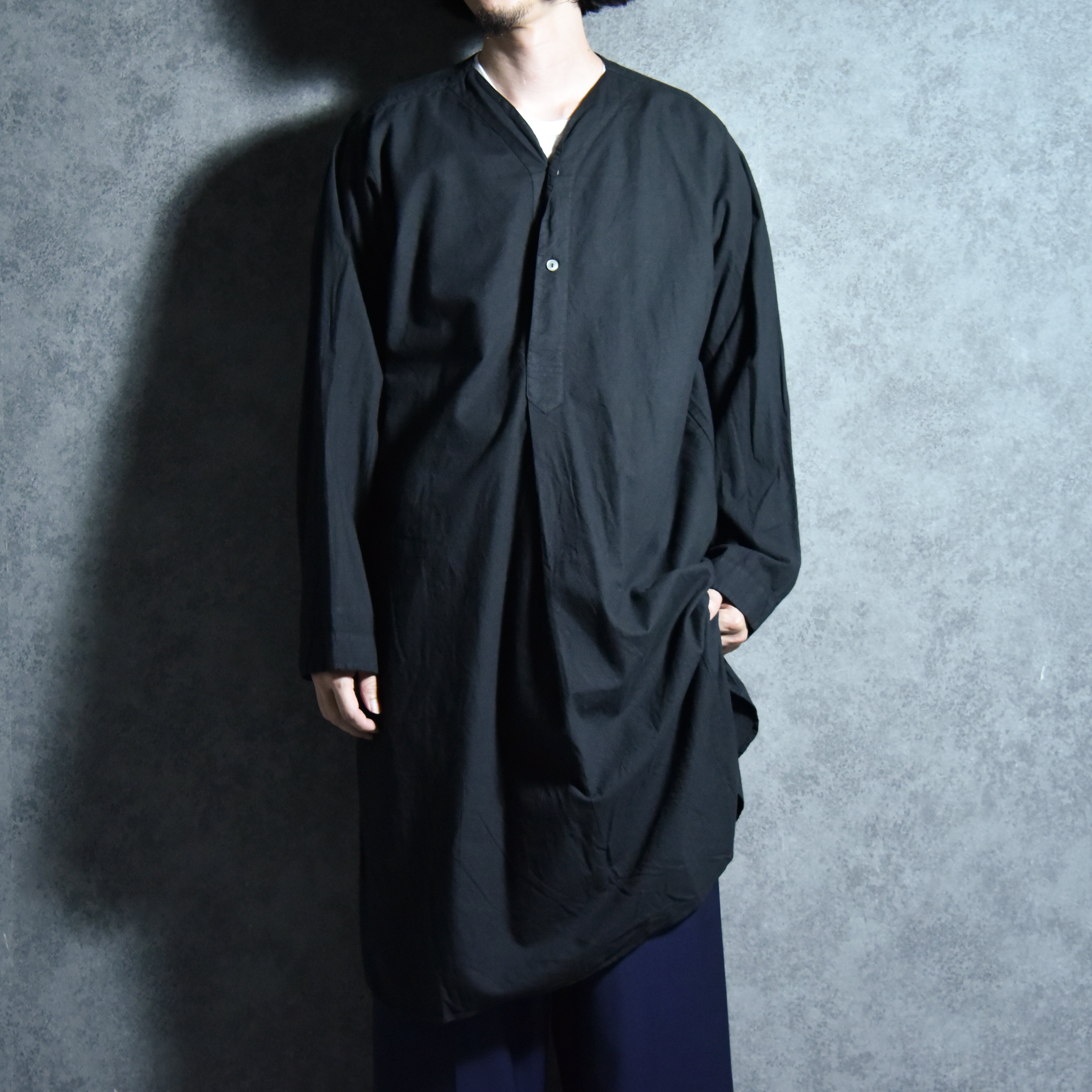 膝まであるロング丈で首元はVヘンリーのハーフプラケット、深めのスリットが印象的なロングシャツ。