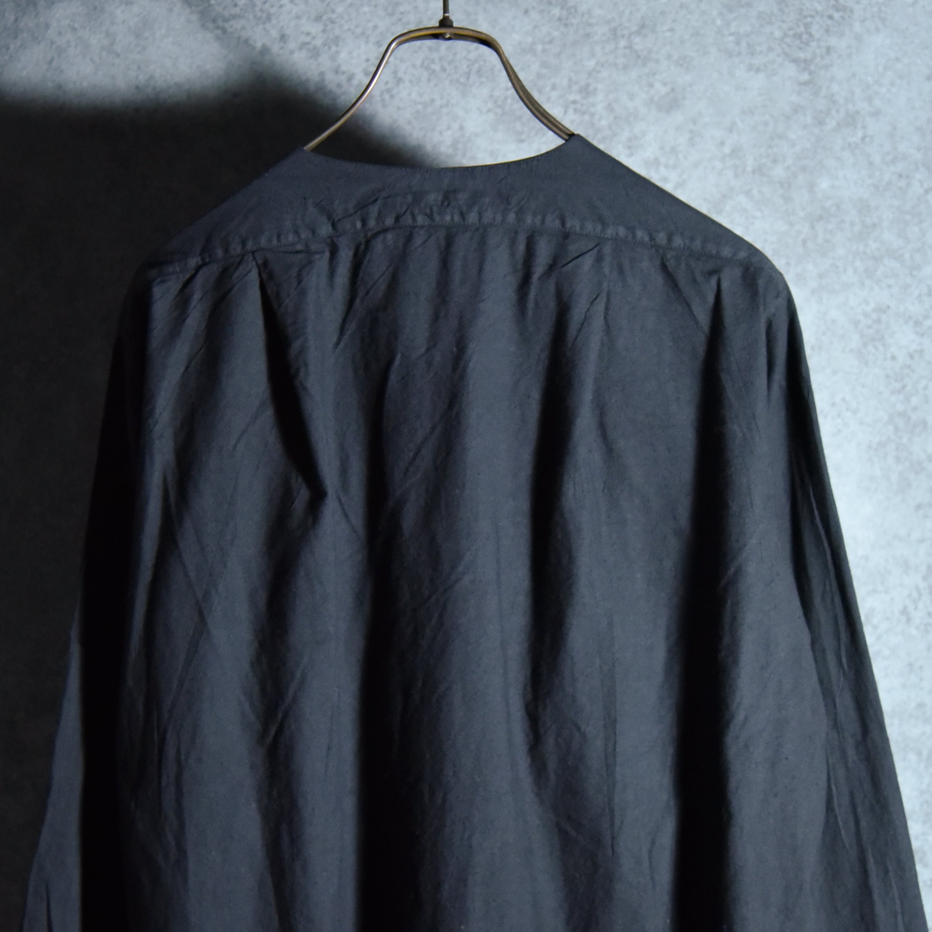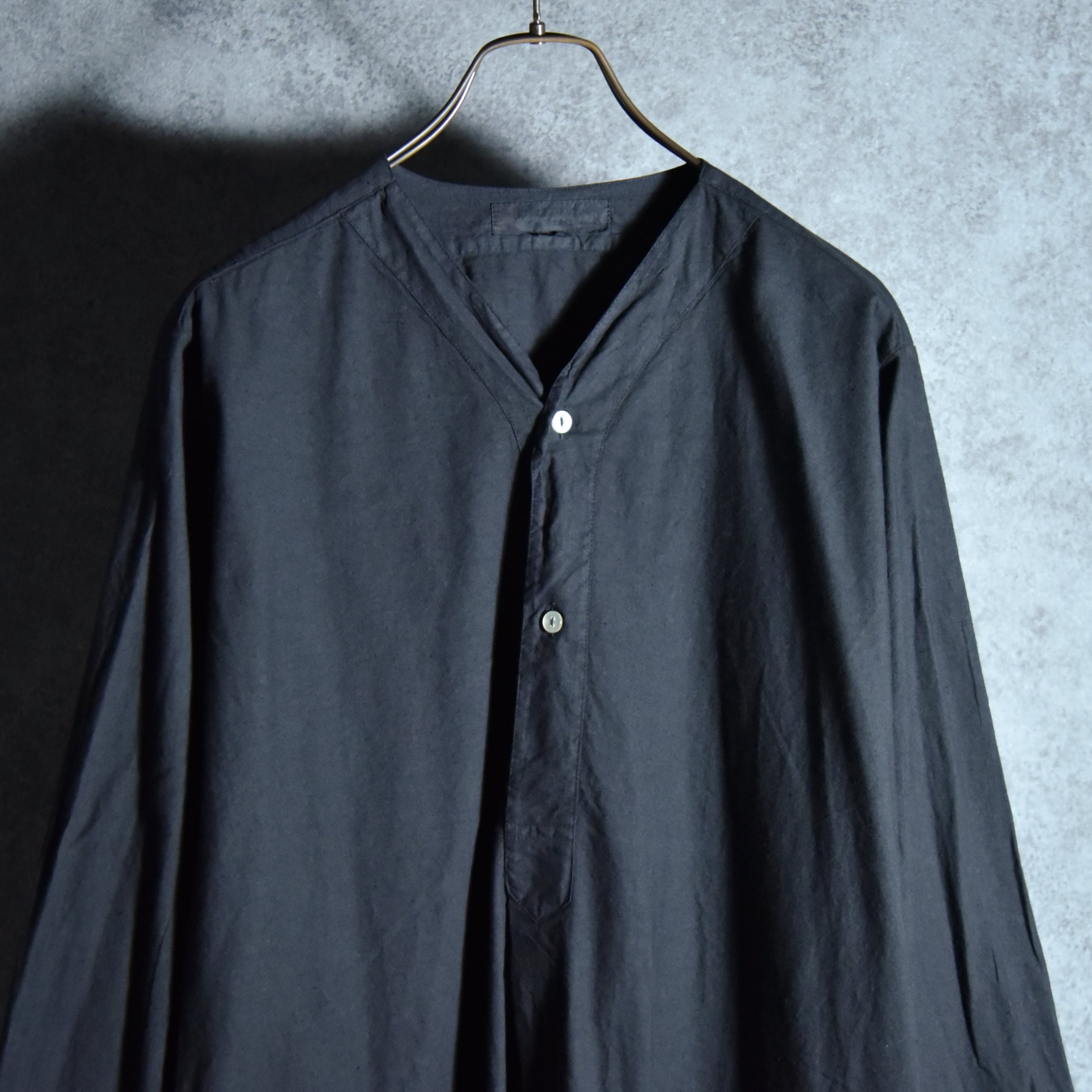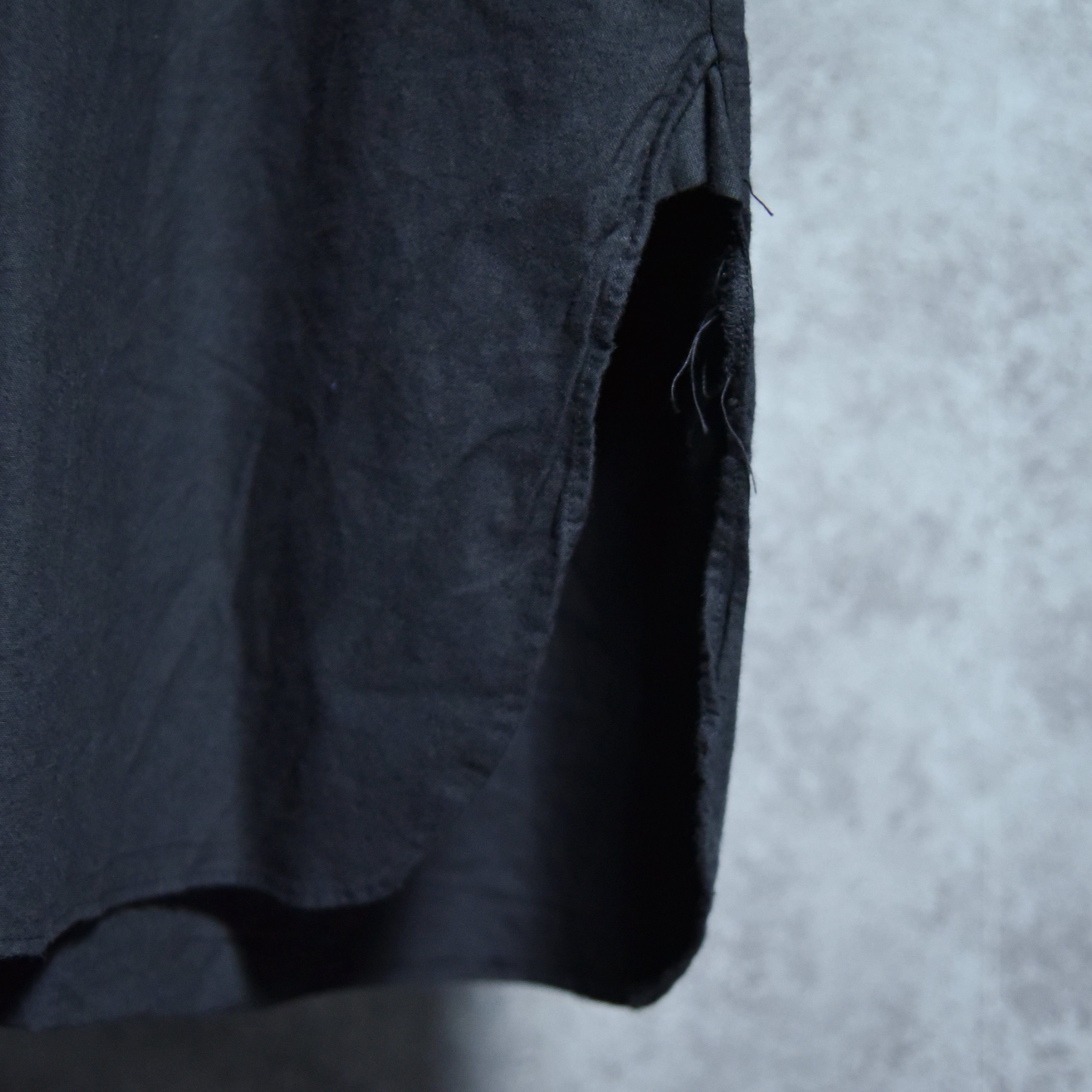 膝まであるロング丈で首元はVヘンリーのハーフプラケット、深めのスリットが印象的なロングシャツ。