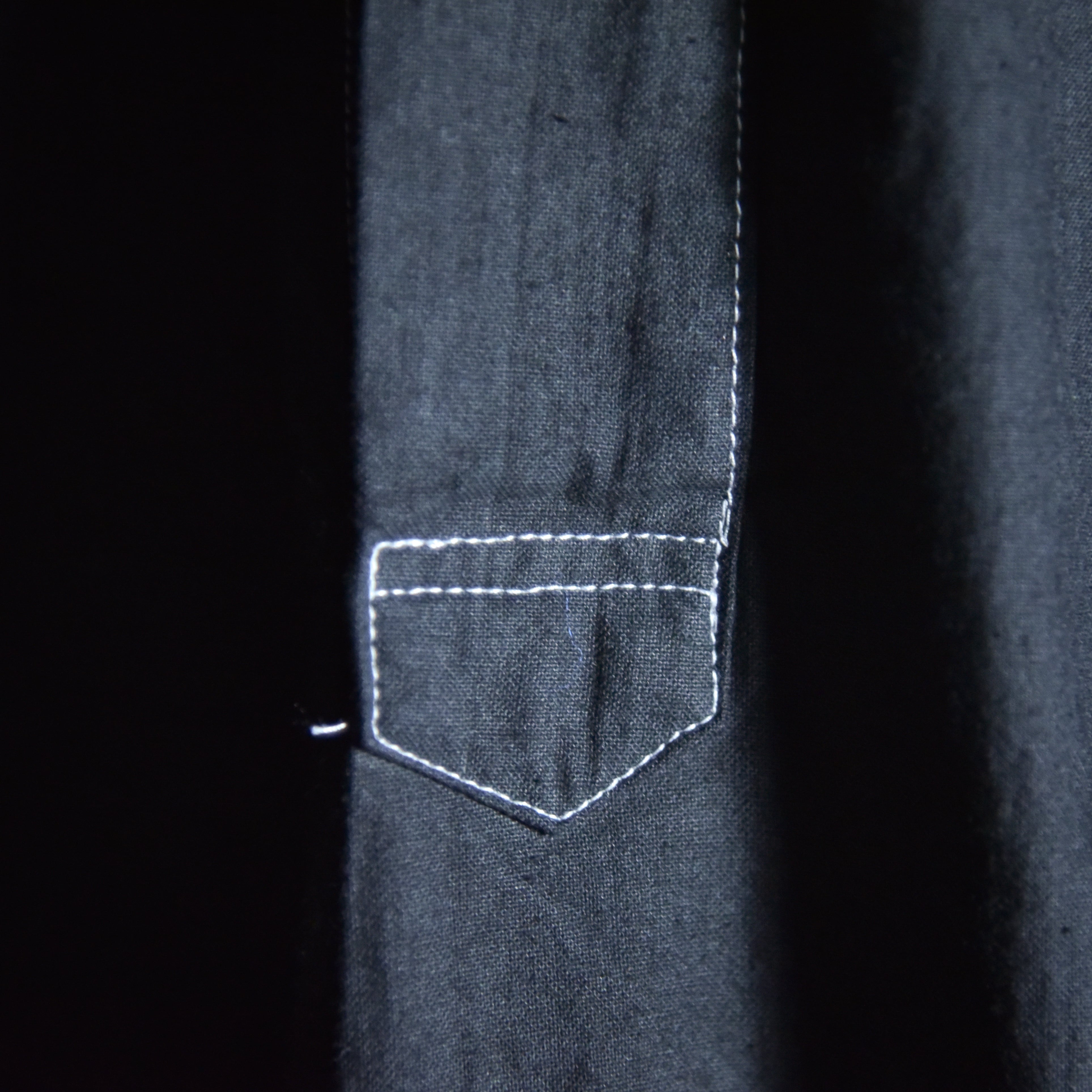 15-16枚目のようにポリエステルの糸が染まり切らずに身生地のブラックとコントラストの効いたホワイトステッチ、綿糸で生産され全てブラックに染まったブラックステッチと2種類ございます。