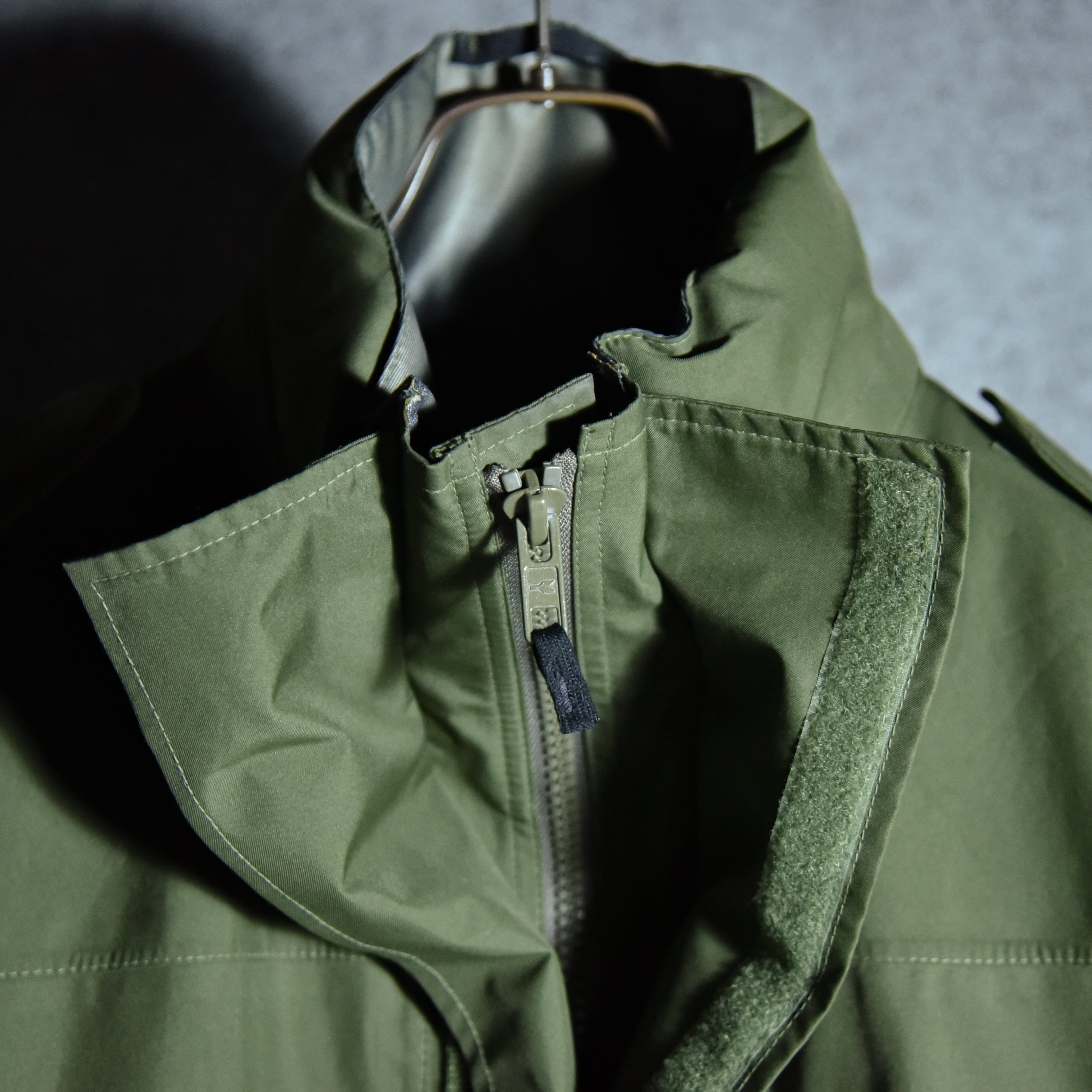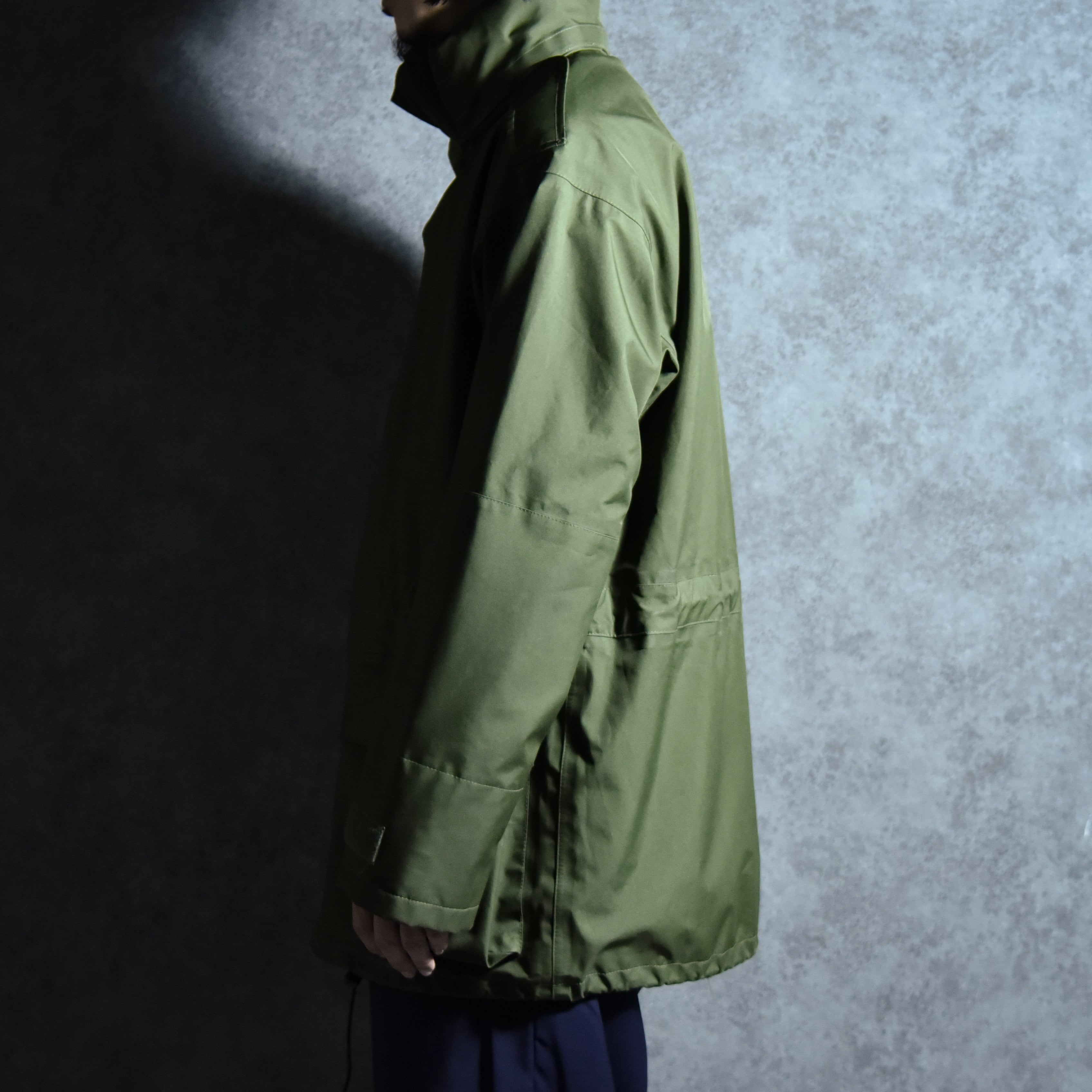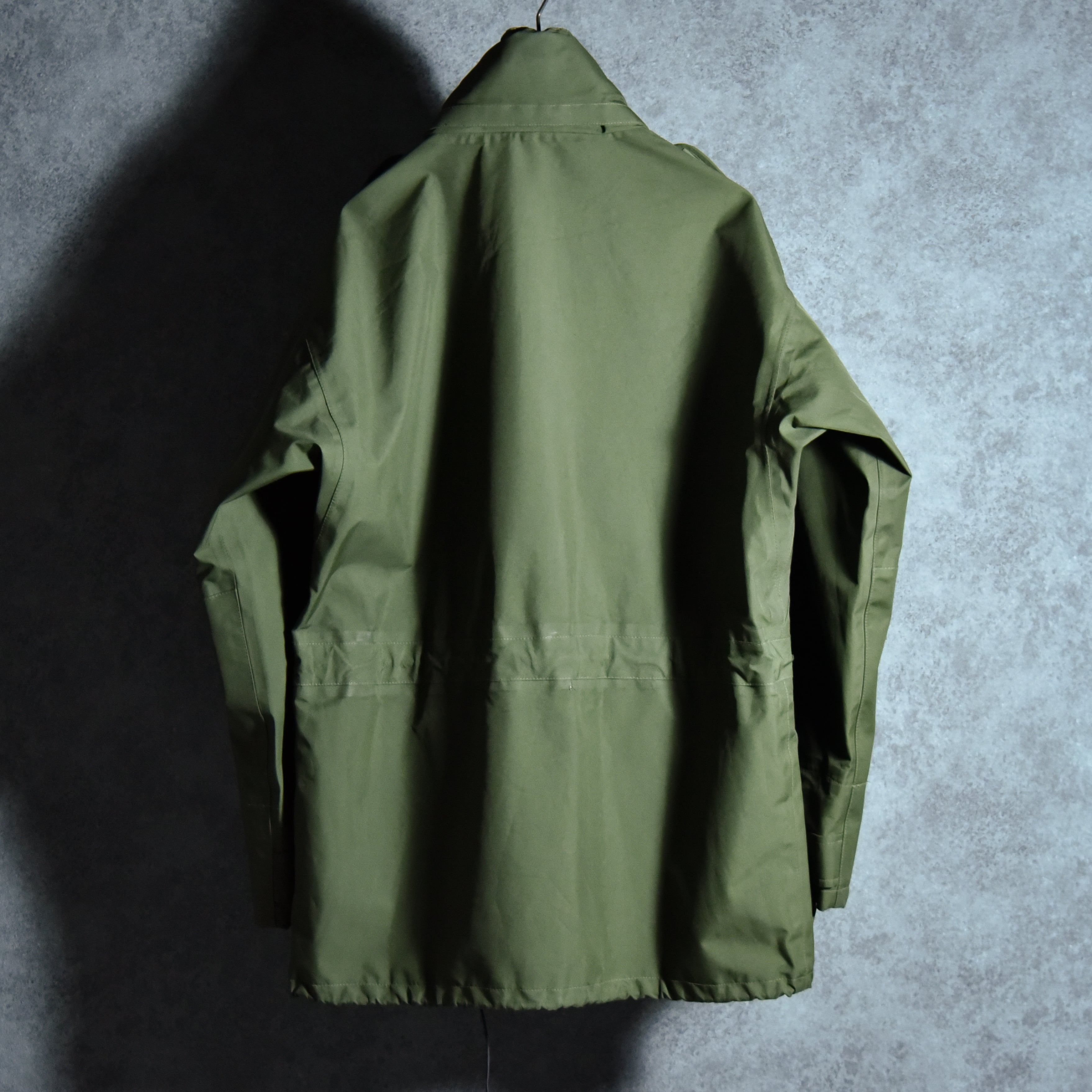 イギリスの海兵隊で採用されていたモデルで、ナイロンボディに浸透防水性フィルムをボンディングし、さらに防水テープで全てのシームを処理した、ゴアテックスと同等の機能を有した近代ミリタリーの技術を惜しみなく注ぎ込んだ名作です。