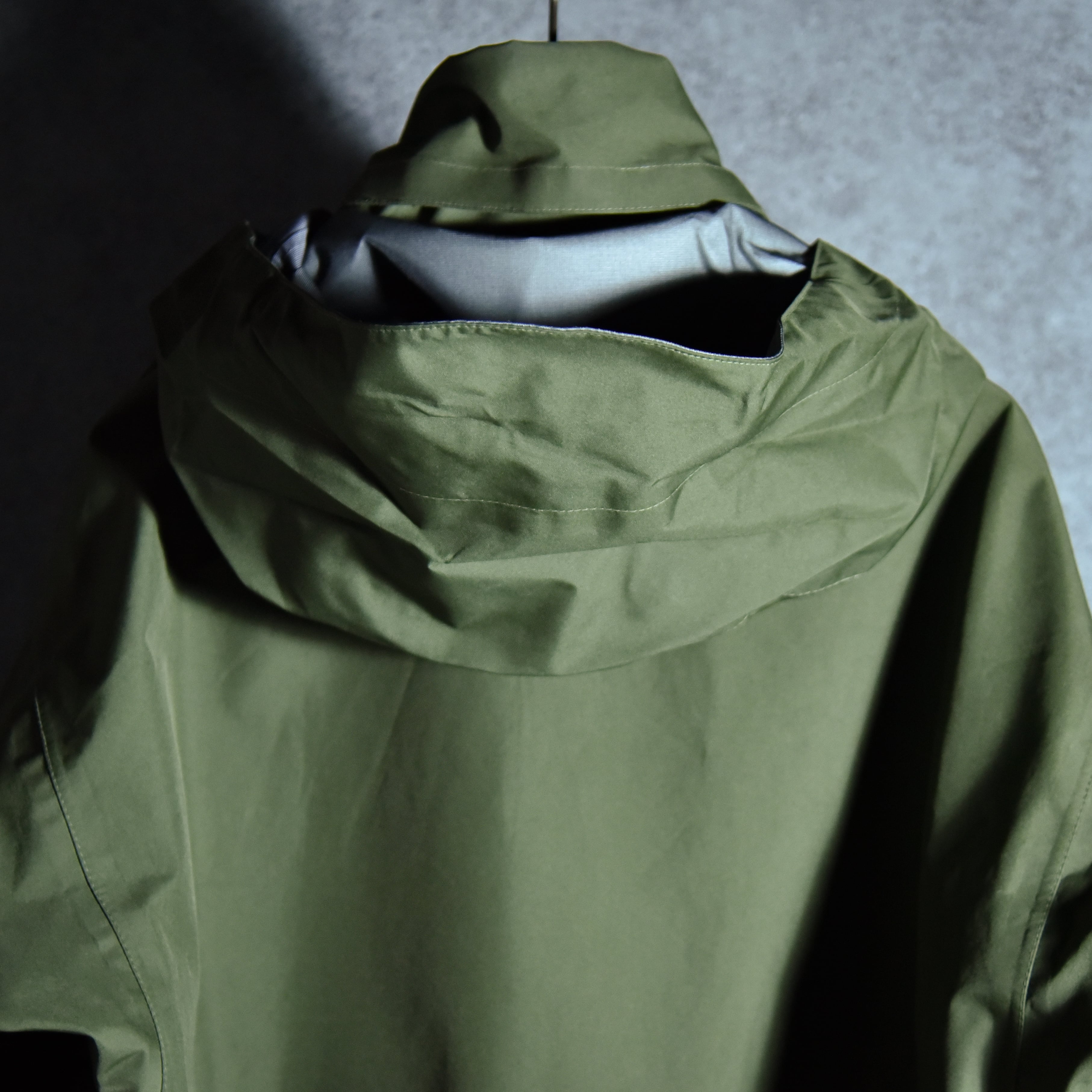 両腰に特徴的なマチ付きのパッチポケットが配され、スタンドカラーの内部にフードを収納、袖口はベルクロで締めることができ、ウエストも内側のドローコードで調整可能で、さらにフロントはジップ開発に加え上前と下前、ジップ裏のウィンドストッパーの三重構造で風雨を完全にシャットアウトしてくれます。