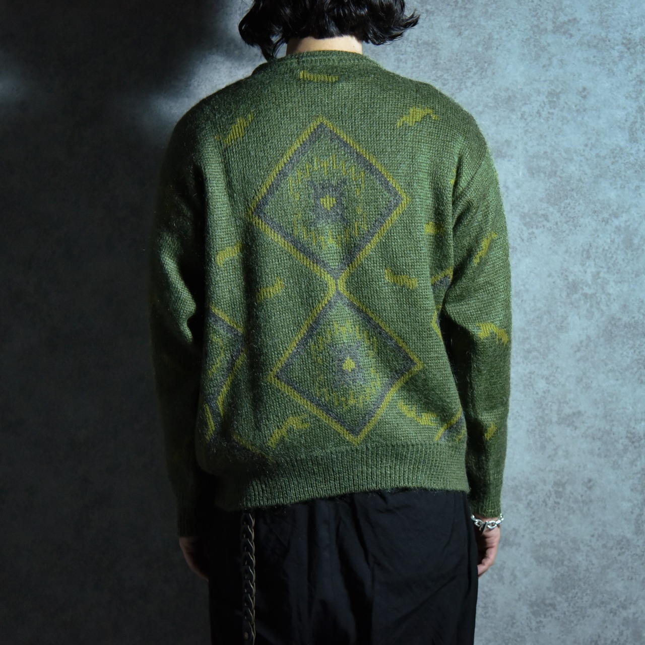 ジオメトリックのようなデザイン、毛足の長いモヘヤのミックスされた糸によってくすんだカラーながら生地全体に光沢と艶のある上品な印象のセーターです。