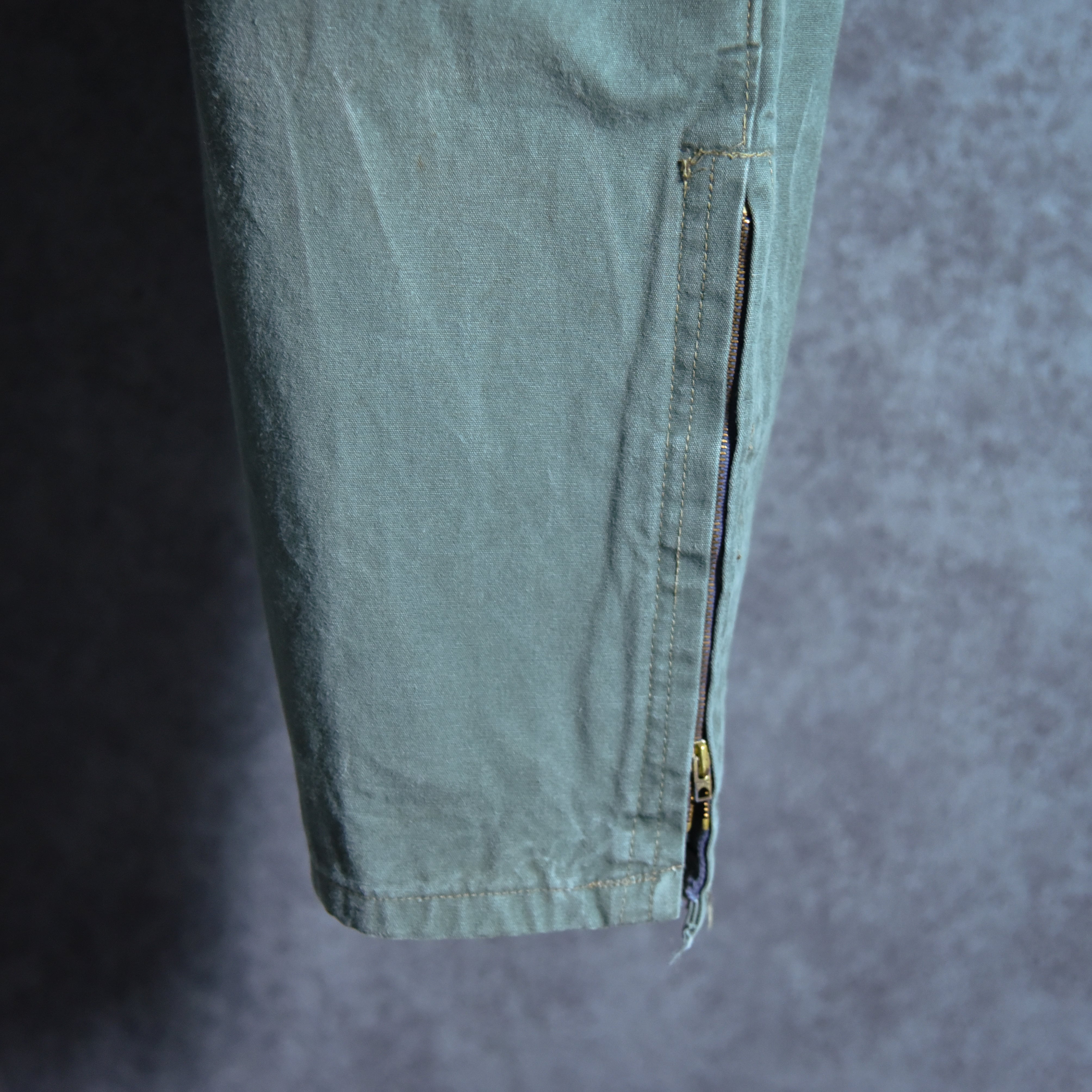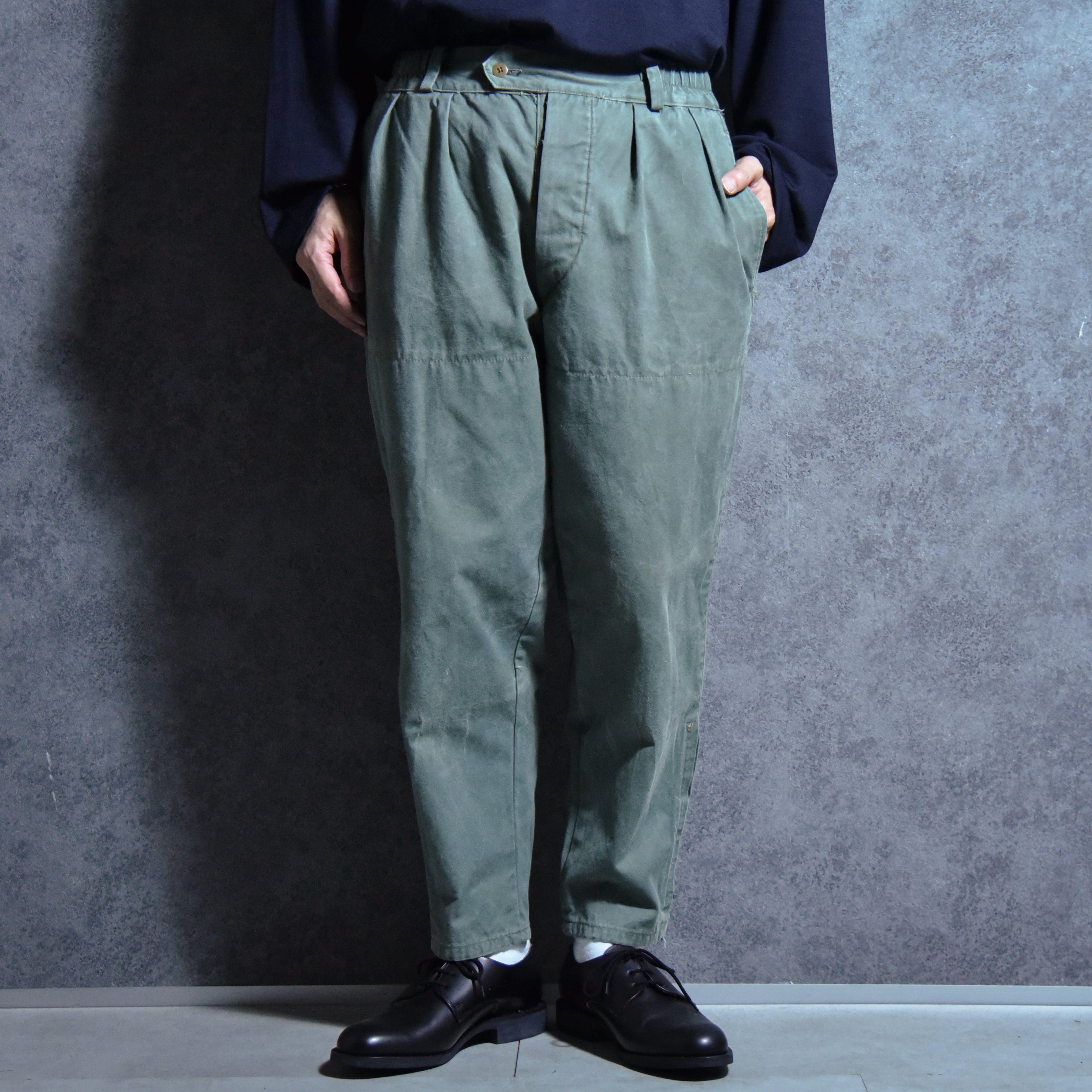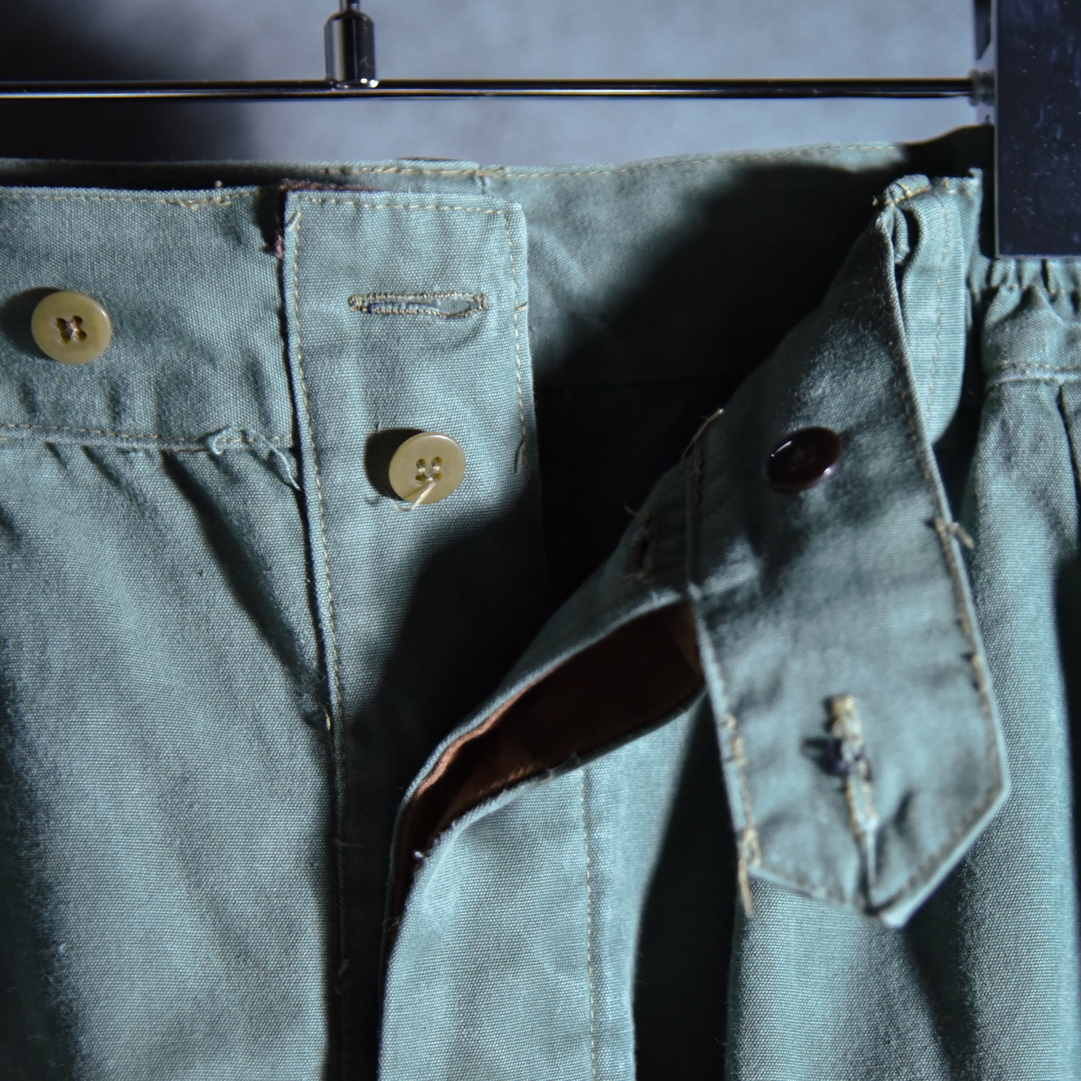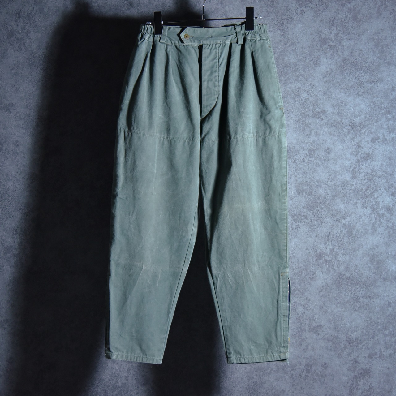 テーパードの効いたシルエットのパンツはワタリ部分にステッチが入っており、裏に当て布がついておりニーパッチの役割ですが裾はフラしているので下部にはステッチが入らないようになっている他、タック入りのウエスト周りは一部ゴムが仕様されているなど、この年代で考えるとかなり珍しい仕様が散りばめらています。