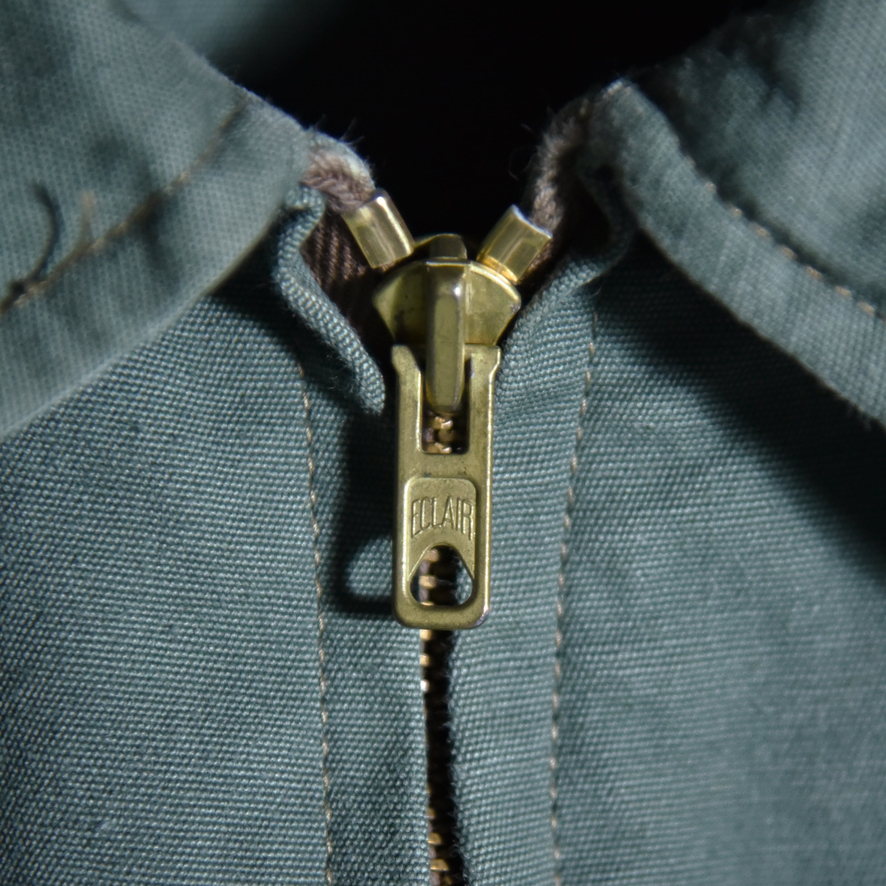 高密度に織り上げられた平織りコットン、フロントにはフラップ付のポケット、ユーロヴィンテージではお馴染みのエクレアジップ(ECLAIR ZIP)、後ろ見頃はボタン付きのゲームポケットが配置されています。