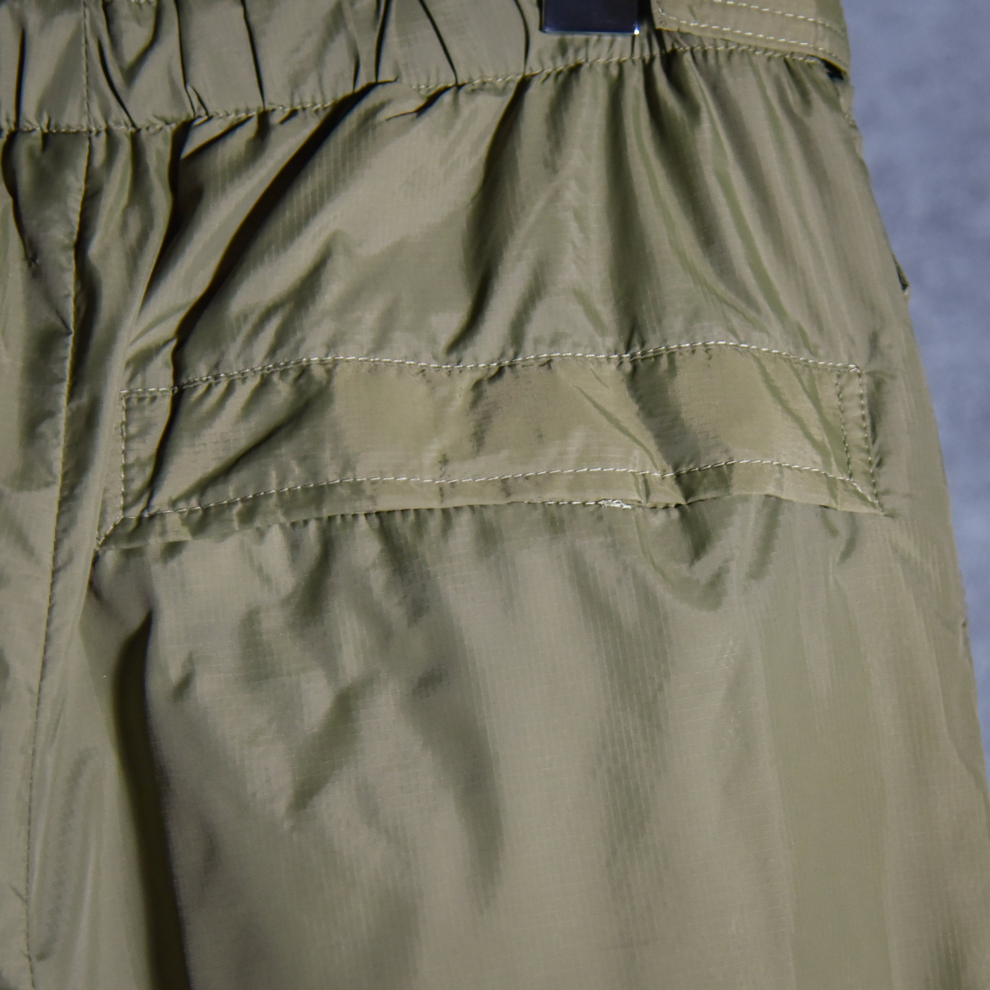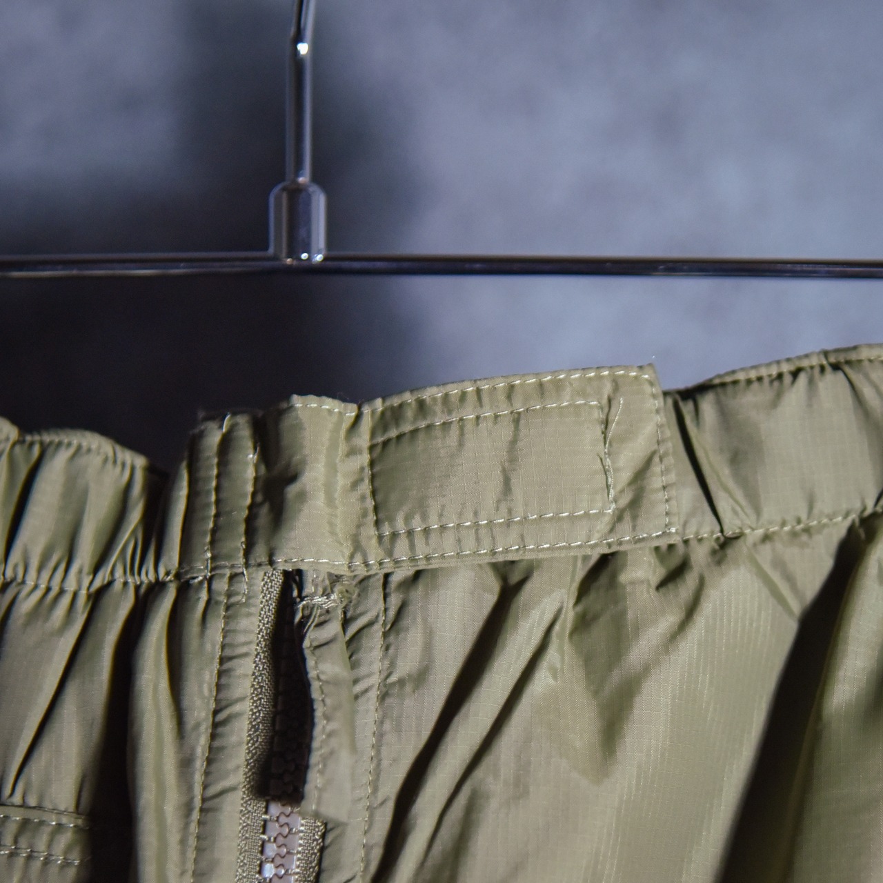 ウエストはゴムが入りベルクロのアジャスターでも調節可能で、裾もベルクロで締められる仕様に、また、本来はヒップポケットが一つのみでサイドは貫通ですが、袋布を付けるリメイクをしているため、サイドもポケットとして使える実用的な作りにしています。