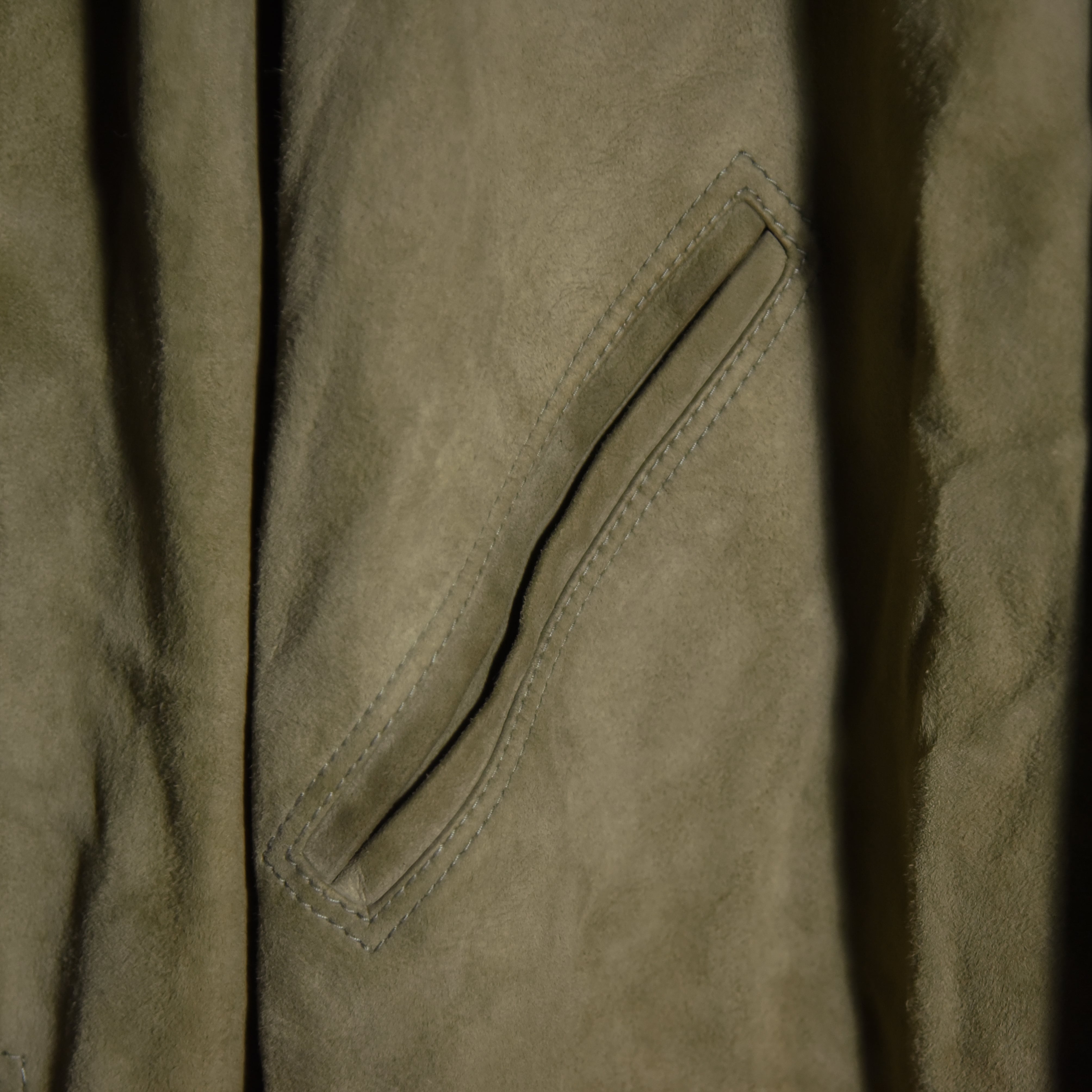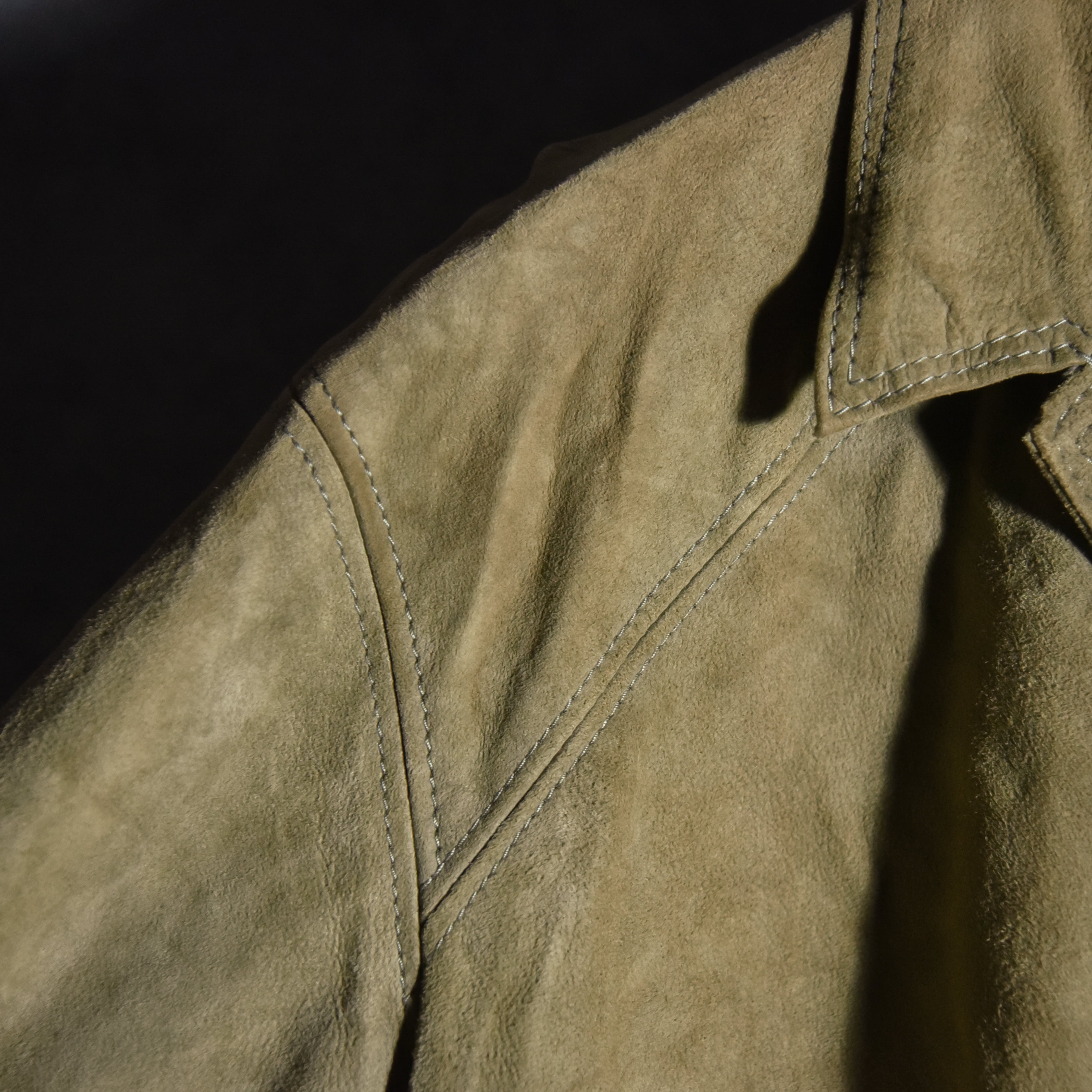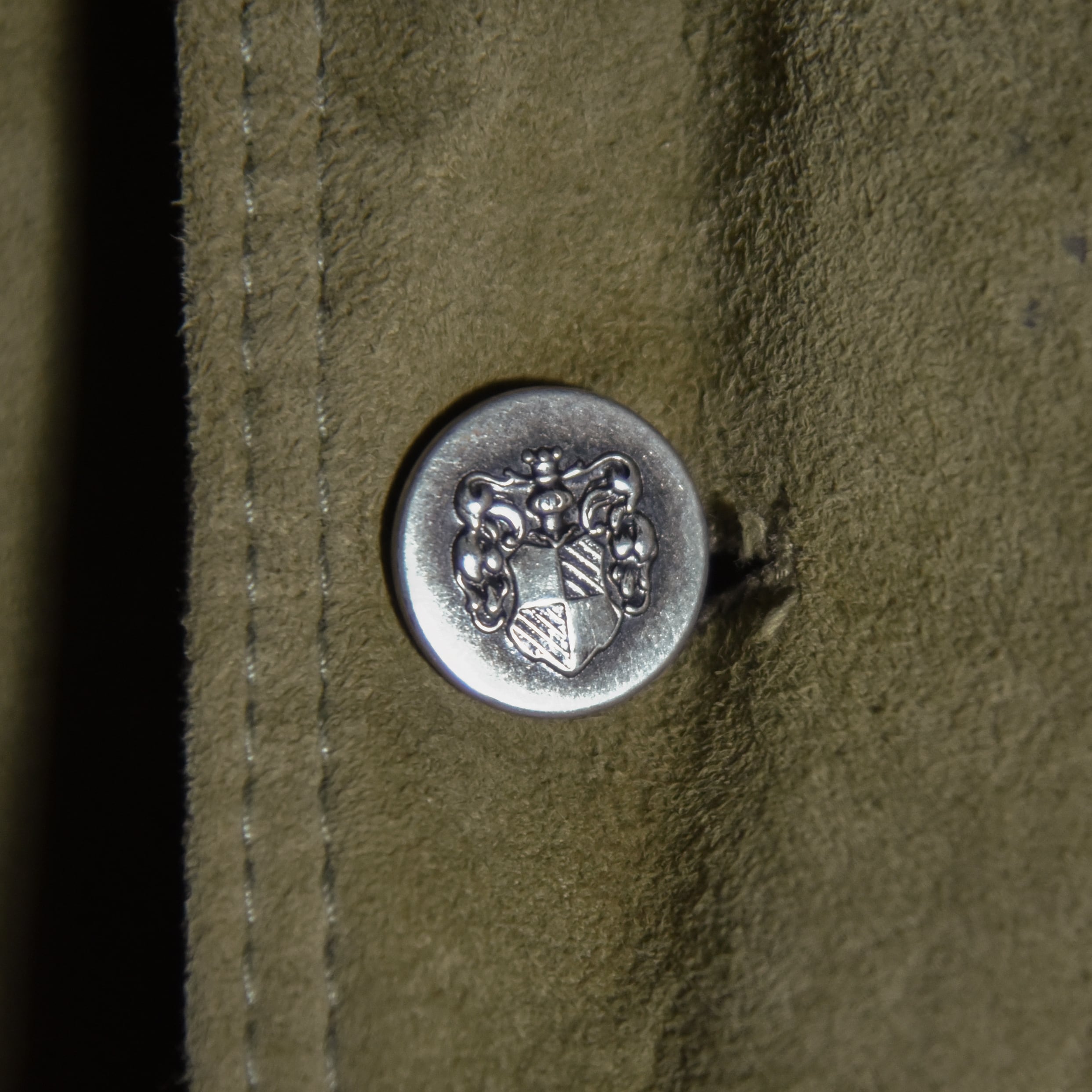 オープンカラーの内側に色移りを軽減するため首元だけスムースレザーに切り替えた意匠や、紋章の入ったボタン、袖口のタブや肩の切り替えステッチも独特で、全体的にはシンプルながら丁寧な仕事とセンスのいいデザイン性が見て取れる名品です。