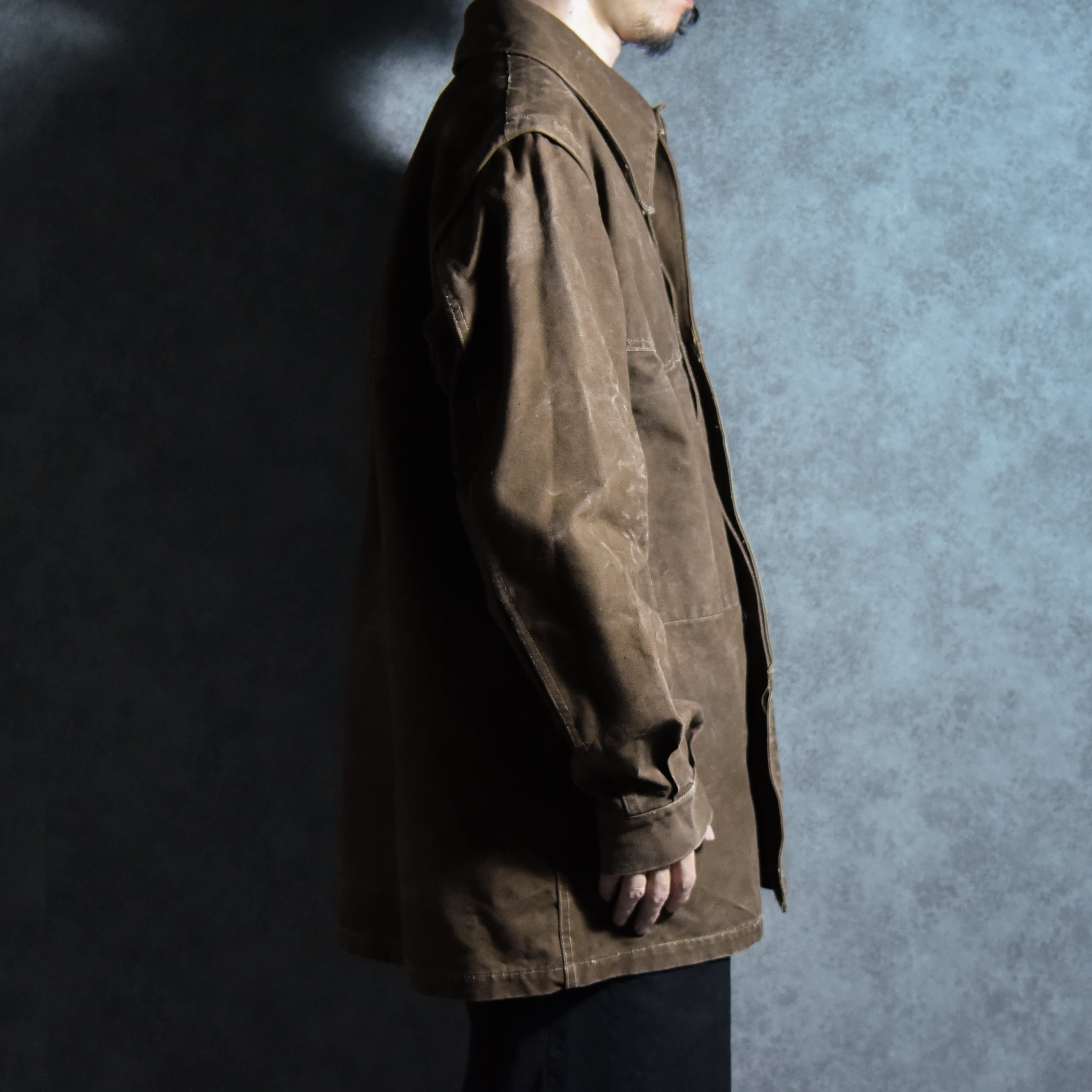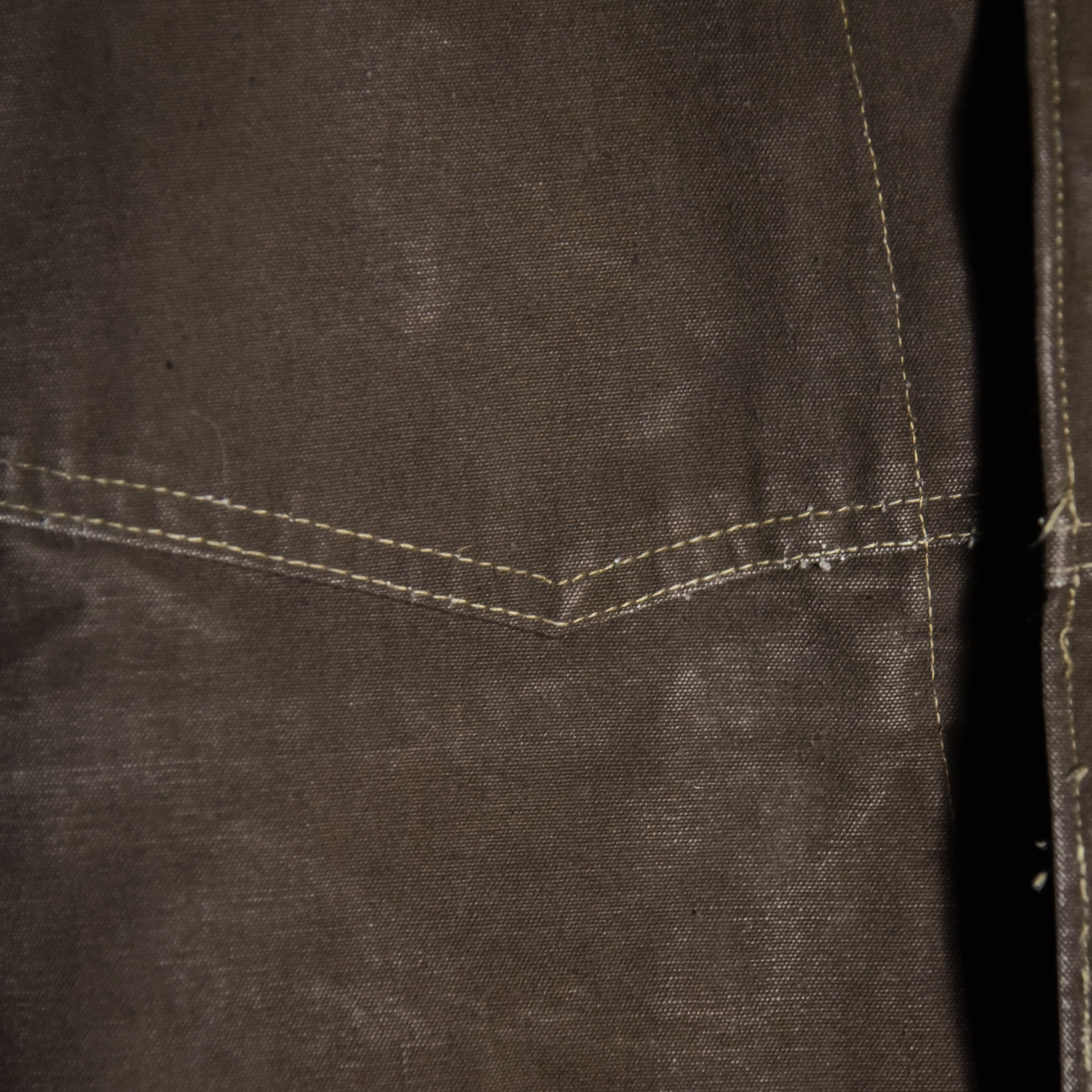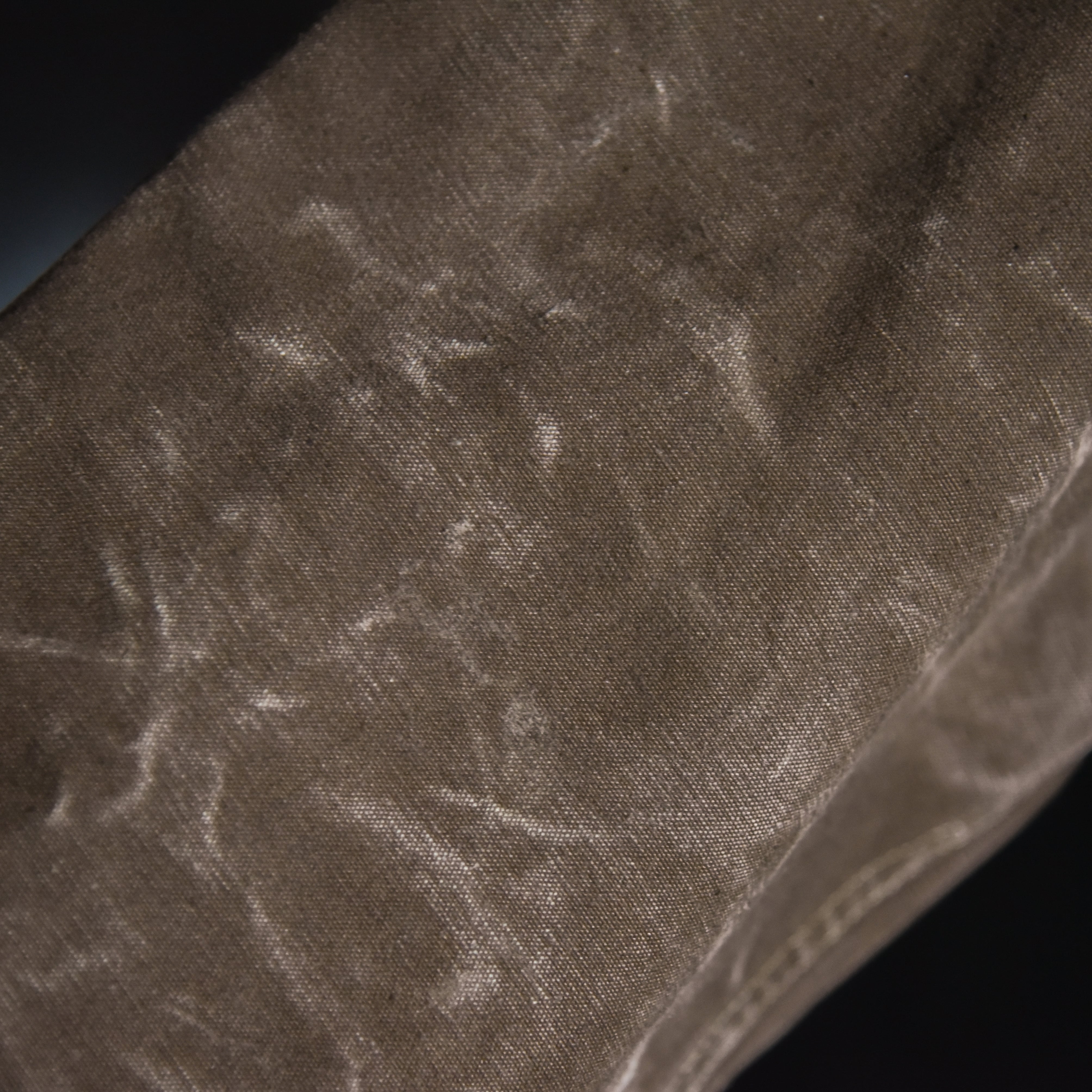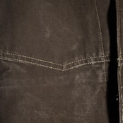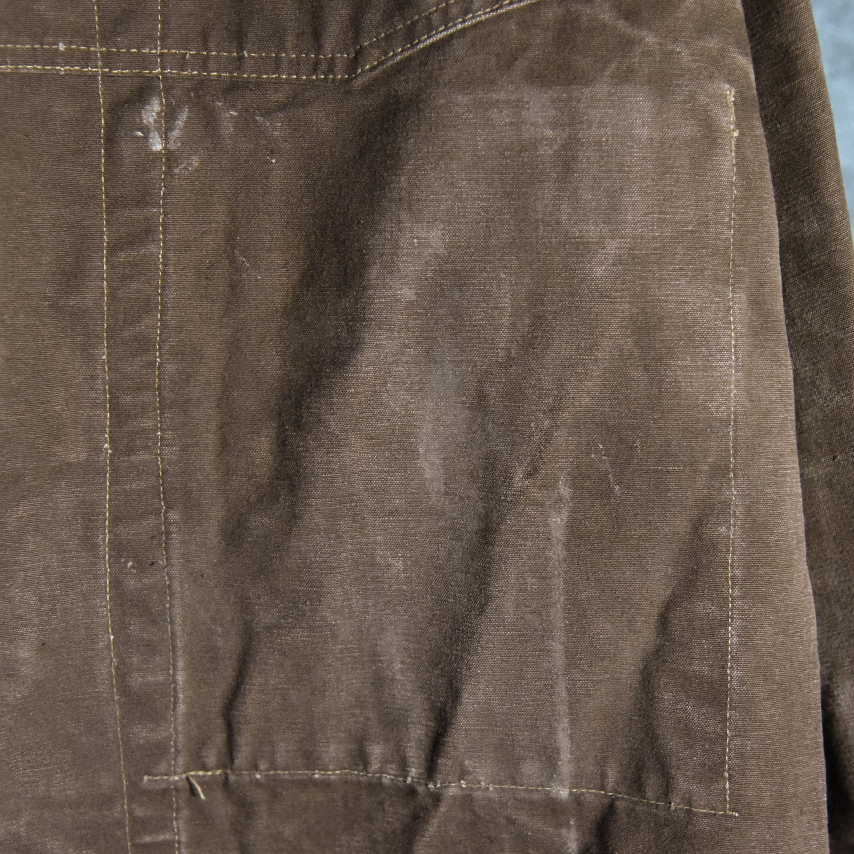 素材はコットンダックで本来はオイルドですが、オイルはほぼ抜けきっているためベタつきはなく、チョークマークや多少の汚れはあるものの、ダメージはほとんどない着やすい素材に経年変化しています。