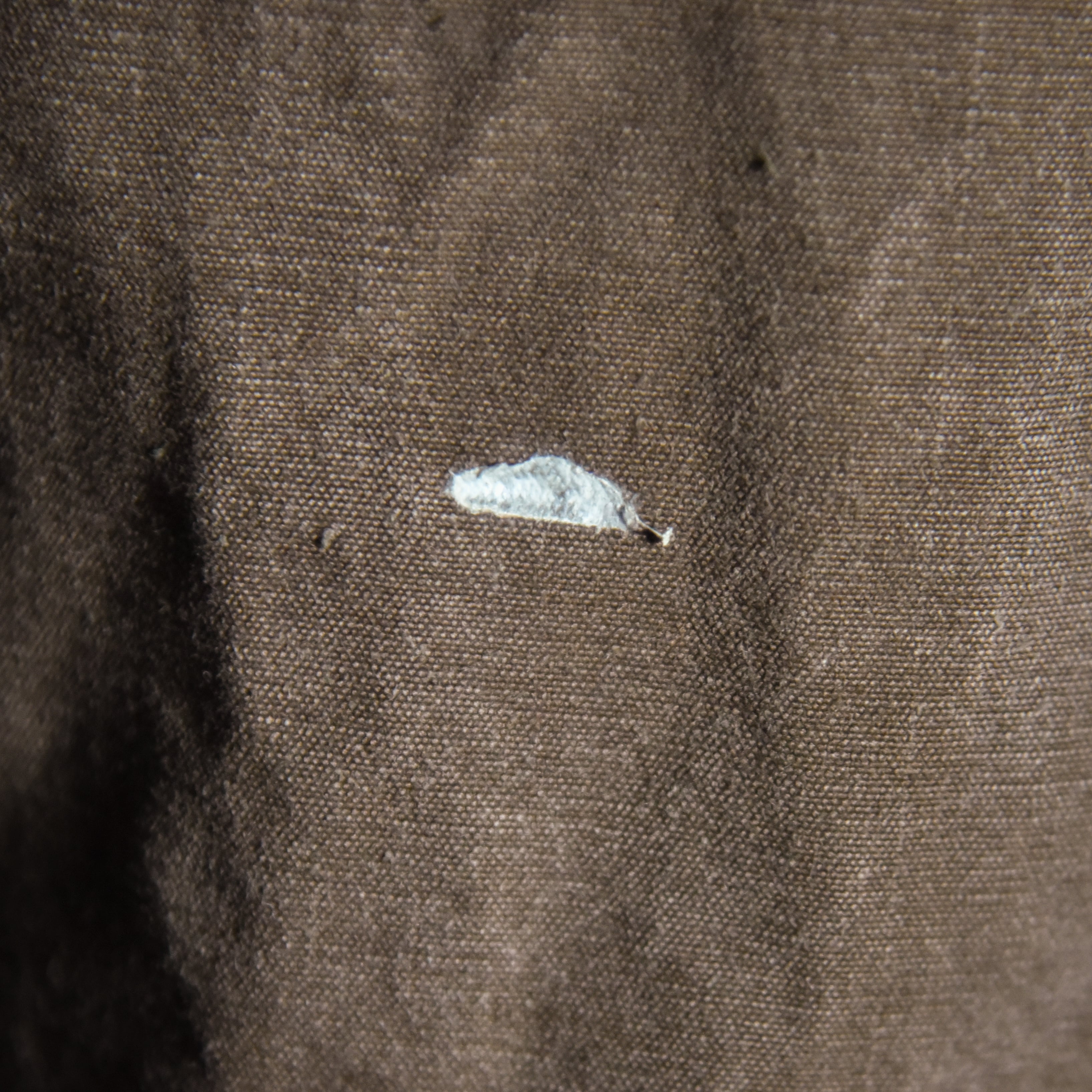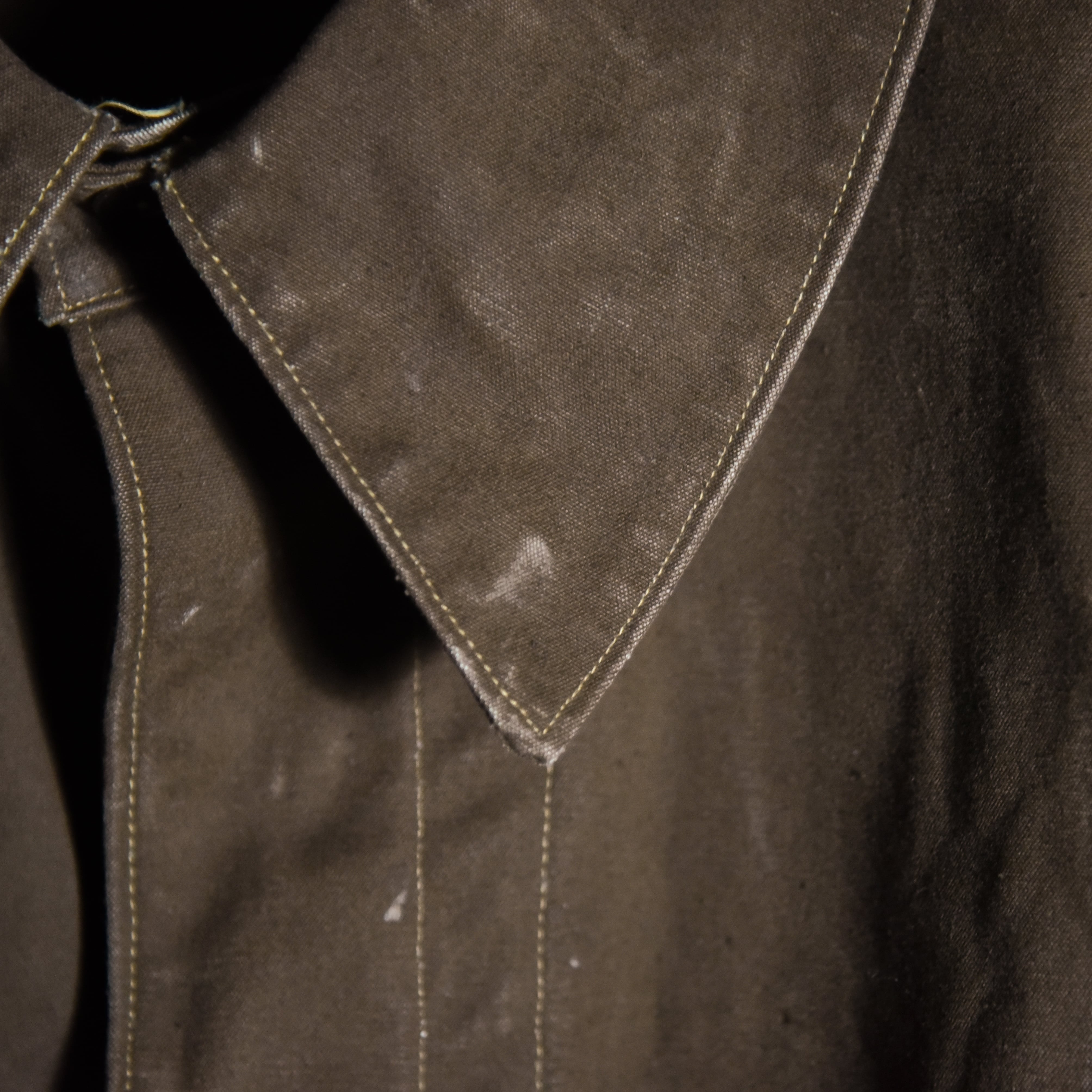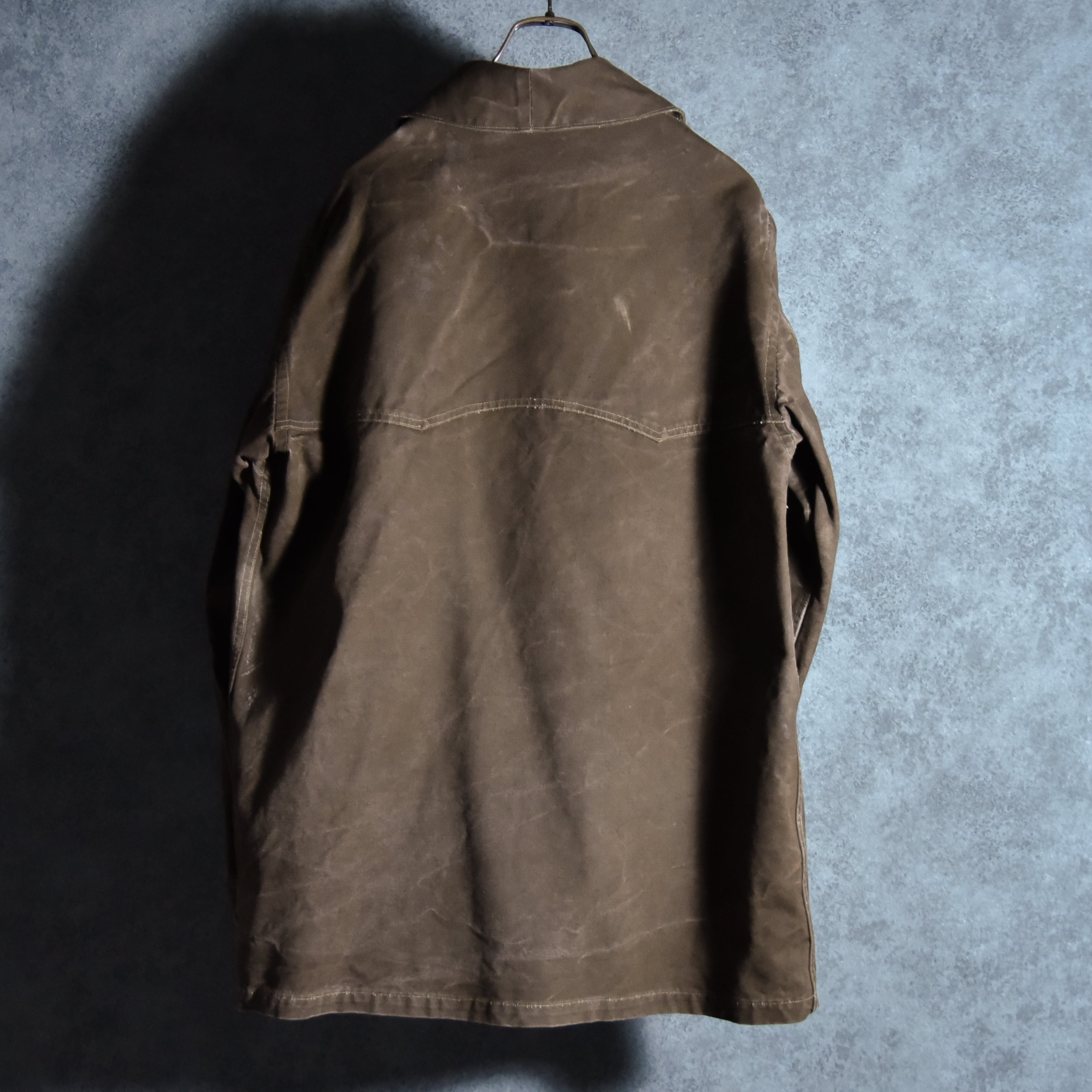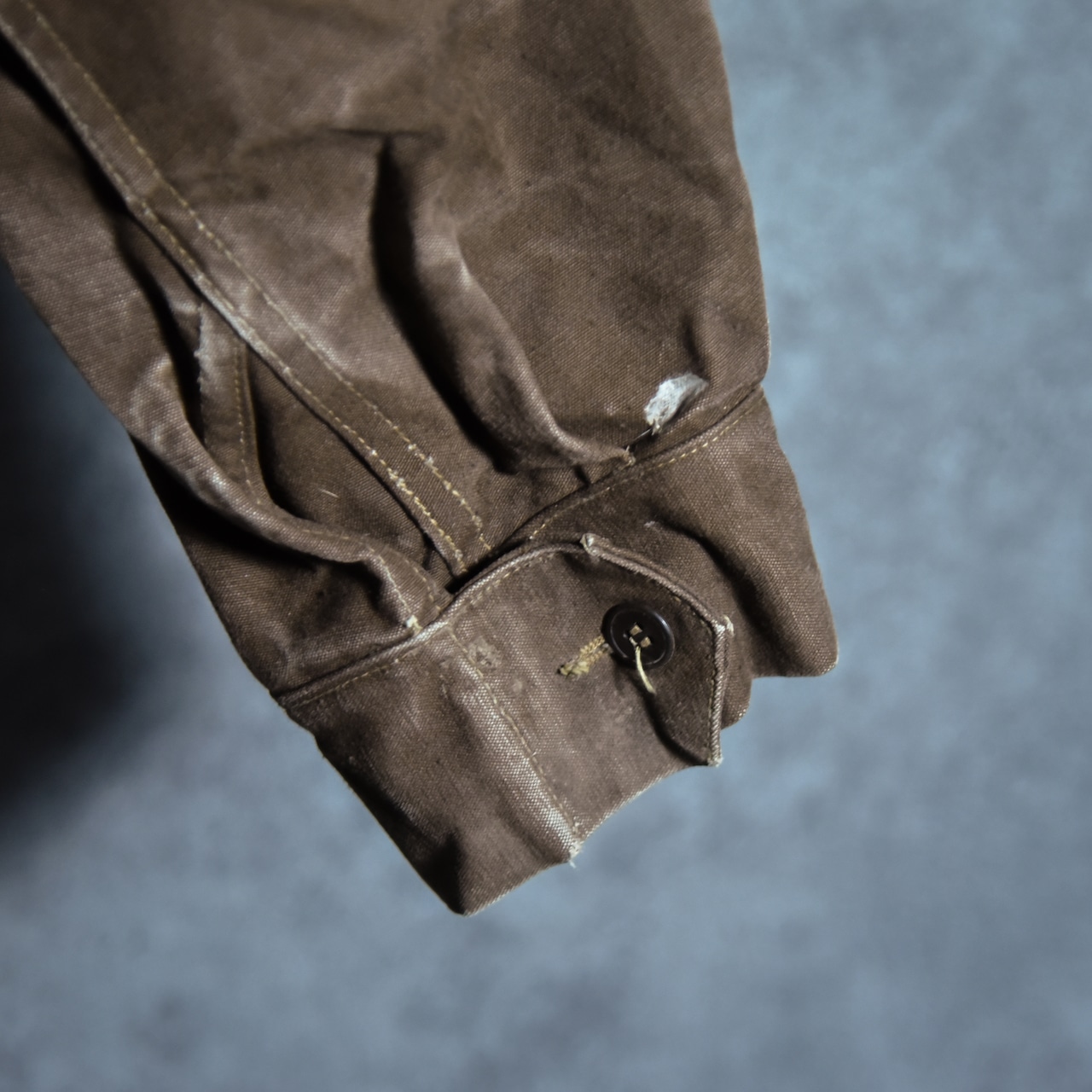 素材はコットンダックで本来はオイルドですが、オイルはほぼ抜けきっているためベタつきはなく、チョークマークや多少の汚れはあるものの、ダメージはほとんどない着やすい素材に経年変化しています。